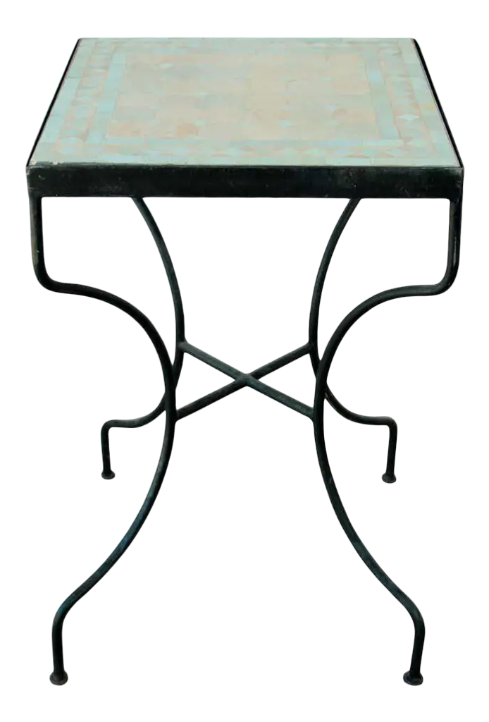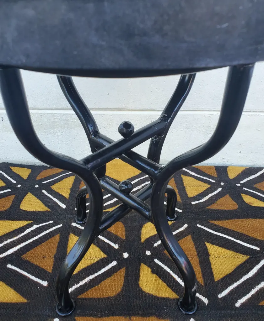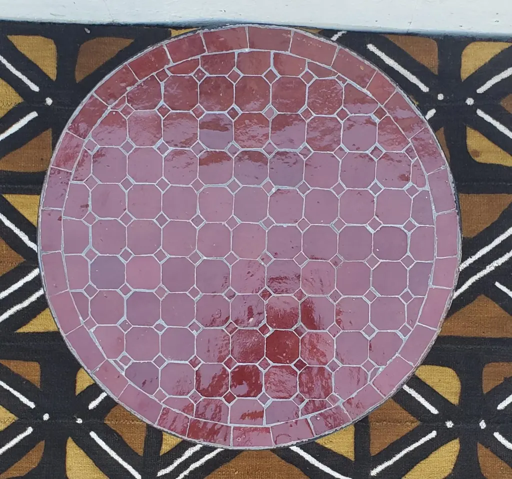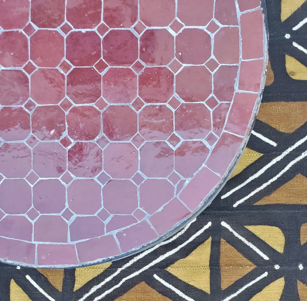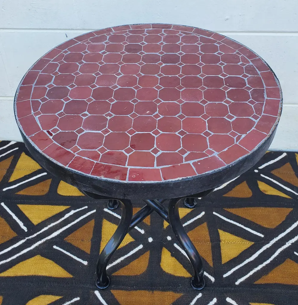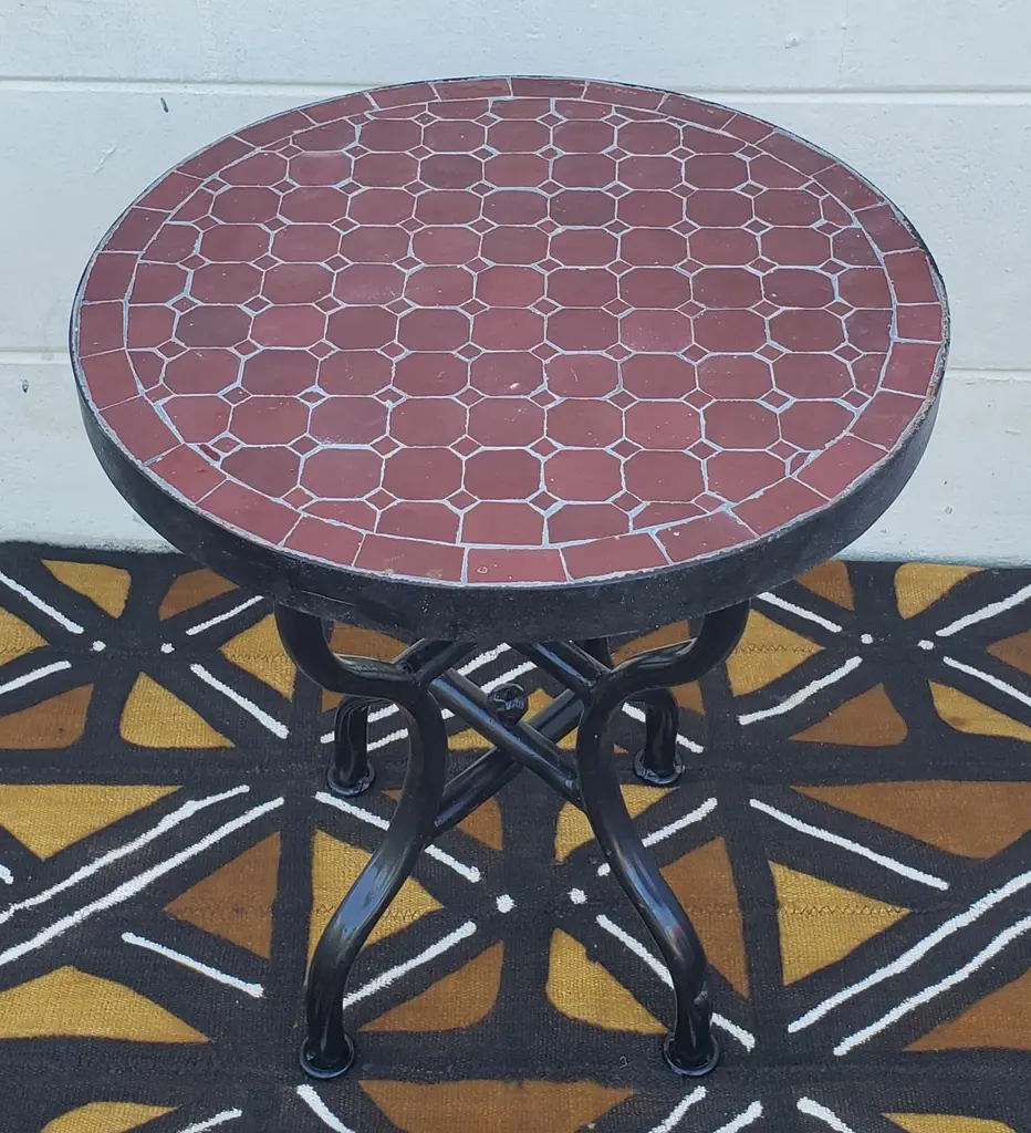 All Burgundy Mini Moroccan Mosaic table, measuring 16" in diameter, and 18" in height. Comes with a wrought iron folding base. Great for use on a deck, between low chairs, as an accent accessory, or any other way you like. Also available in other colors Please contact us if you have any questions. Thank you !! The subtle variations and small flaws in a handmade item are what give it a unique personality and undeniable charm. Mosaic tables and Mosaic fountains are our specialty. We have many to choose from. Different sizes, shapes, and colors are available in stock. Please contact us if you don't see what you are looking for. Following many clients' suggestions, most iron bases and table top rims are rustic and roughed up. If you want them to be nice and clean in a flat black finish, please let us know.