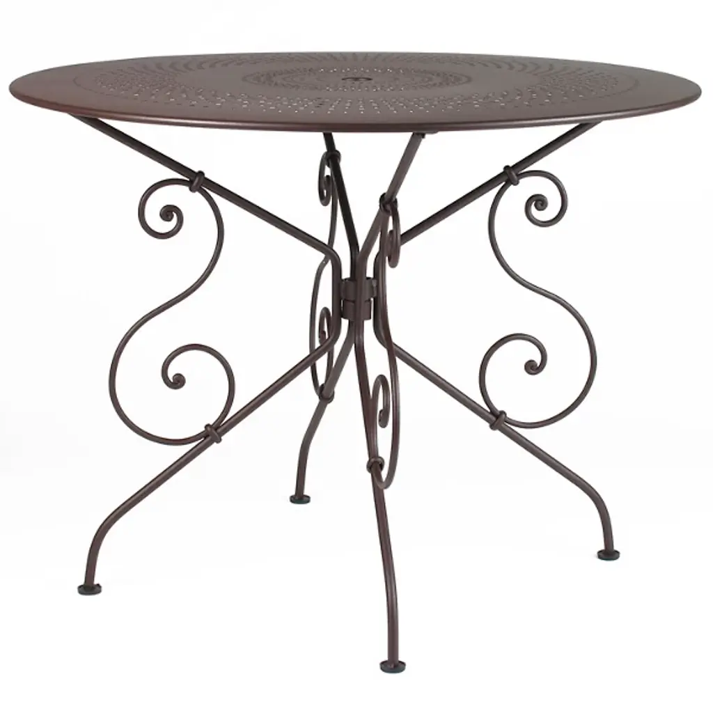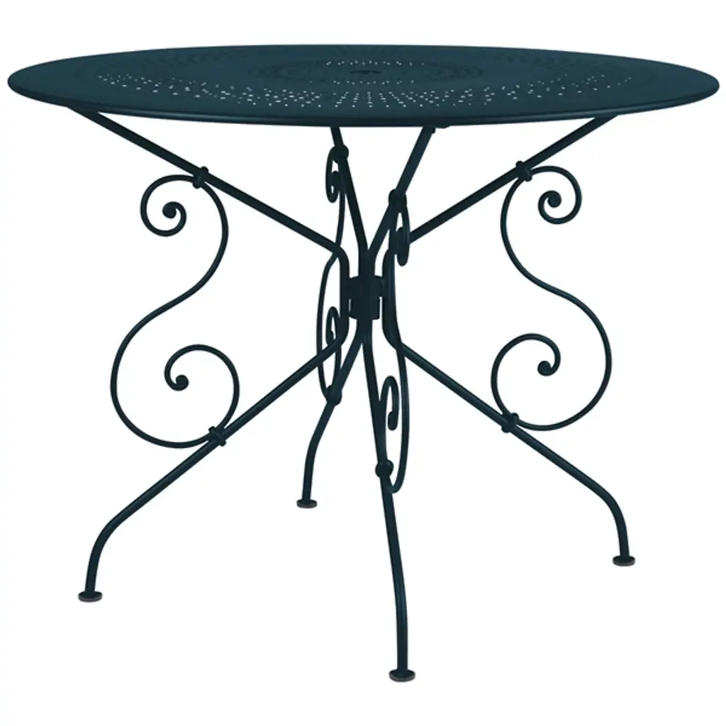 Bring some of the romance of early 20th century French gardens to yours with the Fermob 1900 Table. It is a curvaceous, elegant design, with the various scrolls and rings of the steel rod frame hand-forged by a blacksmith in France. The intricate, lacy perforations around the sheet steel top add decorative interest without compromising the table's strength.