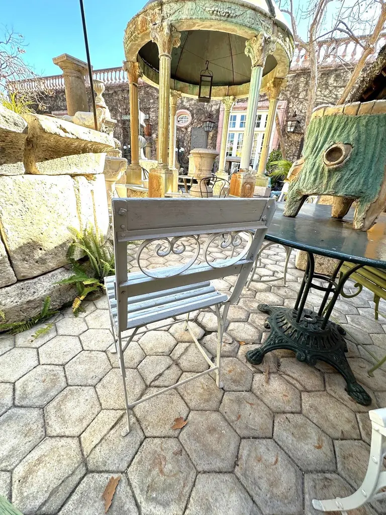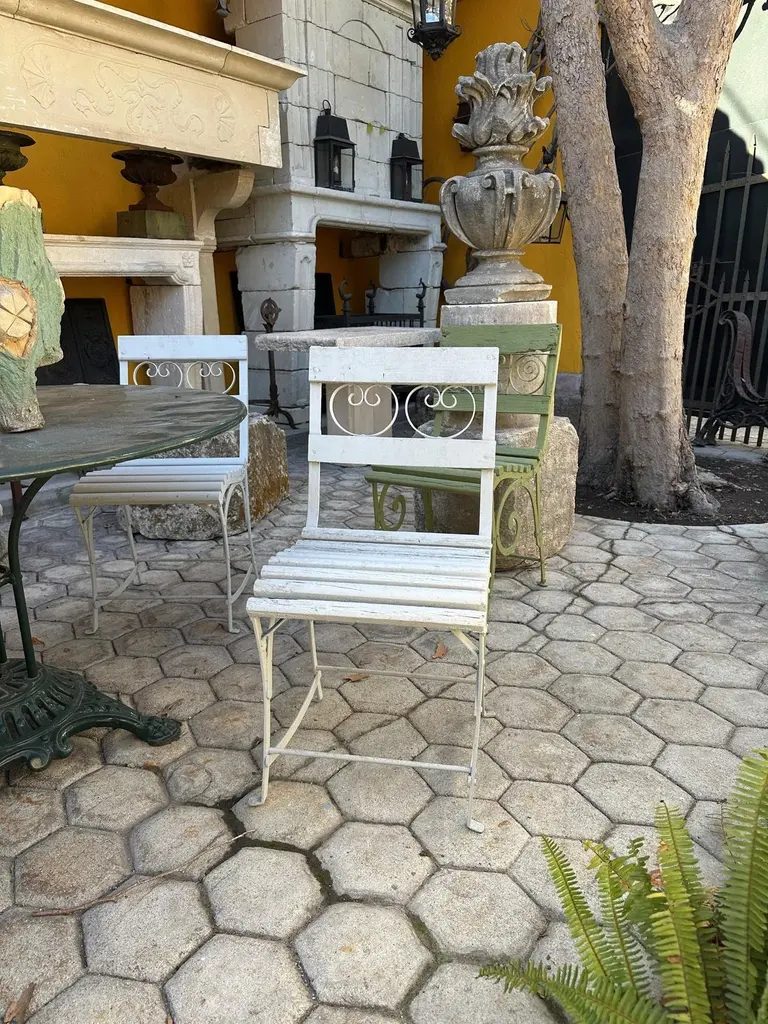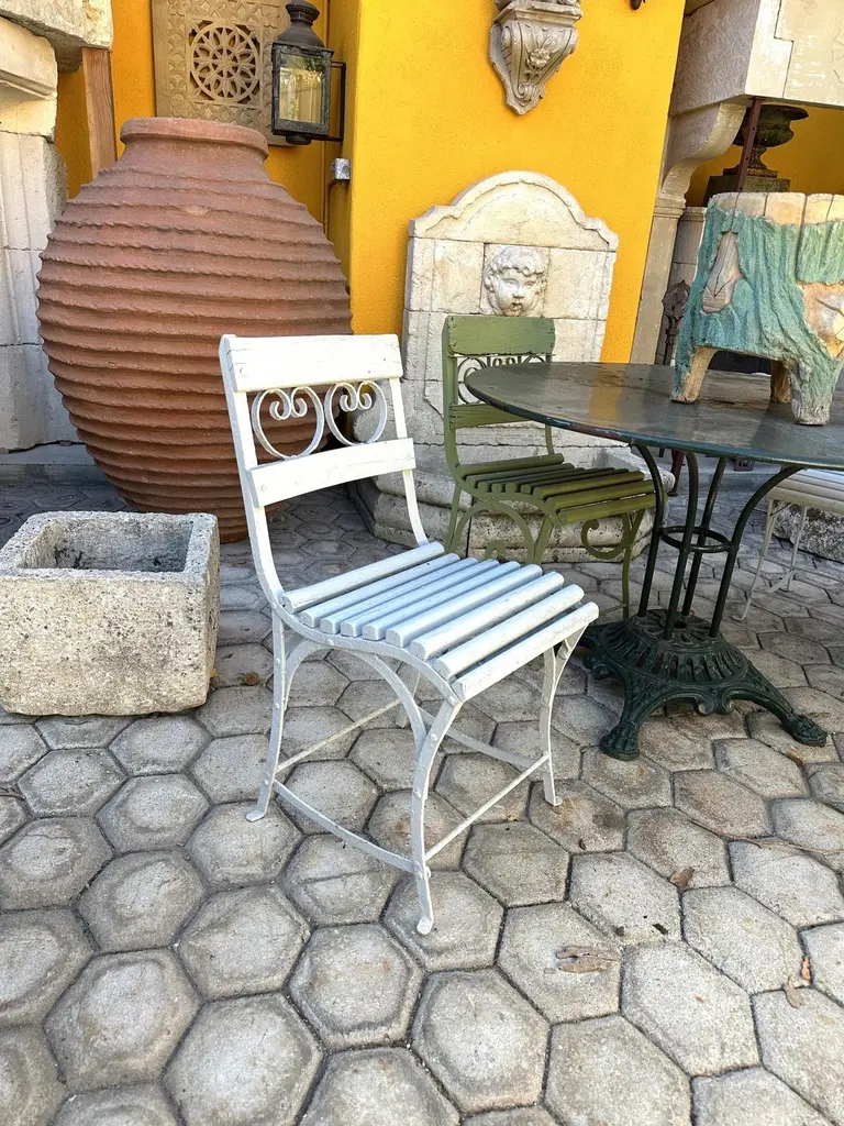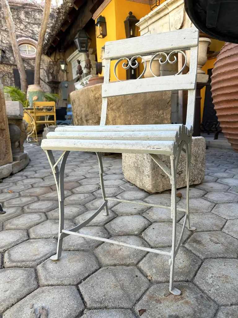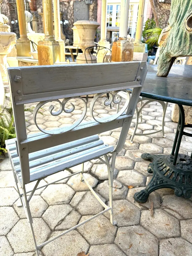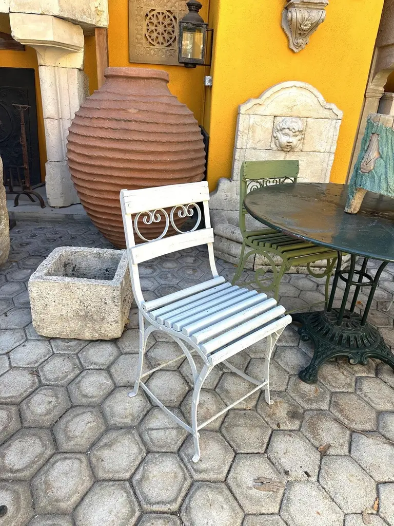 19th Century Side Handmade Garden Table Chairs Furniture Iron & Wood Antique, LA . Beautiful late 1800’s side garden patio Iron Metal and carved wood chairs with old paint furniture , from the Hippodrome horse racing track located in Paris , France . We have them in 3 colors, yellow, gray and blue . The chairs would be the perfect addition to your outdoor garden area to add a touch of history elegance color and charm . Antique dealer Los Angeles CA West Hollywood Melrose Ave La Cienega Blvd. In a Rustic Farm or a traditional design . Garden furniture by an outdoor fireplace or next to a gueridon round coffee table . Under a pergola, by the pool, to sit and have your morning Coffee, these chairs were made to sit comfortably and not only for the good looks. It’s the end of the line, and a rare find. A great addition to your special collection of historical artifacts and objects. Very decorative, as well as functional. For your interior Design or landscape design . A Great and special gift idea for a house warming . they could be used in a bathroom as a towel rack or a chairs around the kitchen Provencal Table , in a winery to sit relax and unwind. Some of the wood pieces been replaced over the decades as you can see in the pictures , of course the paint would every now and then be refreshed. Signs of the decades is apparent, but they are very sturdy and stable to sit on. Approximate Dimensions: Height: 32.5 in (82.55 cm)Width: 15.75 in (40.01 cm)Depth: 19 in (48.26 cm)Seat Height: 17.75 in (45.09 cm)Materials and Techniques: Iron,Wood,Hand-CraftedPlace of Origin: FrancePeriod: 19th CenturyDate of Manufacture: 1800sCondition: paint was refreshed in pictures. Good Repaired: as seen in pictures. Wear consistent with age and use. as seen in the pictures. The main picture prior to being painted, the rest of the pictures are as of jan 15 2025