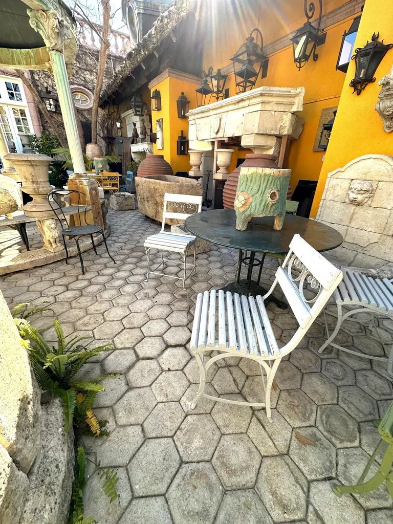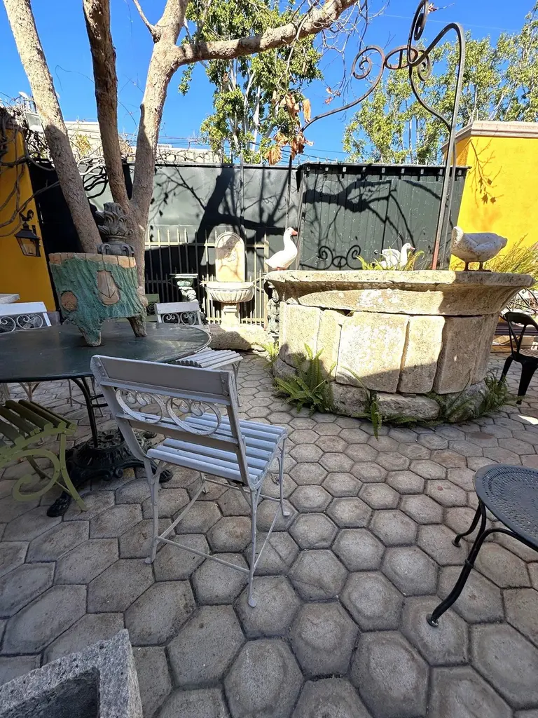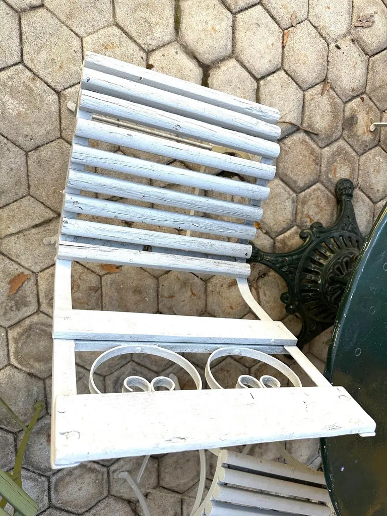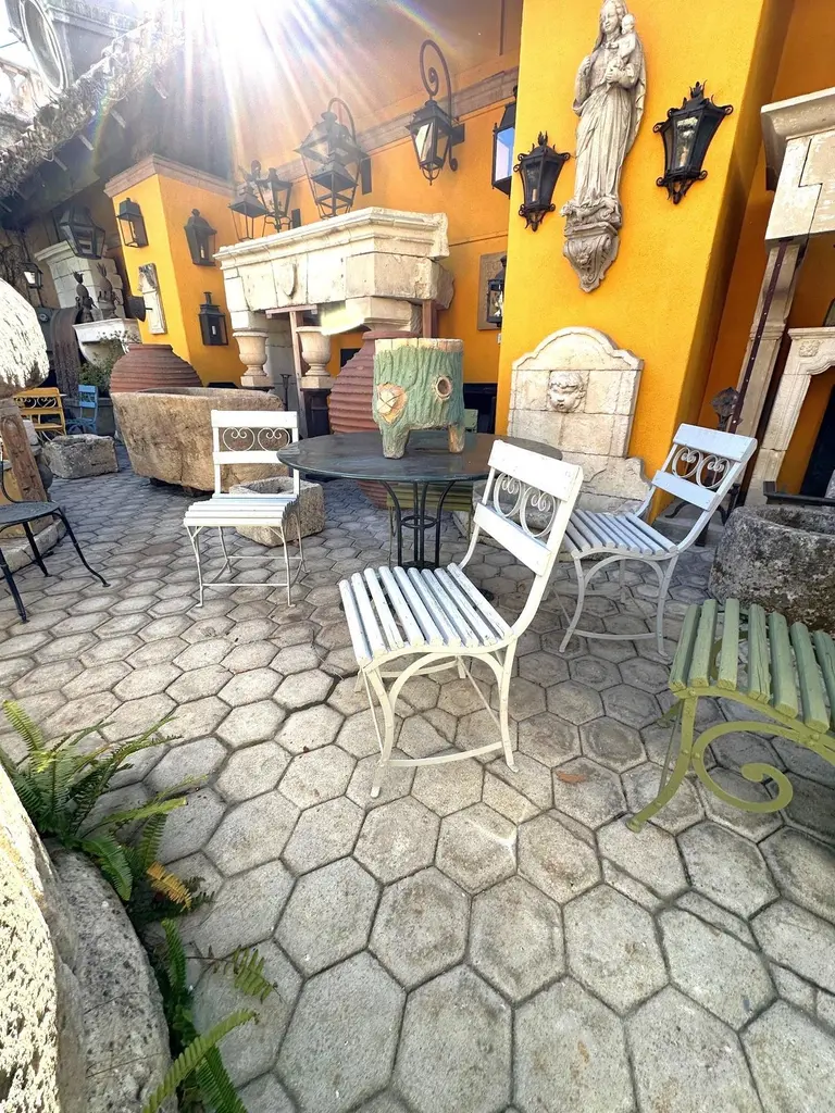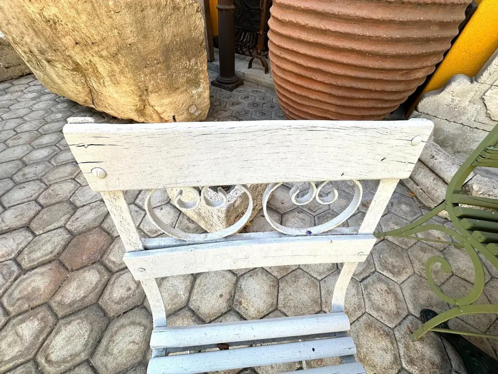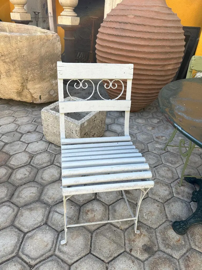 19th Century Side Handmade Garden Table Chairs Furniture Iron & Wood Antique, LA . Beautiful late 1800’s side garden patio Iron Metal and carved wood chairs with old paint furniture , from the Hippodrome horse racing track located in Paris , France . We have them in 3 colors, yellow, gray and blue . The chairs would be the perfect addition to your outdoor garden area to add a touch of history elegance color and charm . Antique dealer Los Angeles CA West Hollywood Melrose Ave La Cienega Blvd. In a Rustic Farm or a traditional design . Garden furniture by an outdoor fireplace or next to a gueridon round coffee table . Under a pergola, by the pool, to sit and have your morning Coffee, these chairs were made to sit comfortably and not only for the good looks. It’s the end of the line, and a rare find. A great addition to your special collection of historical artifacts and objects. Very decorative, as well as functional. For your interior Design or landscape design . A Great and special gift idea for a house warming . they could be used in a bathroom as a towel rack or a chairs around the kitchen Provencal Table , in a winery to sit relax and unwind. Some of the wood pieces been replaced over the decades as you can see in the pictures , of course the paint would every now and then be refreshed. Signs of the decades is apparent, but they are very sturdy and stable to sit on. Approximate Dimensions: Height: 32.5 in (82.55 cm)Width: 15.75 in (40.01 cm)Depth: 19 in (48.26 cm)Seat Height: 17.75 in (45.09 cm)Materials and Techniques: Iron,Wood,Hand-CraftedPlace of Origin: FrancePeriod: 19th CenturyDate of Manufacture: 1800sCondition: paint was refreshed in pictures. Good Repaired: as seen in pictures. Wear consistent with age and use. as seen in the pictures. The main picture prior to being painted, the rest of the pictures are as of jan 15 2025