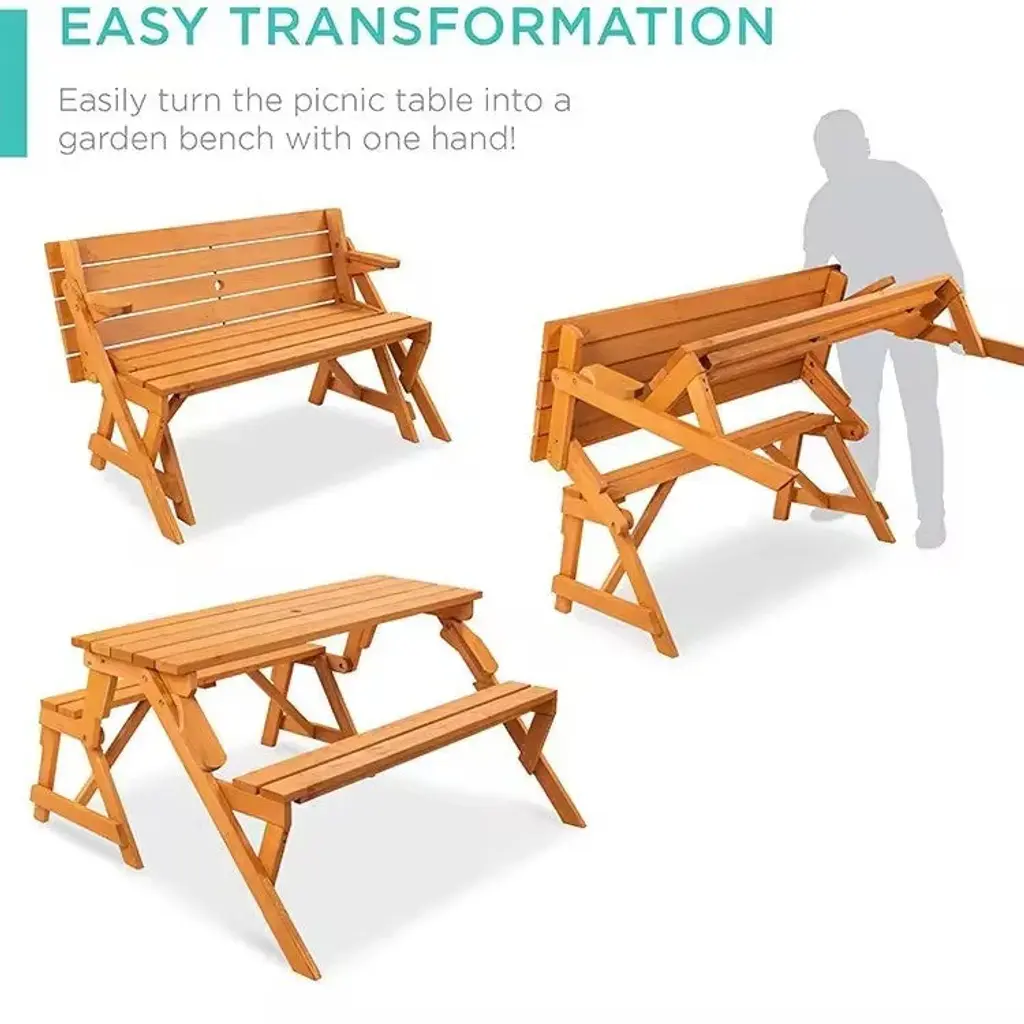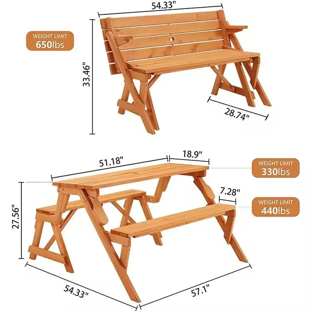 Easily converts from a table to a bench and back again in only seconds! Sturdy yet compact construction allows for easy transport from one spot to another. Picnic table comfortably seats four while the bench is perfect for two or three. Made of high-quality Canadian Hemlock hardwood. Compact design perfect for kids of all ages! Picnic Table Overall Dimensions 54.33"L X 57.1"W X 27.56" H Seats: 51"L X 7.28"W X 19"H", Top of Table: 51.18"L X 18.9"W, Bench Overall Dimensions: 54.33"L X 28.74"W X 33.46"H, Seats: 51"L X 18.5"W X 19"H, 44lbs.