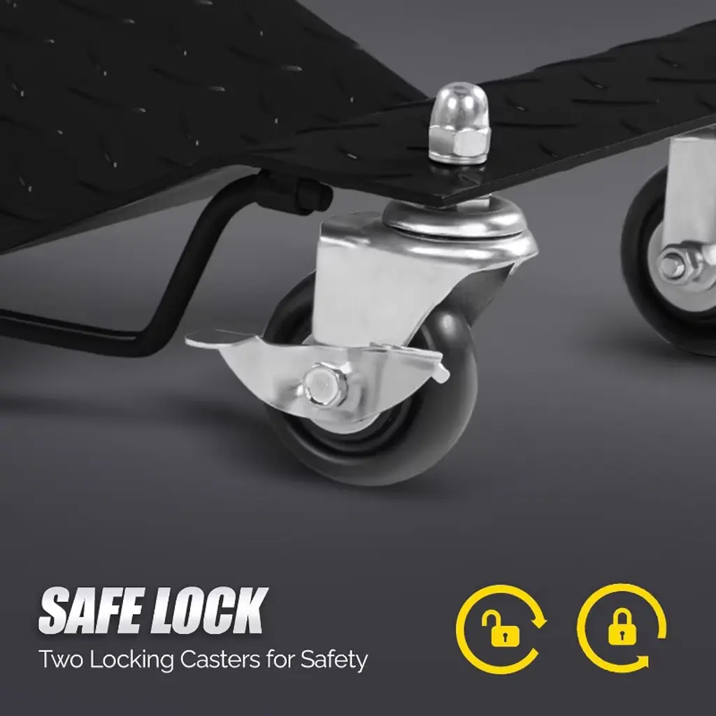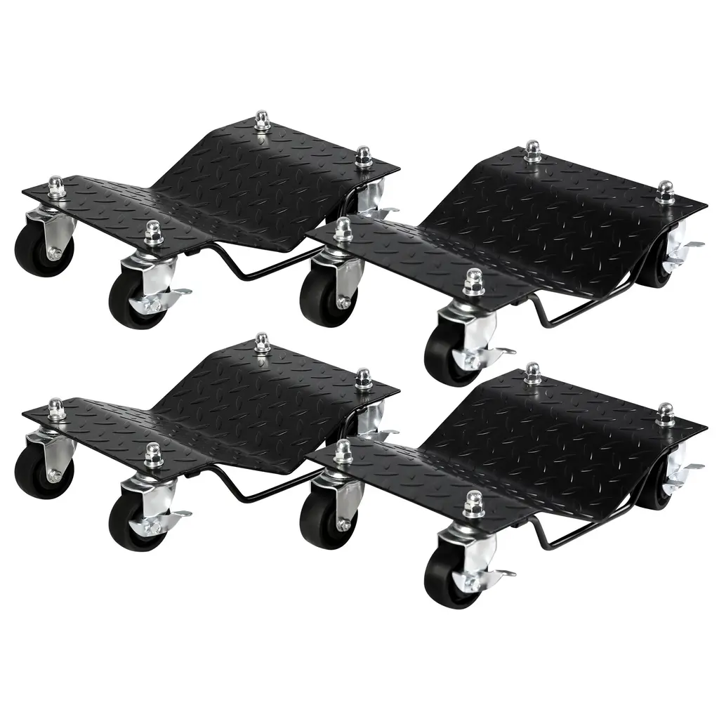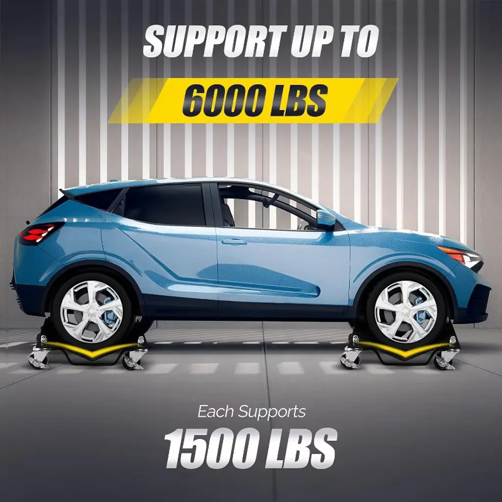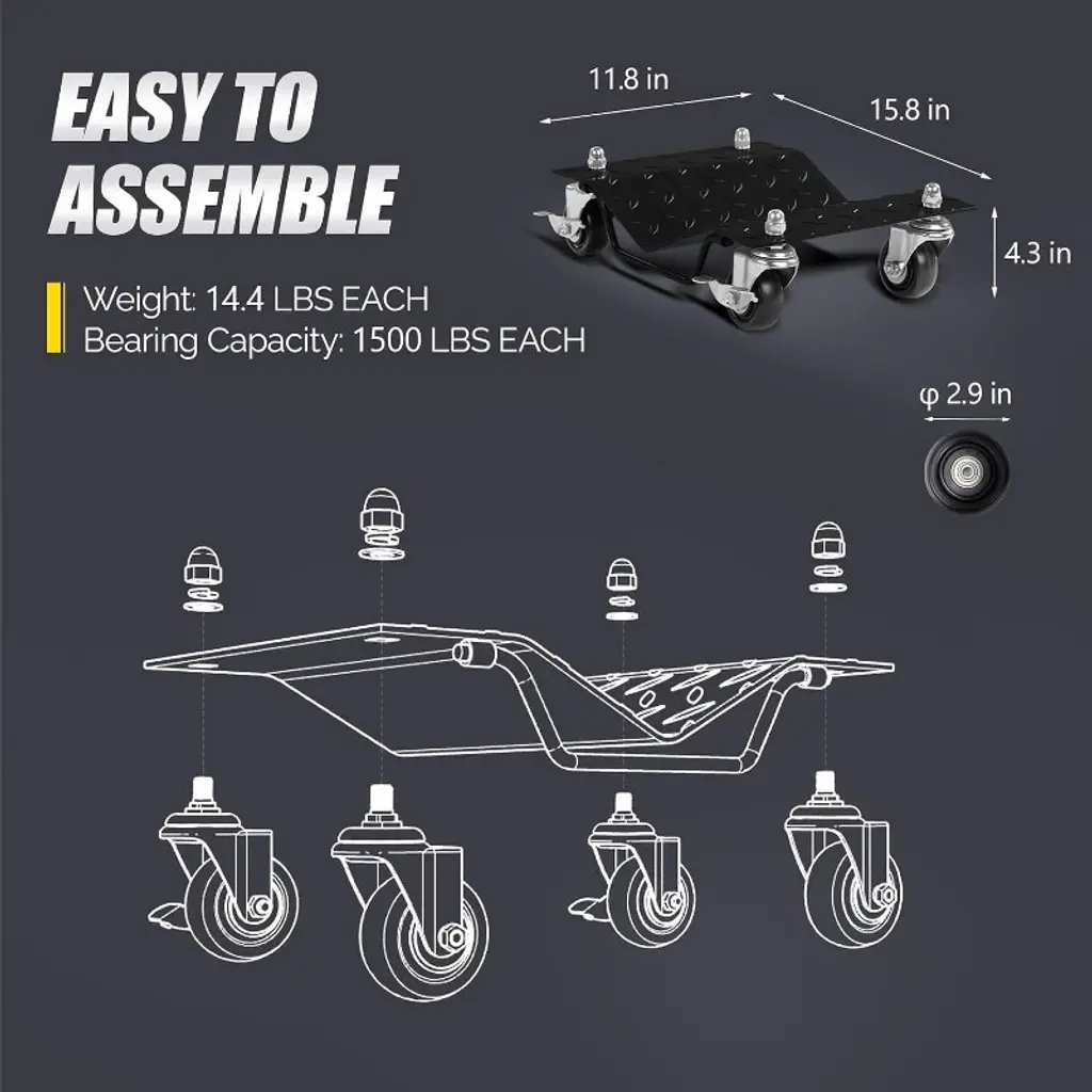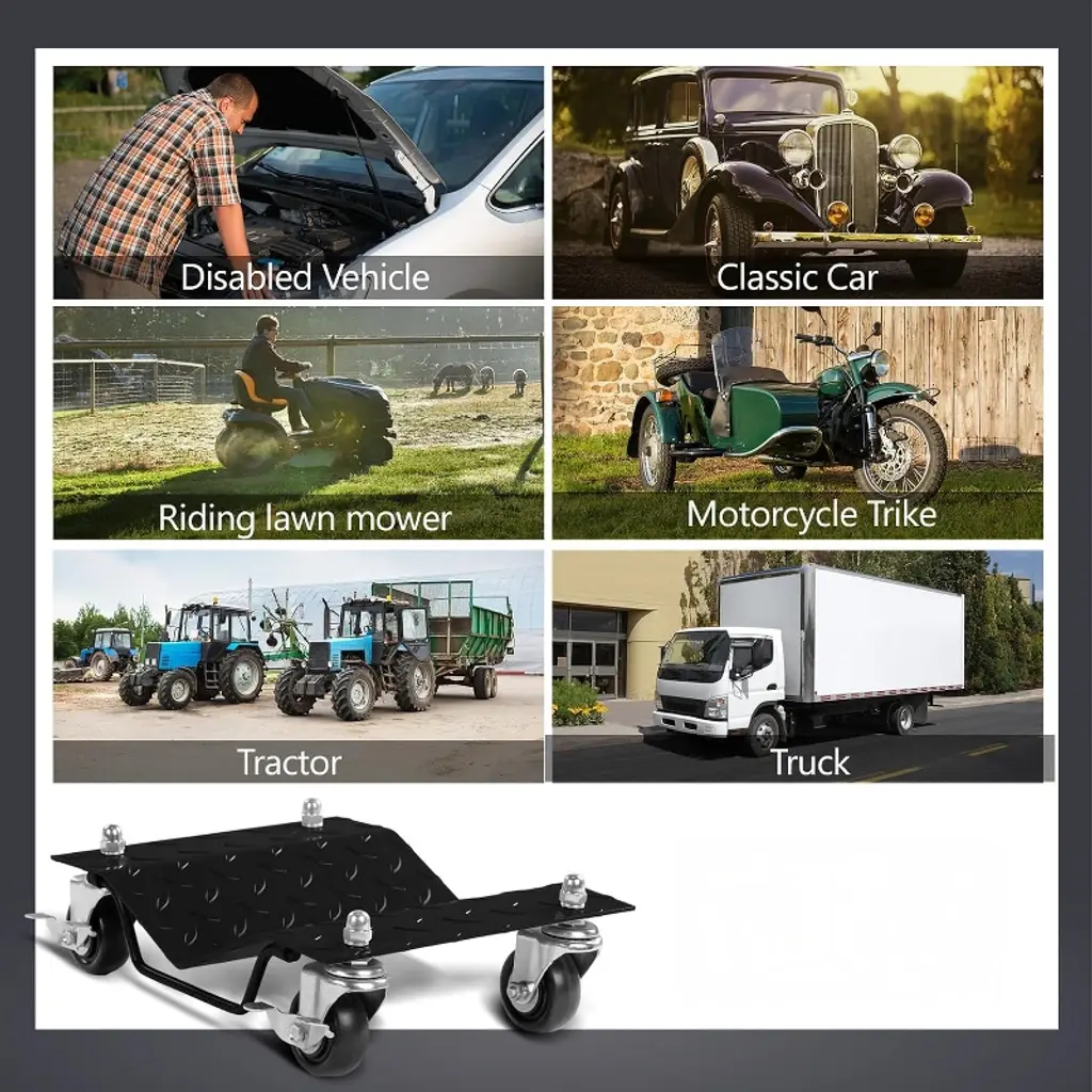 Introducing the 2 Items 4 Tire Wheel Dolly Car, a premium solution for all your vehicle moving needs. Crafted with precision and durability, this tire dolly set is designed to make maneuvering heavy vehicles effortless and efficient. Whether you're a professional mechanic or a DIY enthusiast, our tire dollies are the perfect addition to your garage or workshop.- **[PREMIUM MANGANESE STEEL]**: Engineered from high-quality manganese steel, our tire dolly heavy duty set offers unparalleled strength and durability. This material provides several times the load-bearing capacity of standard carbon steel, ensuring superior performance even when moving larger vehicles.- **[LARGE WEIGHT CAPACITY]**: Each wheel dolly in this set supports up to 2000 lbs, with a combined capacity of 8000 lbs. This makes it ideal for moving medium to heavy vehicles, including SUVs, trucks, and more. With our tire roller, shifting heavy loads becomes a breeze.- **[ANTISKID & RECESSED DESIGN]**: Featuring a unique antiskid and recessed design, our dolly tire set ensures maximum stability and safety. The concave design, complemented by two rows of round head nails, minimizes slipping and keeps your vehicle securely in place.- **[360° ROTATABLE WHEELS]**: Equipped with universal swivel casters, including two quick-stop wheels, these tire lifters provide full mobility in any direction. Rotate your car 180 degrees on flat surfaces with ease, making it perfect for single-person operation.- **[MULTIPLE FUNCTIONS]**: Beyond just cars, our tire lifting tool is versatile enough for use in shops, garages, showrooms, and more. It's perfect for moving trucks, trailers, ATVs, motorcycles, lawnmowers, and even furniture or equipment.- **[CONVENIENT HANDLING]**: Each car tire dolly comes with a convenient handle for easy carrying or hanging, making storage and transport simple and efficient.