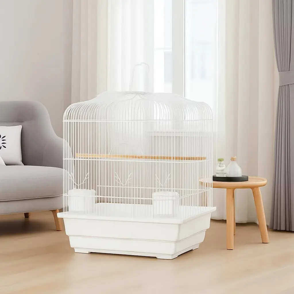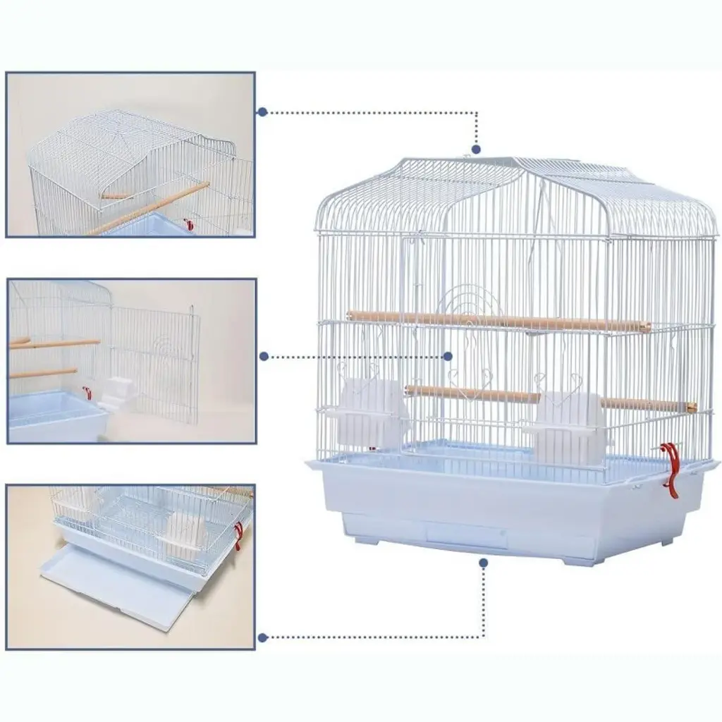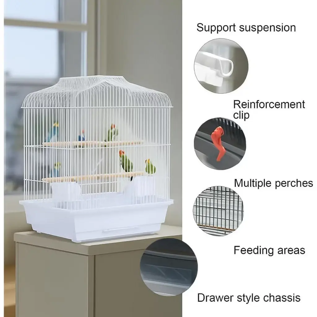 This bird cage comes with 2 transparent plastic boxes, 2 standing rods, a plastic drawer bottom tray, and a swing—perfect for housing small birds like parakeets, canaries, and finches.