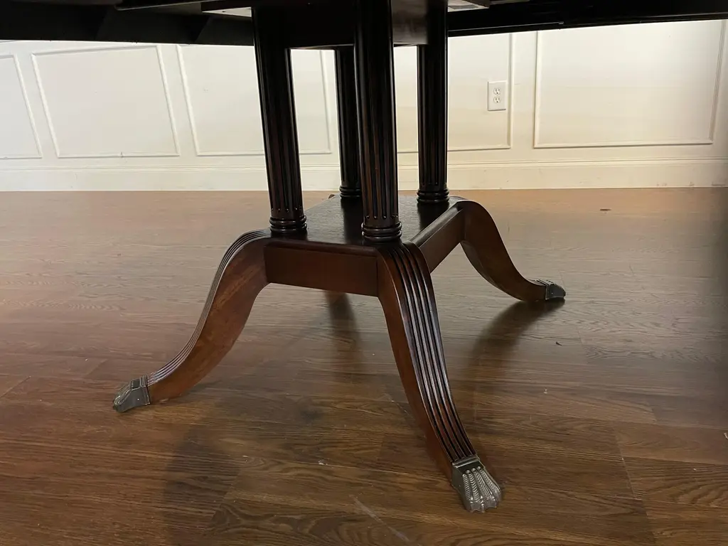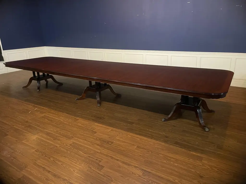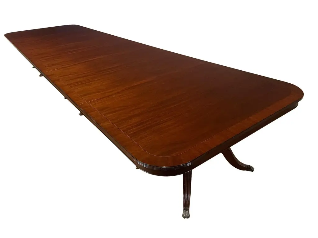 This is one of the premier Leighton Hall banquet tables. It is made-to-order in the Leighton Hall shop in Suwanee, Georgia. It features a cathedral mahogany field with black/white inlay separating the field and a straight grain mahogany border. It has a hand rubbed and polished semigloss sheen. The three pedestals are birdcage style with four posts and four legs each. Each leg terminates with an antique brass lion’s paw foot. The table comes in five large pieces which screw/bolt together. Estimated production time is 20 weeks. Dimensions: Length=240 in. (20 ft,), Width=54 in., Height=30 1/2 in.