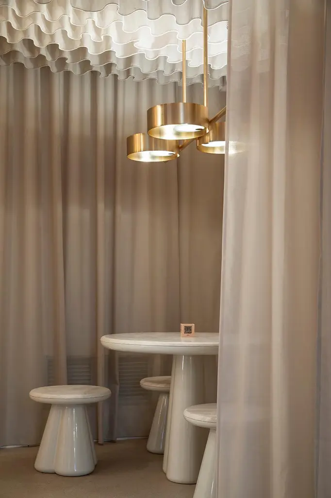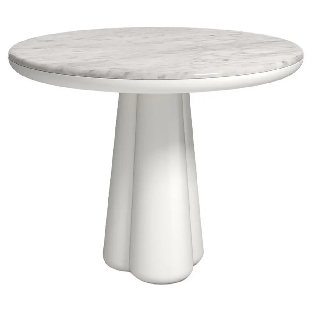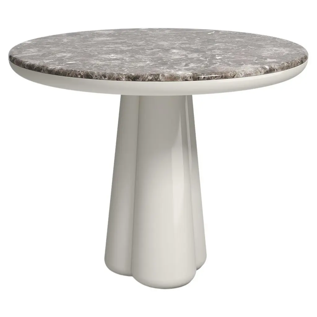 Isotopo table design by Elena Salmistraro, product by Scapin CollezioniLimited EditionA vibrant round top is combined with a sculptural base made of three rounded conical supports that give the product a strong three-dimensionality.Materials: matt lacquered polyuretane base, Verde Alpi marble top.Designer and artist Elena Salmistraro takes her inspiration from the historical period between the 1940s and 1960s. During those years the world was a victim of the Cold War and afraid of the imminent nuclear catastrophe, but , despite the scary climate, the public found the strength to imagine a better future.Bold and graphic shapes linked to the fear of the atom were recurrent in the artistic expression of the time as a symbol of the common will to change people’s destiny and defeat the overwhelming sense of fear.The Scapin Collezioni collection by Elena Salmistraro reflects these neo-tribal and post atomic symbols through precious inlays and innovative resin carvings on marble surfaces.