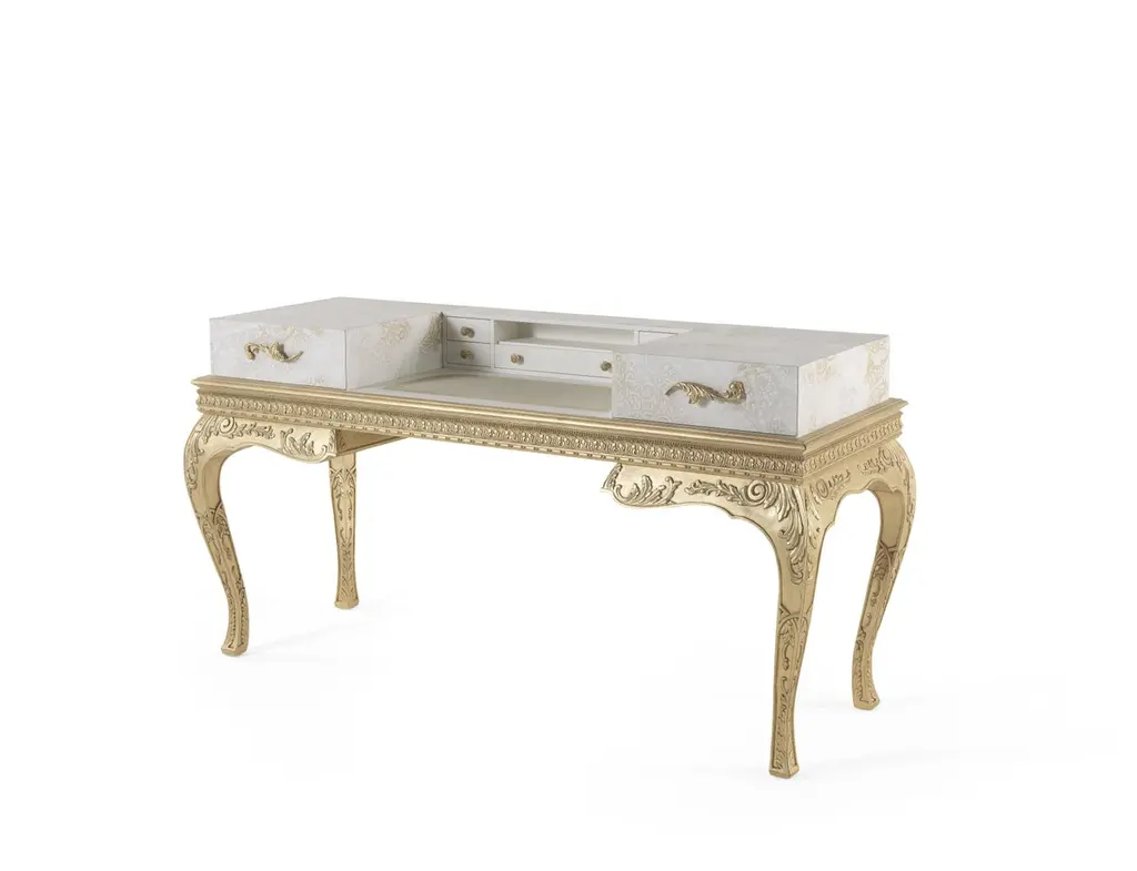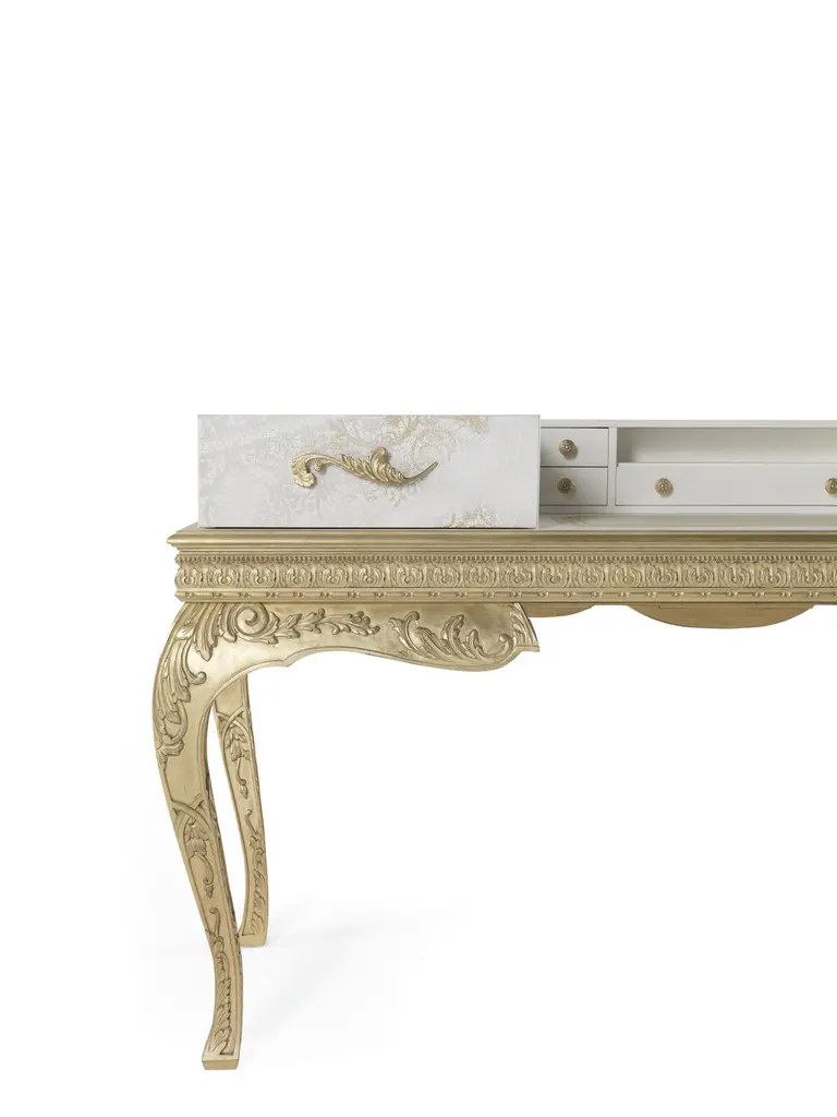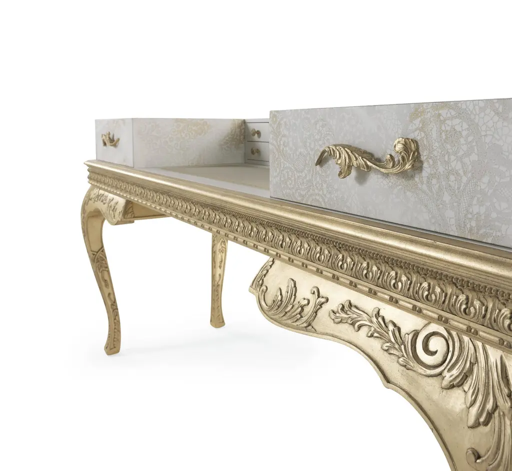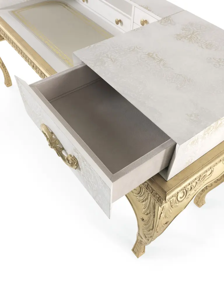 The pieces of the Brocart line showcase a refined style that evokes the luxury of the 17th and 18th century French noble courts. They present a base with hand-carved legs and antique gold-leaf finishes in pure classic style, combined with an upper part featuring a more essential and linear volume. The ornamental theme evokes the Cantù lace, a motif of the Italian manufacturing tradition, present in the Cantù territory since the XVIIth century, and is achieved through a special laser processing that allows carving of the top layer of lacquer to create the design.Brocart dressing table with base in wood, hand-carved legs and decorative frame finished in antique gold with patina J288O. Structure in lacquered wood with gold leaf laser engraved lace decoration. Top in leather MIL.21.12. Two drawers with inner upholstery in microfiber MIL.21.13.