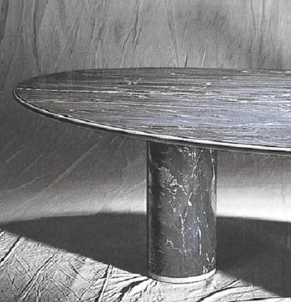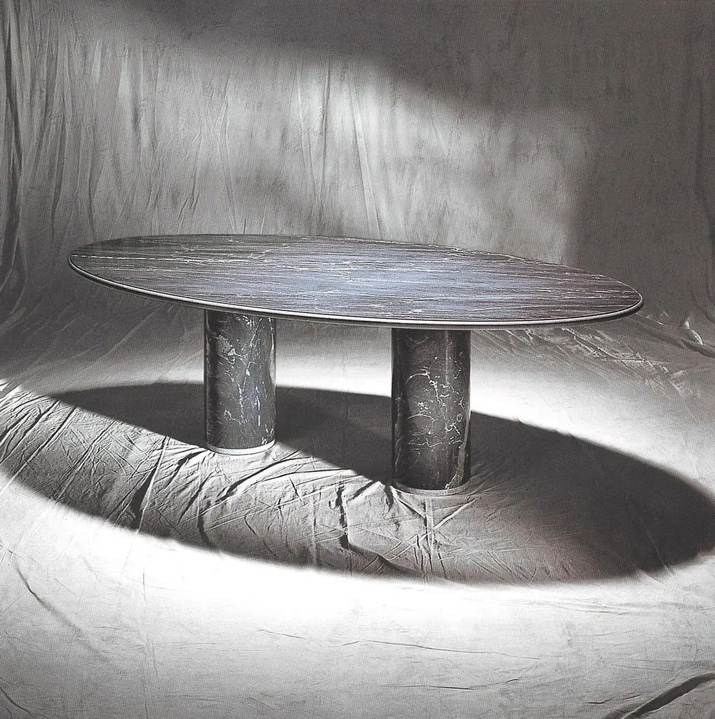 Ovale Del Giardiniere marble table designed by Arch. Achille Castiglioni.Size: cm.230 x 130 x 73 HMaterials: White Carrara - Venied bluDesigned by: Achille Castiglioni.