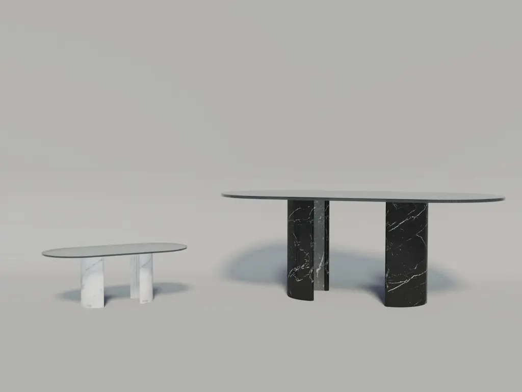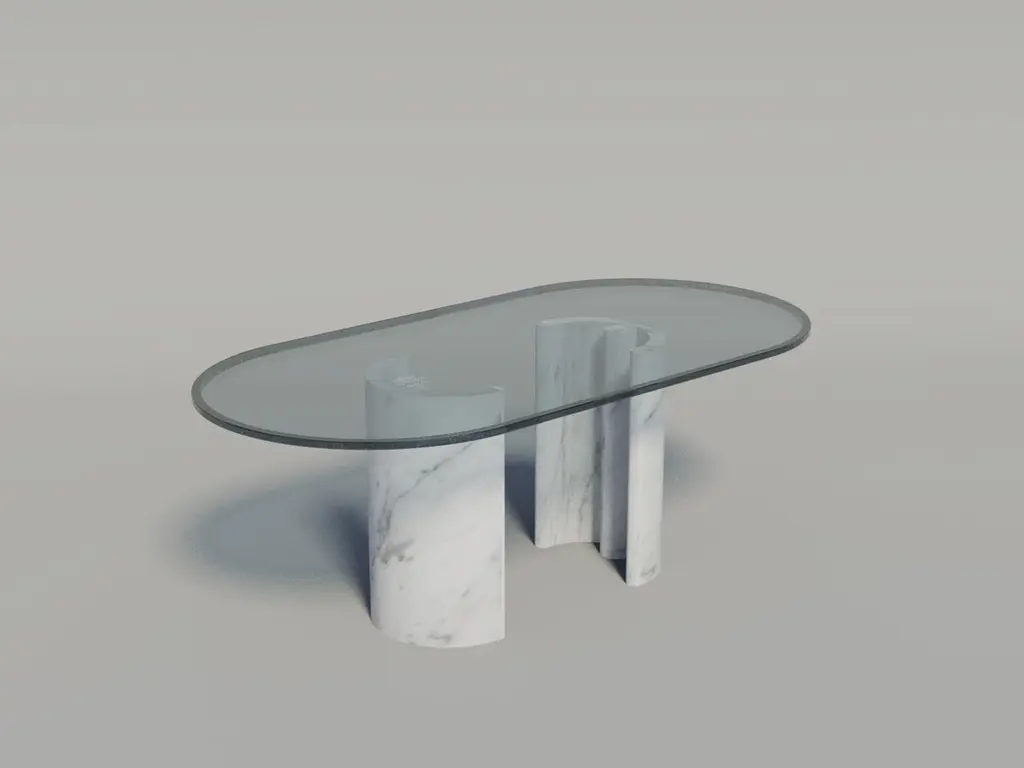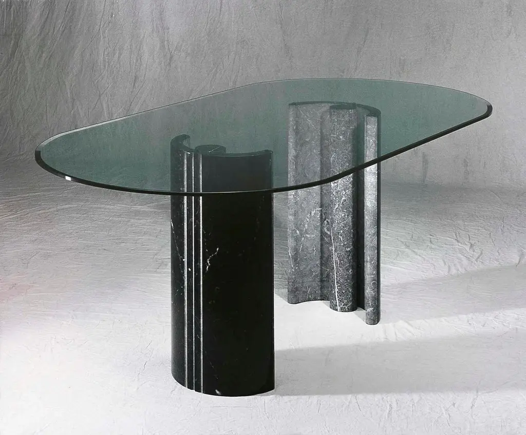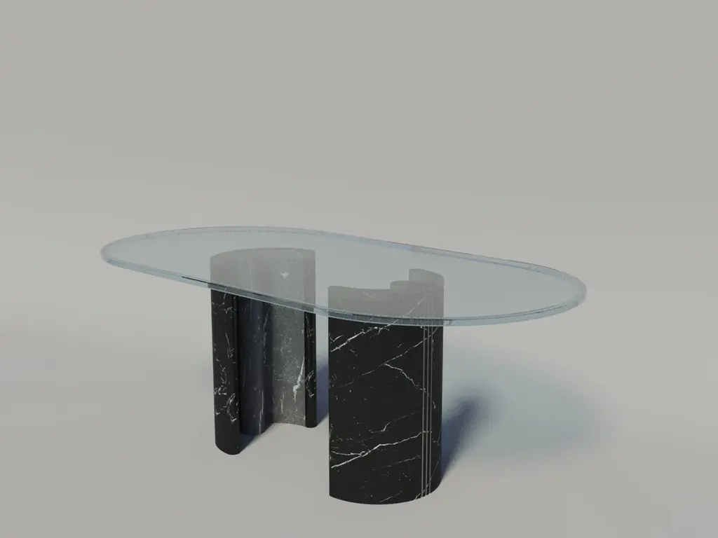 Table with marble bases and crystal top designed by K.HackeSize: cm. 200 x 100 x 73 H.Materials: White Carrara /Calacatta + Crystal – Black Marquinia + Crystal - White Pensylvania + CrystalDesigned by: Klaus Hacke.