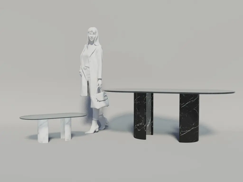 Low table with marble bases and crystal top "Hacke O" designed by K. HackeSize: cm. 140 x 70 x 36 H.Materials: White Carrara /Calacatta + crystal - black Marquinia + crystal - white Pennsylvania + crystalDesigned by: Klau Hacke