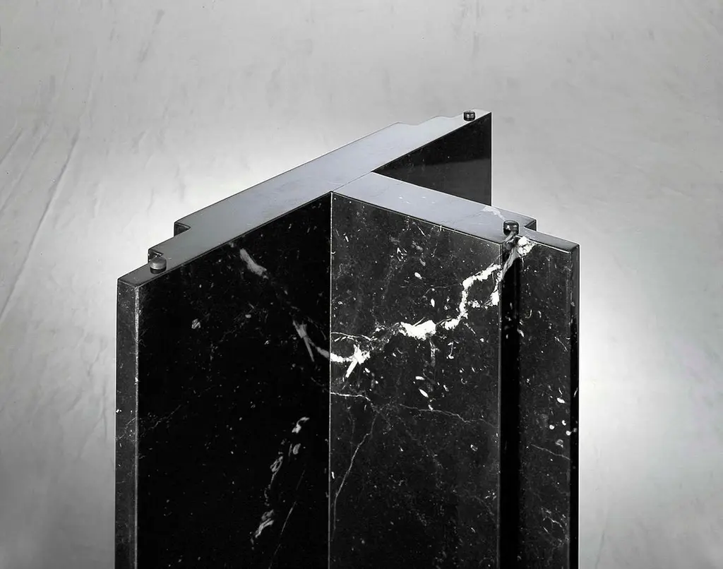 Table with marble bases and crystal top designed by Adolfo NataliniSize: cm. 220 x 90 x 73 H.Materials: White Carrara /Calacatta + Crystal – Red Carpazi + Crystal – National Travertine + Crystal – Black Marquinia + CrystalDesigned by: Adolfo Natalini.