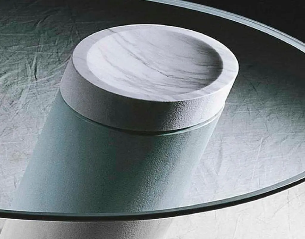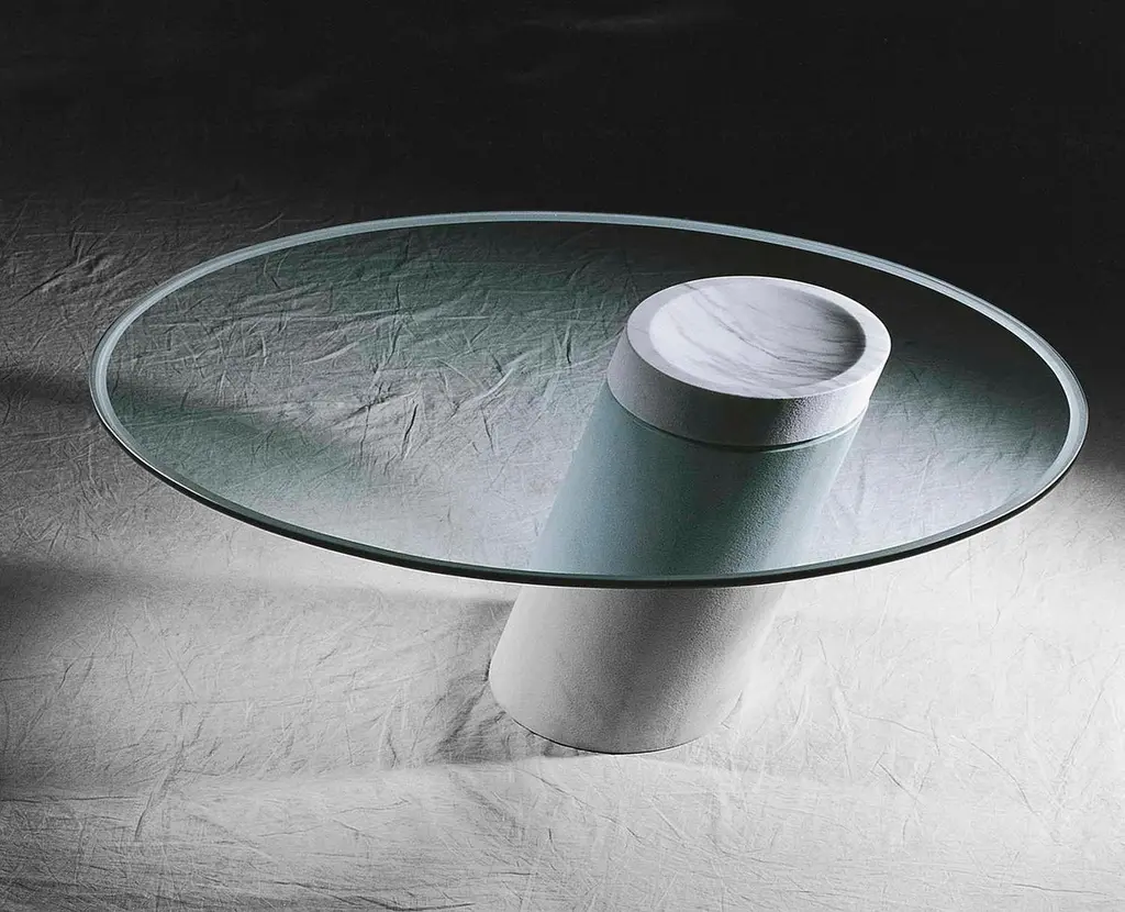Name: EOLOLow Marble table designed by F.FicchiSize: Cm 110 x 80 x 36 H. (Oval shape)Materials: White Carrara - black marquina - crystal top.