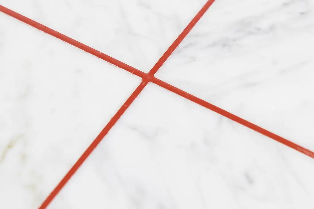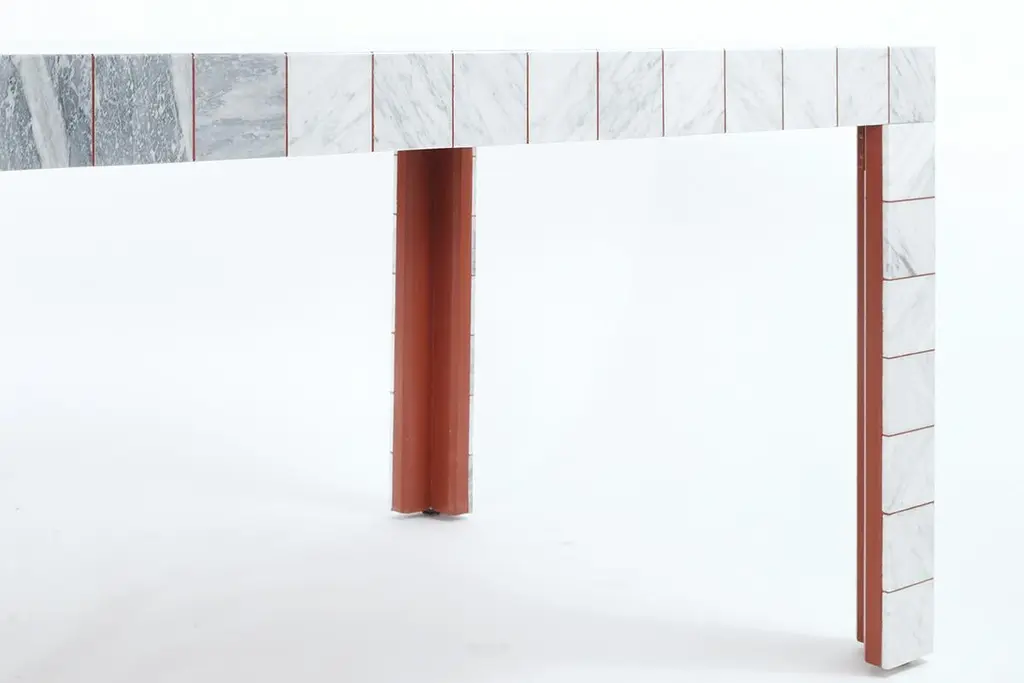 Polychrome marble low tableSize cm: 55 x 110 x H 36Materials: Bianco Carrara + BardiglioDesigner: G. Raboni & M. MontefuscoTo preserve the Apuan quarries we have created this table using tiles of a common industrial format, enhancing the veins with the chromatic flicker of a biological red resin, which highlights the intersections and gives the table a sophisticated simplicity.