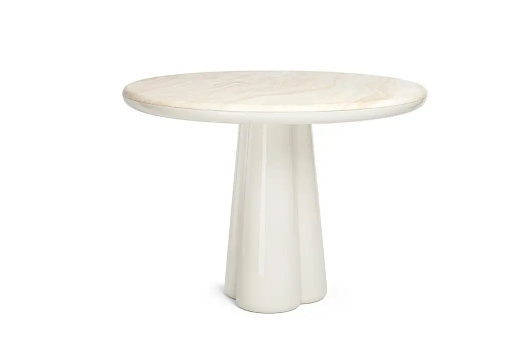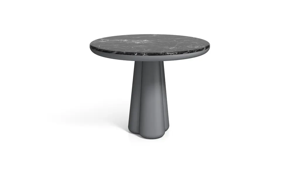 Isotopo table design by Elena Salmistraro, product by Scapin CollezioniLimited EditionA vibrant round top is combined with a sculptural base made of three rounded conical supports that give the product a strong three-dimensionality.Materials: matt lacquered polyuretane base, Verde Alpi marble top.Designer and artist Elena Salmistraro takes her inspiration from the historical period between the 1940s and 1960s. During those years the world was a victim of the Cold War and afraid of the imminent nuclear catastrophe, but , despite the scary climate, the public found the strength to imagine a better future.Bold and graphic shapes linked to the fear of the atom were recurrent in the artistic expression of the time as a symbol of the common will to change people’s destiny and defeat the overwhelming sense of fear.The Scapin Collezioni collection by Elena Salmistraro reflects these neo-tribal and post atomic symbols through precious inlays and innovative resin carvings on marble surfaces.