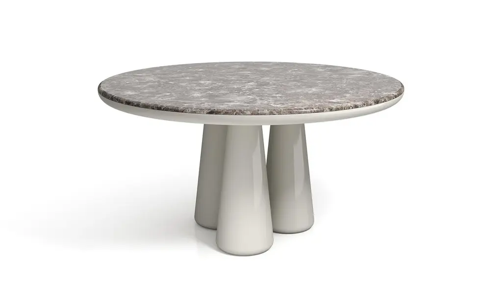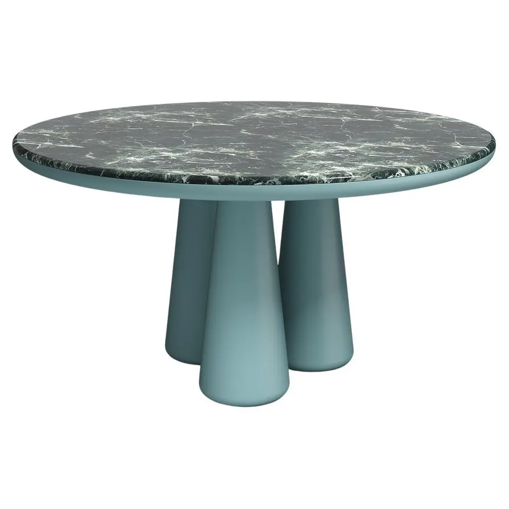 Isotopo table design by Elena Salmistraro, product by Scapin CollezioniLimited EditionA vibrant round top is combined with a sculptural base made of three rounded conical supports that give the product a strong three-dimensionality.Materials: matt lacquered polyuretane base, Verde Alpi marble top.Designer and artist Elena Salmistraro takes her inspiration from the historical period between the 1940s and 1960s. During those years the world was a victim of the Cold War and afraid of the imminent nuclear catastrophe, but , despite the scary climate, the public found the strength to imagine a better future.Bold and graphic shapes linked to the fear of the atom were recurrent in the artistic expression of the time as a symbol of the common will to change people’s destiny and defeat the overwhelming sense of fear.The Scapin Collezioni collection by Elena Salmistraro reflects these neo-tribal and post atomic symbols through precious inlays and innovative resin carvings on marble surfaces.