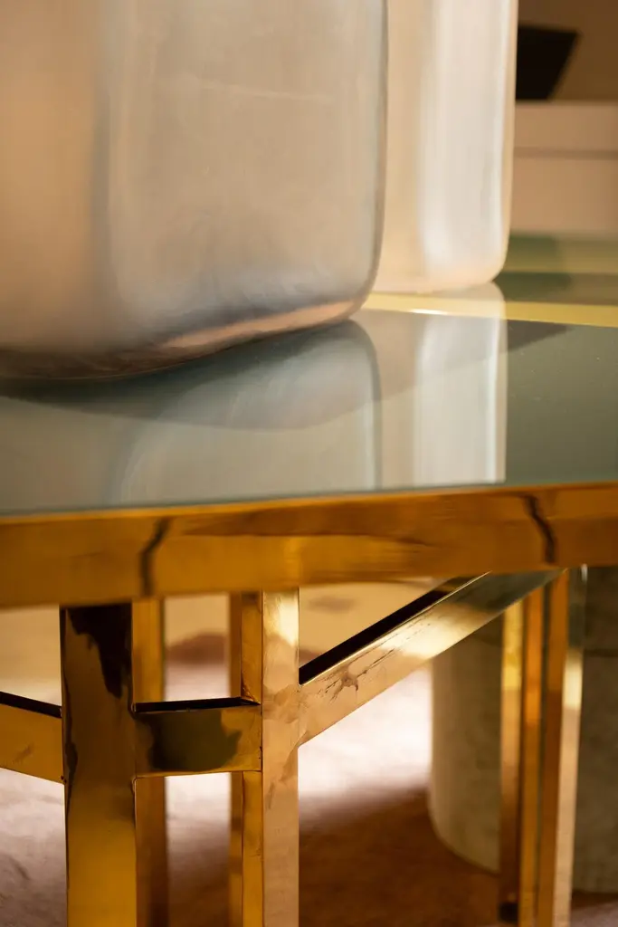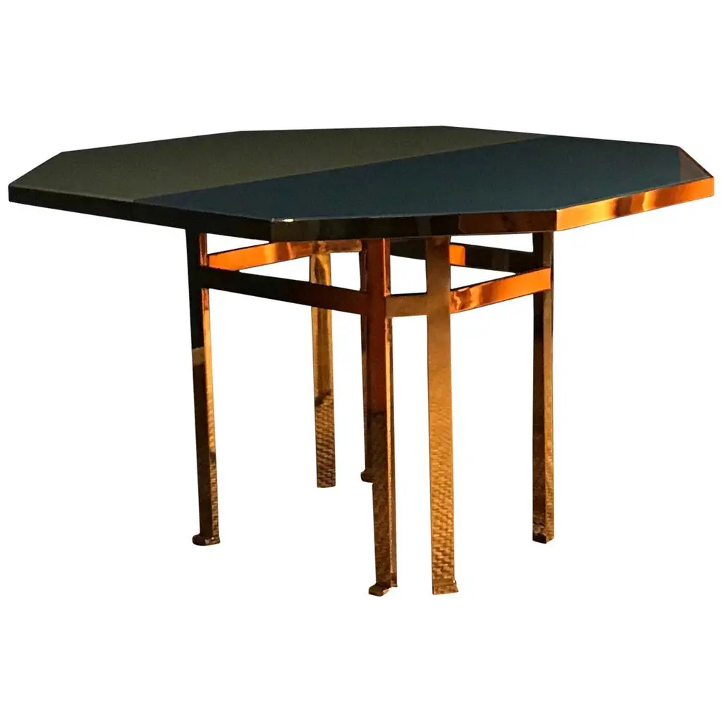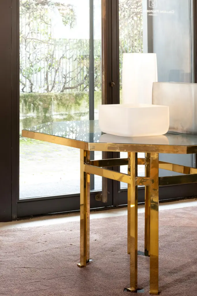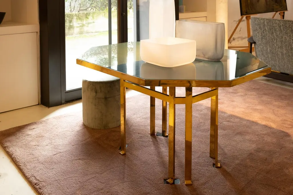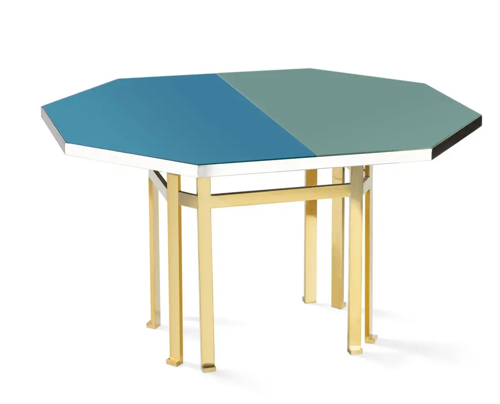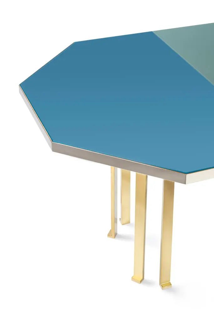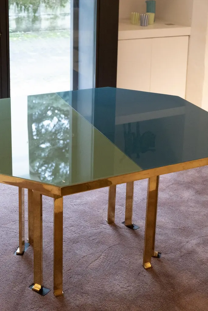 21st century Filippo Feroldi brass table 130 back-colored glass top various colorsdesigned by Filippo Feroldi for Purho and Colleoni Arte, Holo 130 is characterized by small dimensions and by an octagonal brass structure surmounted by a sheet of glass back-colored in two different shades which in turn rests on a base in black lacquered wood. The volumes, the technical details, the study of color and the craftsmanship with which it is made make Holo 130 a precious, unique complement, masterfully balanced between the history of design and contemporaneity, capable of giving personality to the environments in which it is inserted.Finishes available: Brass and tempered glass (2 finishes).