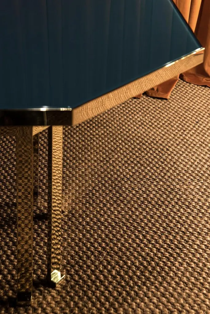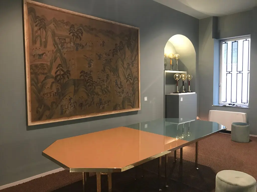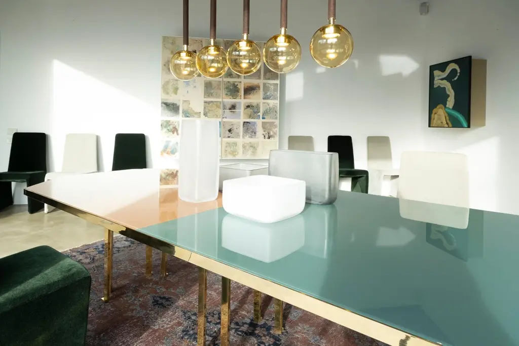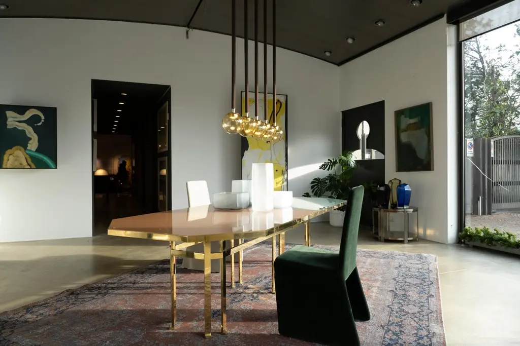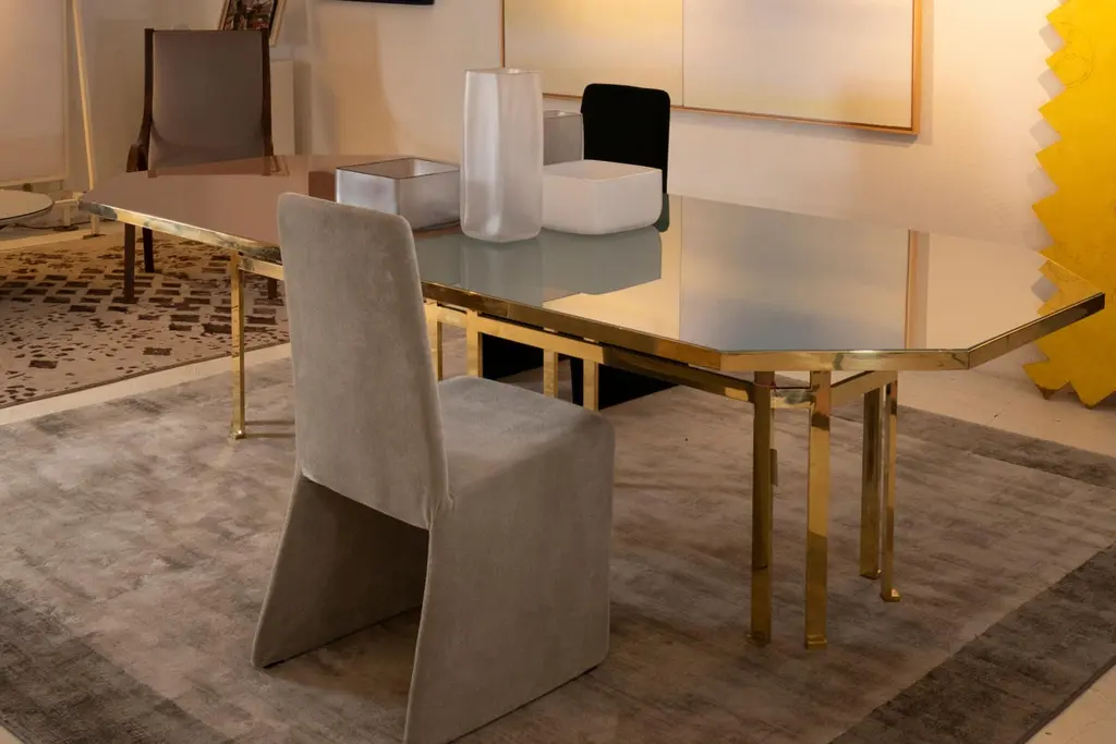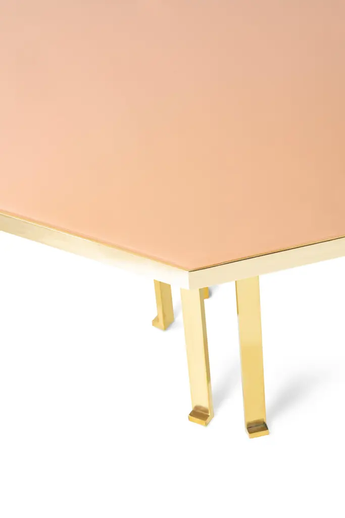 21st Century Filippo Feroldi Brass Table 280 Back-coloured Glass Top Various ColorsDesigned by Filippo Feroldi for Purho and Colleoni Arte, Holo 280 is a table with generous dimensions characterized by an octagonal brass structure surmounted by a sheet of glass back-coloured in two different shades which in turn rests on a base in black lacquered wood. The volumes, the technical details, the study of colour and the craftsmanship with which it is made make Holo 280 a precious, unique complement, masterfully balanced between the history of design and contemporaneity, capable of giving personality to the environments in which it is inserted.Finishes available: Brass + tempered glass (2 finishes)