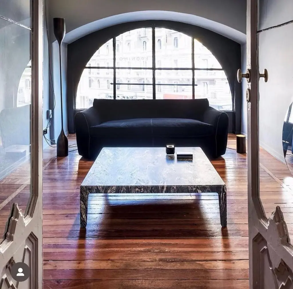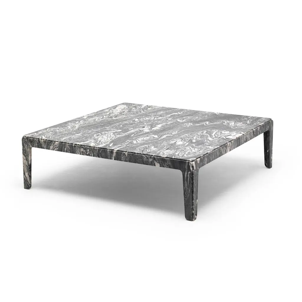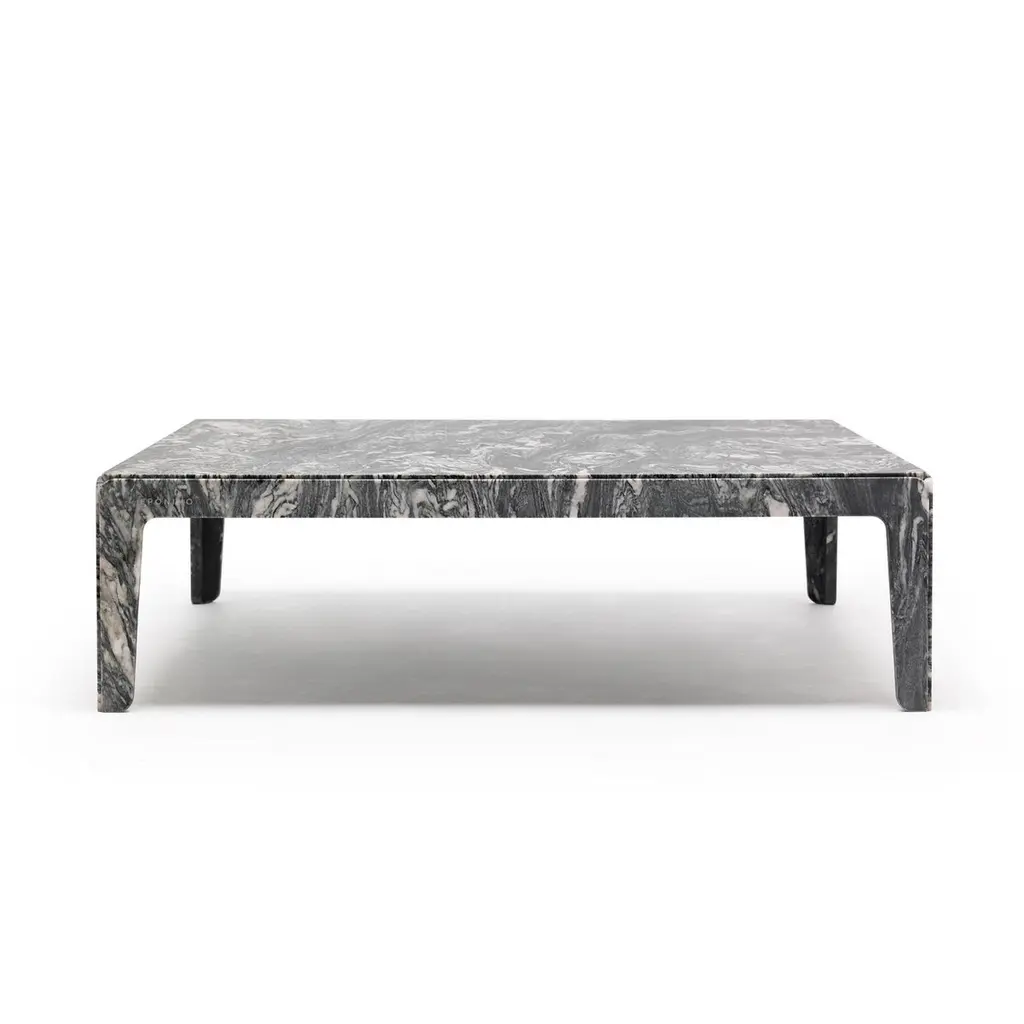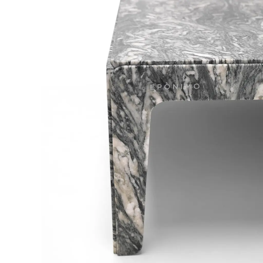 A 4-legged low table completely made of stone quarried in Italy or Morocco. Through a simple trick the table, which is in fact the assembly of five parts, appears sculpted from a solid block. The four lateral elements, once they are assembled with the top, become structural without the need for additional parts that would in turn compromise the sculptural effect of the piece. The surface of the table is treated with a slightly three-dimensional weathered finish that further increases the preciousness and uniqueness of the natural material and that in time hides potential scratches and stains.Available in white Carrara, black New Saint Laurent or gree/grey Cipollino marble. Weathered finish. Other stones and finishes are available upon request.