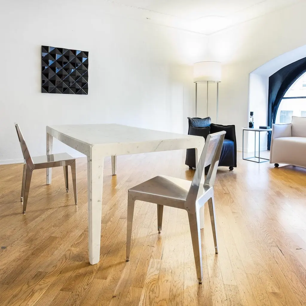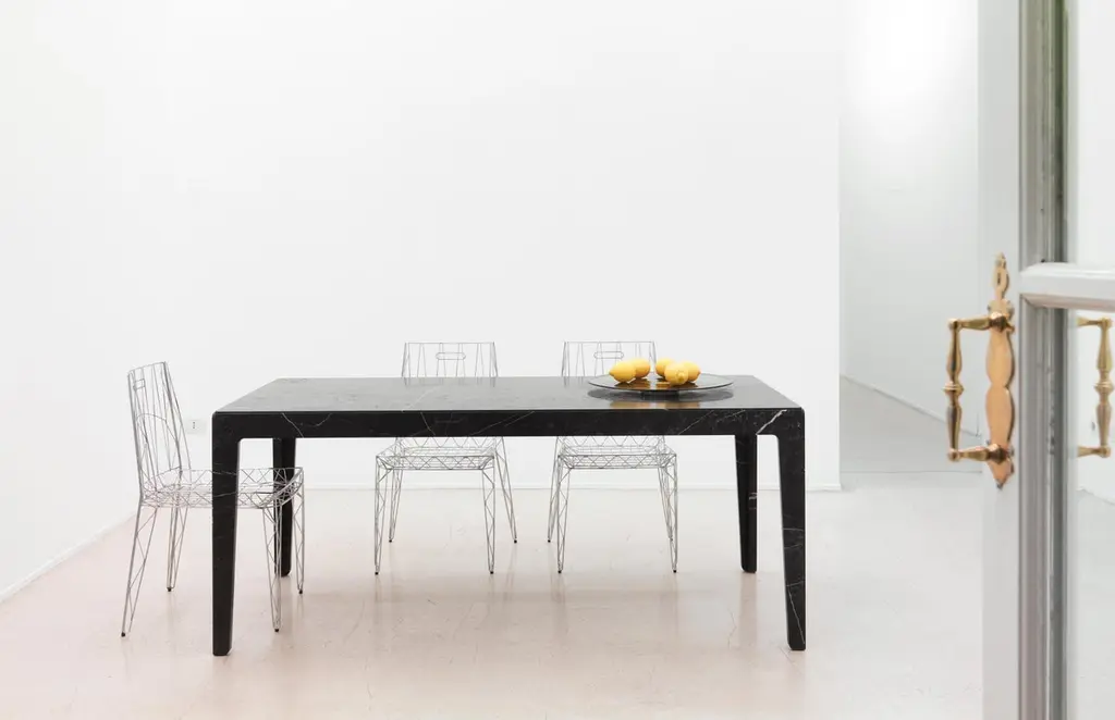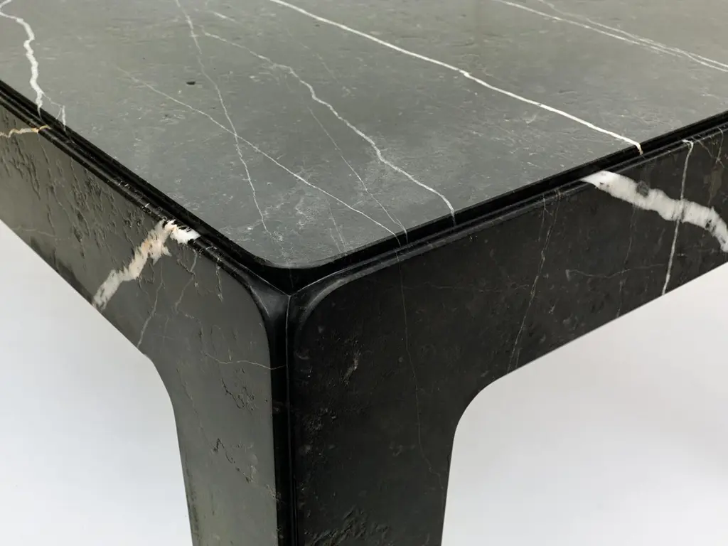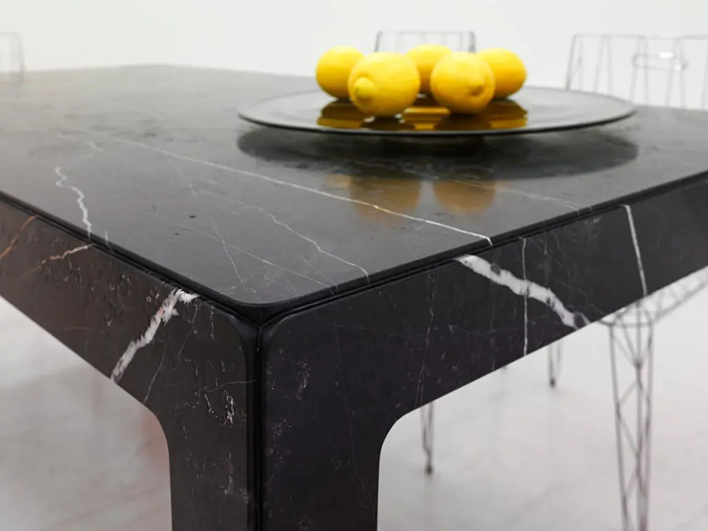 A 4-legged table completely made of stone. Through a simple trick the table, which is in fact the assembly of five parts, appears sculpted from a solid block. The four lateral elements, once they are assembled with the top, become structural without the need for additional parts that would in turn compromise the sculptural effect of the piece. The surface of the table is treated with a slightly three-dimensional weathered finish that further increases the preciousness and uniqueness of the natural material and that in time hides potential scratches and stains.White Carrara, black New Saint Laurent or Cipollino marble. Weathered finish. Other sizes are available. Other stones and finishes are available upon request.