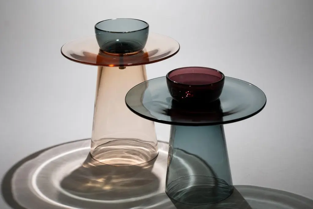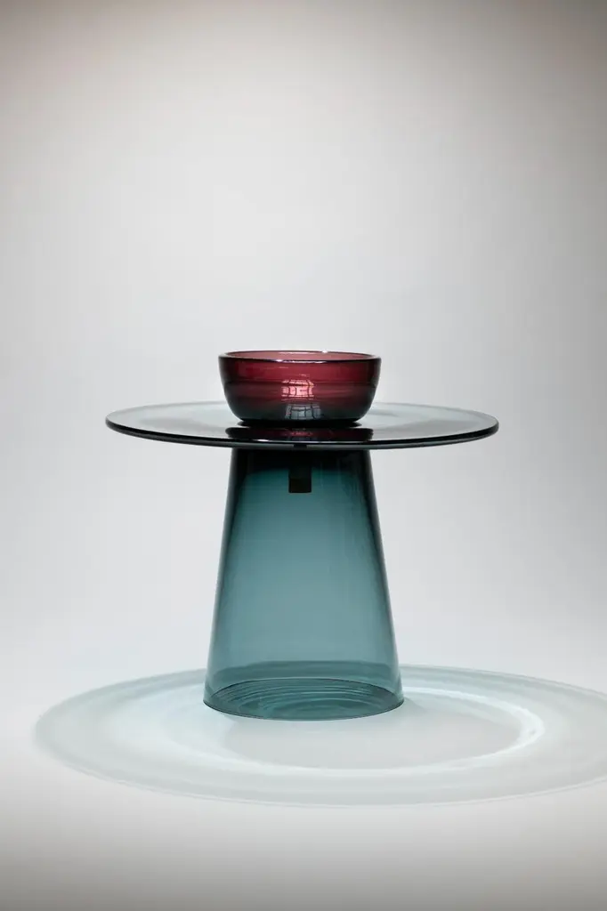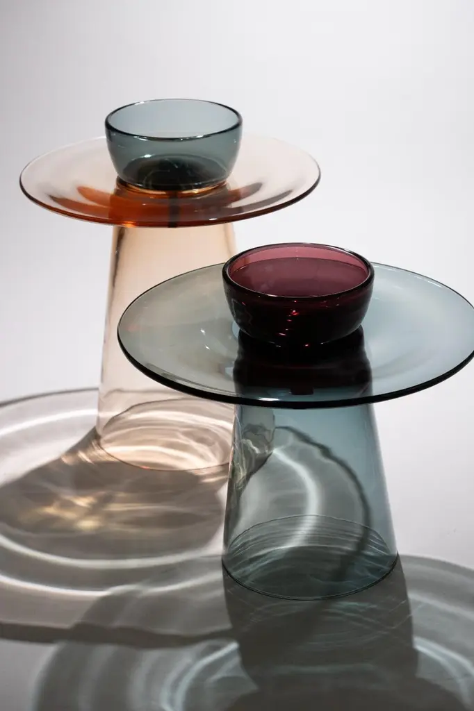 Angels is a collection of tables in Murano glass designed by the Paritzki&Liani (Tel Aviv, Israel) for Purho in 2023.Like ethereal figures of light and reflection, the Angels tables represent a small interior architecture in which the three pieces that compose them — bases of different heights (h.440/350), the top (d.500) and a bowl blown by master Andrea Zilio — join together to form a world of colours, vibrating in the space of perception.In these tables, blown glass is structure. The simplification of forms or their abstraction lead to an aesthetic dimension of tension created by the prominent thicknesses of the sections and by the significant surfaces for this type of processing. The inspiration for the colours of the Angels tables comes from the observation of monochrome chiaroscuro painted artefacts made within the Italian pictorial tradition of the late 1400s. The delicate shades of rosé, ochre, grey are joined by more decisive colours such as moss green, deep blue, amethyst for a chromatic balance capable of being continuously renewed based on varying combinations of the different components of the tables.Available versions :base rosé, top moss green, bowl amethyst base rosé, top moss green, bowl rosébase rosé, top moss green, bowl bluebase rosé, top rosé, bowl amethystbase rosé, top rosé, bowl bluebase blue, top blue, bowl amethystbase blue, top blue, bowl amberbase blue, top blue, bowl rosébase blue, top moss green, bowl bluebase blue, top amethyst, bowl blue