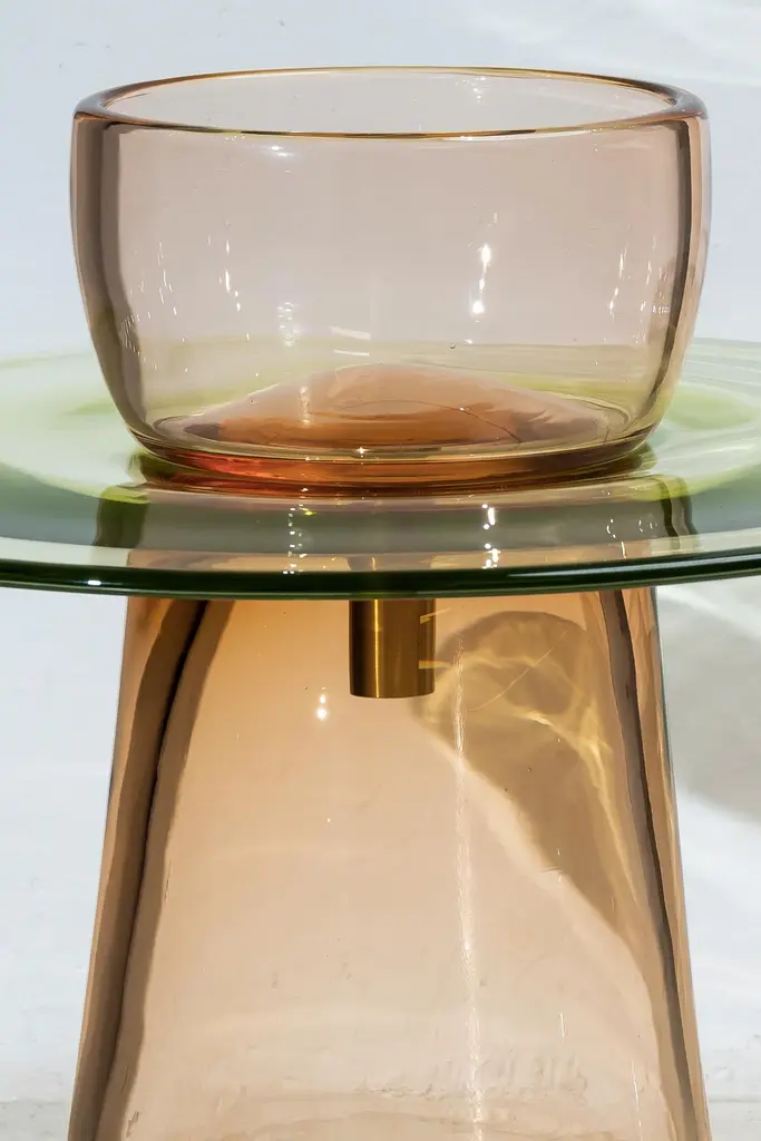 Angels is a collection of tables in Murano glass designed by the Paritzki&Liani (Tel Aviv, Israel) for Purho in 2023.Like ethereal figures of light and reflection, the Angels tables represent a small interior architecture in which the three pieces that compose them — bases of different heights (h.440/350), the top (d.500) and a bowl blown by master Andrea Zilio — join together to form a world of colours, vibrating in the space of perception.In these tables, blown glass is structure. The simplification of forms or their abstraction lead to an aesthetic dimension of tension created by the prominent thicknesses of the sections and by the significant surfaces for this type of processing. The inspiration for the colours of the Angels tables comes from the observation of monochrome chiaroscuro painted artefacts made within the Italian pictorial tradition of the late 1400s. The delicate shades of rosé, ochre, grey are joined by more decisive colours such as moss green, deep blue, amethyst for a chromatic balance capable of being continuously renewed based on varying combinations of the different components of the tables.Available versions :base rosé, top moss green, bowl amethyst base rosé, top moss green, bowl rosébase rosé, top moss green, bowl bluebase rosé, top rosé, bowl amethystbase rosé, top rosé, bowl bluebase blue, top blue, bowl amethystbase blue, top blue, bowl amberbase blue, top blue, bowl rosébase blue, top moss green, bowl bluebase blue, top amethyst, bowl blue