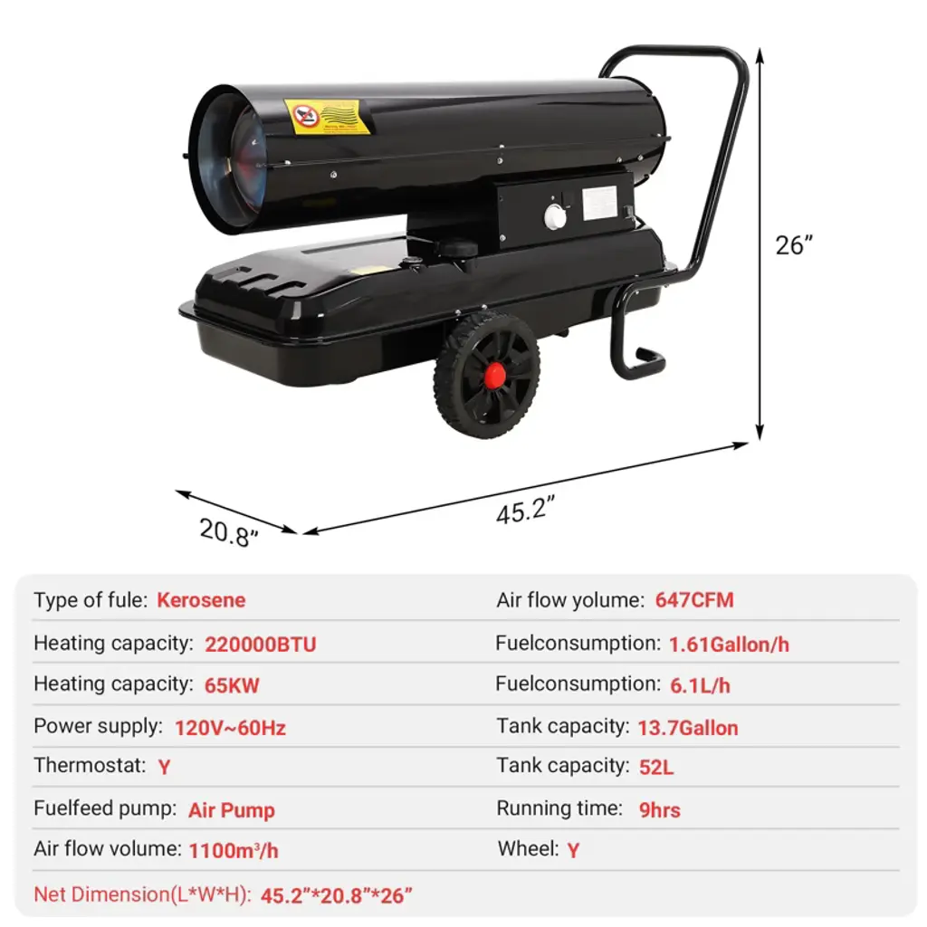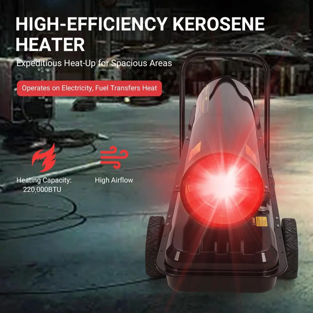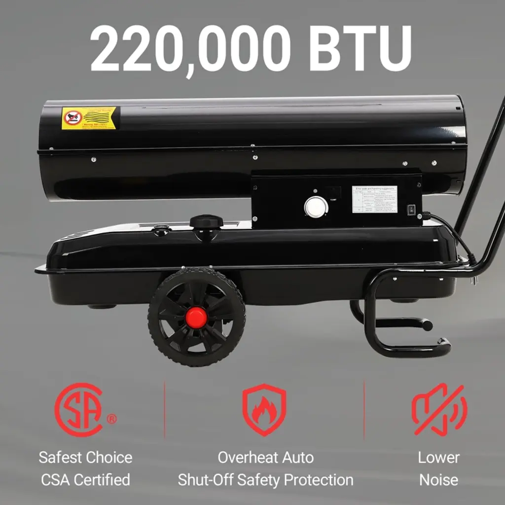 Master extreme climate conditions with this professional-grade forced air heater, engineered to deliver an immense 220,000 BTUs of powerful, consistent heat. Designed for the most demanding applications, this robust portable heater is capable of warming vast indoor spaces such as warehouses and workshops, or providing critical heat on large outdoor job sites and construction projects. Its advanced features, including precise thermostat control and comprehensive safety systems, ensure efficient and reliable performance in any environment.Key Features:Unmatched Heating PerformanceGenerate a substantial and rapid warmth output to tackle the largest and most challenging spaces. This high-output heater produces 220,000 BTUs, making it suitable for areas up to 38,846 cubic feet. The powerful forced-air circulation ensures even heat distribution, quickly elevating the temperature in large, open, or poorly insulated areas to maintain productivity and comfort in cold conditions.Precise Digital Thermostat ControlAchieve optimal comfort and fuel efficiency with advanced digital climate management. The heater features a user-friendly control panel with a clear LED display, allowing you to set and monitor the exact temperature. The adjustable thermostat offers a wide range from 40¡ãF to 110¡ãF (5¡ãC to 45¡ãC), enabling you to maintain your desired ambient temperature automatically, without manual intervention.Extended Runtime with Large Capacity Fuel TankMaximize operational uptime with a high-capacity 13.7-gallon (52-liter) integrated fuel tank. Under standard operating conditions, the heater consumes approximately 1.61 gallons per hour, providing up to 9 hours of continuous heat on a single tank. This extended runtime minimizes interruptions for refueling, while the built-in fuel gauge and automatic low-fuel shutoff provide convenient monitoring and added safety.Durable Construction and Versatile Fuel OptionsBuilt for industrial use, the heater features a heavy-duty steel construction protected by a rust-resistant powder coating, ensuring longevity in harsh conditions. An integrated handle provides portability despite its powerful capacity. This versatile unit is certified for safe operation with both kerosene and diesel fuel (used one type at a time), offering flexibility based on availability and preference. To suit different operational needs, this heater is available in multiple high-visibility color options including Safety Yellow, Industrial Orange, and Contractor Blue, and is offered in various BTU output models such as 150,000 BTU and 175,000 BTU versions to match specific space requirements.