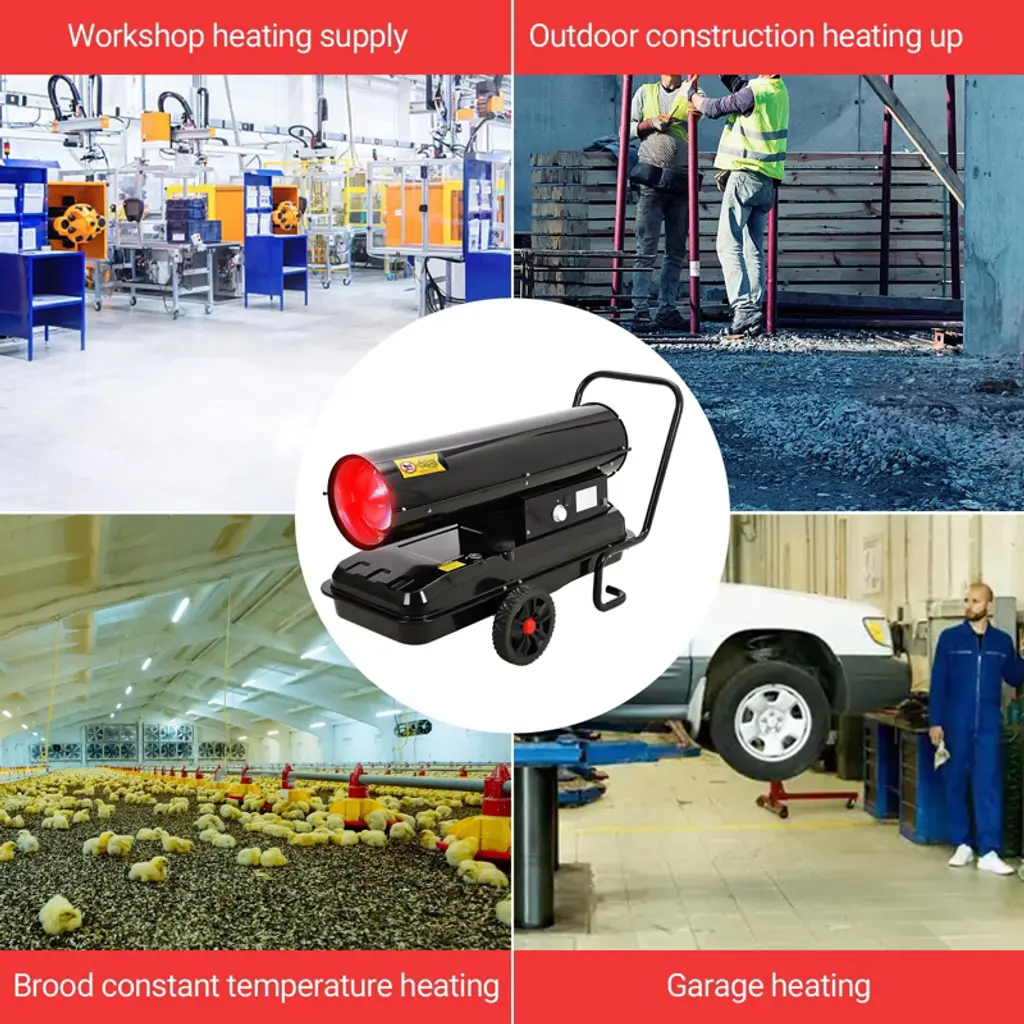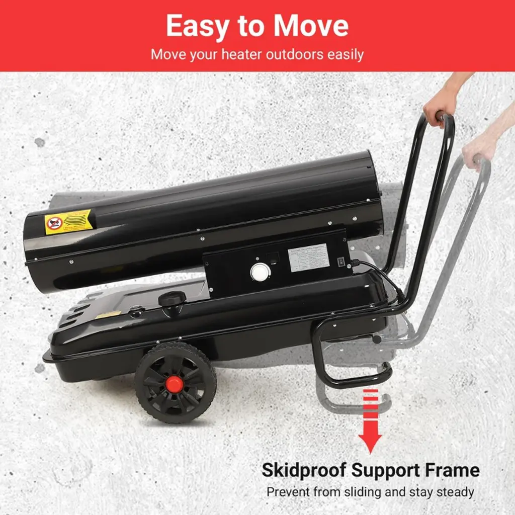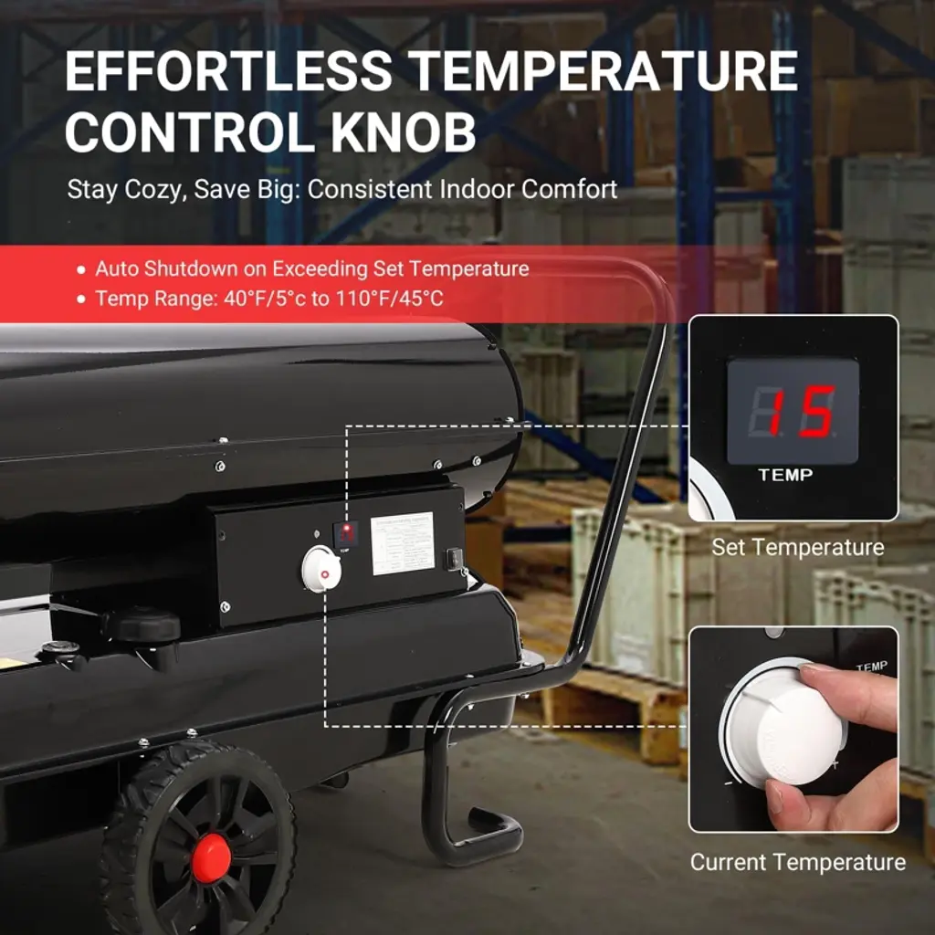 Master extreme climate conditions with this professional-grade forced air heater, engineered to deliver an immense 220,000 BTUs of powerful, consistent heat. Designed for the most demanding applications, this robust portable heater is capable of warming vast indoor spaces such as warehouses and workshops, or providing critical heat on large outdoor job sites and construction projects. Its advanced features, including precise thermostat control and comprehensive safety systems, ensure efficient and reliable performance in any environment.Key Features:Unmatched Heating PerformanceGenerate a substantial and rapid warmth output to tackle the largest and most challenging spaces. This high-output heater produces 220,000 BTUs, making it suitable for areas up to 38,846 cubic feet. The powerful forced-air circulation ensures even heat distribution, quickly elevating the temperature in large, open, or poorly insulated areas to maintain productivity and comfort in cold conditions.Precise Digital Thermostat ControlAchieve optimal comfort and fuel efficiency with advanced digital climate management. The heater features a user-friendly control panel with a clear LED display, allowing you to set and monitor the exact temperature. The adjustable thermostat offers a wide range from 40¡ãF to 110¡ãF (5¡ãC to 45¡ãC), enabling you to maintain your desired ambient temperature automatically, without manual intervention.Extended Runtime with Large Capacity Fuel TankMaximize operational uptime with a high-capacity 13.7-gallon (52-liter) integrated fuel tank. Under standard operating conditions, the heater consumes approximately 1.61 gallons per hour, providing up to 9 hours of continuous heat on a single tank. This extended runtime minimizes interruptions for refueling, while the built-in fuel gauge and automatic low-fuel shutoff provide convenient monitoring and added safety.Durable Construction and Versatile Fuel OptionsBuilt for industrial use, the heater features a heavy-duty steel construction protected by a rust-resistant powder coating, ensuring longevity in harsh conditions. An integrated handle provides portability despite its powerful capacity. This versatile unit is certified for safe operation with both kerosene and diesel fuel (used one type at a time), offering flexibility based on availability and preference. To suit different operational needs, this heater is available in multiple high-visibility color options including Safety Yellow, Industrial Orange, and Contractor Blue, and is offered in various BTU output models such as 150,000 BTU and 175,000 BTU versions to match specific space requirements.