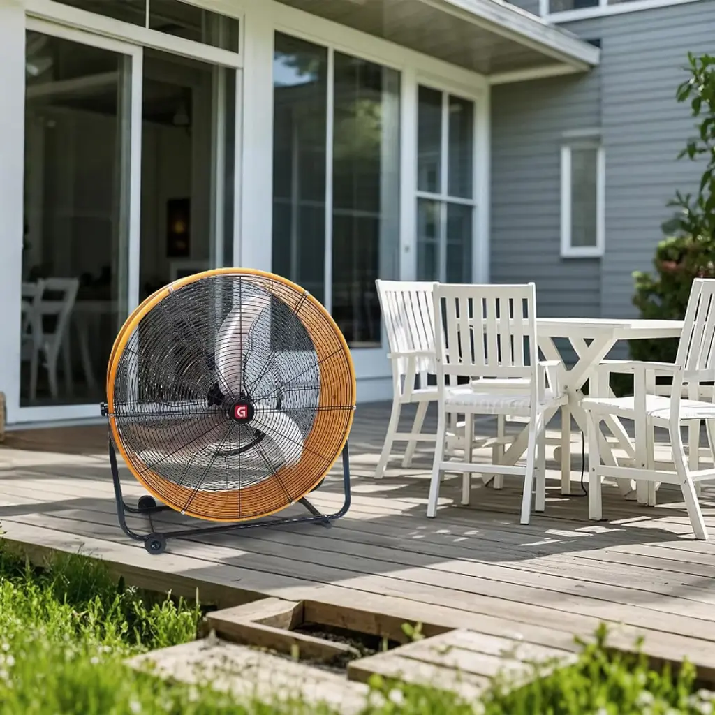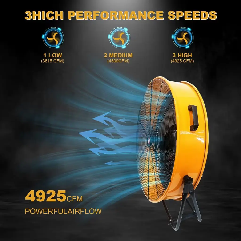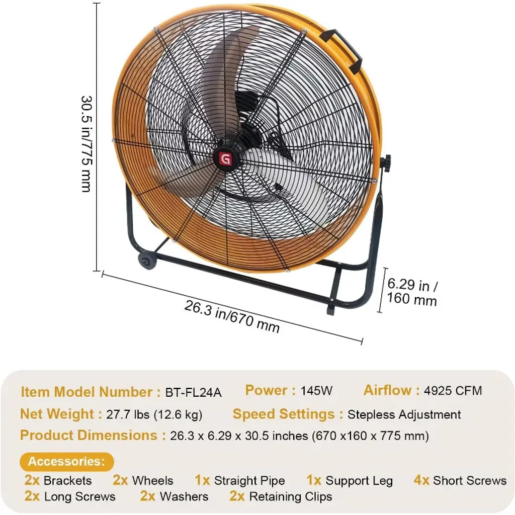 Product information Product Name: High Velocity Drum Fan Color: Yellow Electric fan design: Floor Fan SIZE:36"/30"/24" 36": Product Dimensions: 43.5"D x 12.6"W x 43.7"H Item Weight: 63.71 Pounds 30": Product Dimensions: 35.04"D x 8.07"W x 34.25"H Item Weight: 34.61 Pounds 24": Product Dimensionsp: 28.94"D x 7.09"W x 28.74"H Item Weight: 25.13 Pounds Room Type: Garage Special Feature: Adjustable Tilt Pack List: 1 x Floor Fan 1 x Manual Product advantages: Heavy-Duty Metal Construction for Tough Environments: Built with robust steel housing, this commercial drum fan resists dents, rust, and wear in dusty or humid settings. The reinforced safety grill protects precision-balanced blades, ensuring this heavy duty drum fan maintains durability during continuous industrial use. Precise 3-Speed Control for Custom Airflow: Featuring three adjustable settings, this high velocity drum fan allows operators to tailor airflow from gentle circulation to maximum cooling. Each speed maintains consistent wind velocity without power drops, adapting to diverse space needs in workshops or factories. Commercial-Grade Reliability for Extended Operation: Powered by a 145W copper motor, this industrial drum fan ensures efficient, overheating-free performance for 8-12 hour shifts. Its professional-grade design provides consistent ventilation in garages, production floors, and other commercial settings. Enhanced Mobility and Safety Features: Equipped with smooth-rolling casters and 360-degree rotation, this yellow industrial drum fan moves easily across concrete floors for full-area coverage. The bright yellow finish boosts jobsite visibility, making this heavy duty ventilation solution both practical and safe.