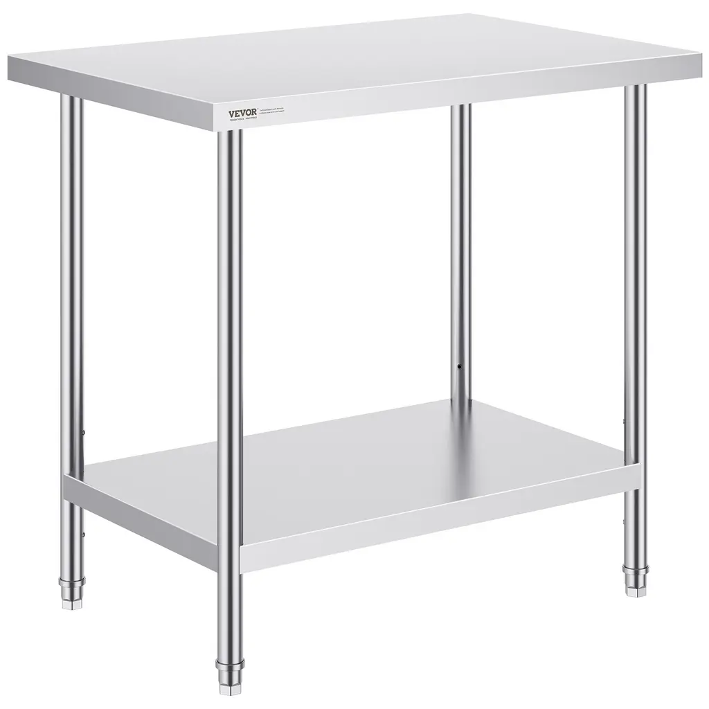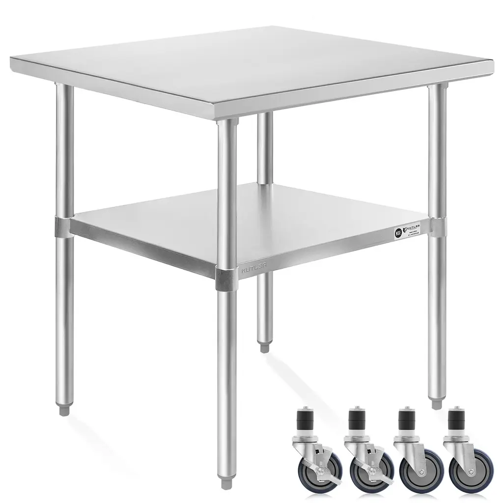 Heavy-duty stainless steel table: KUTLER's stainless steel prep table features an 18-gauge #430 SS table top. It offers a sturdy surface for streamlined food preparation in commercial kitchens, ensuring optimal workflow and productivity. Designed with straight edges and a smooth surface, it is easy to clean, and is corrosion and wear resistant. Dimensions: 24" Long x 24" Deep x 34-1/2" High.NSF Certified: Rest assured that KUTLER’s NSF certification guarantees a high sanitation and food safety standard, meeting the stringent commercial kitchen use requirements. NSF Model #: KT_03-WT2424-GBAdjustable Under Shelf: Featuring an adjustable galvanized under shelf, these work and prep tables provide extra storage space for kitchen essentials. They can accommodate a variety of items, from kitchen utensils to ingredient bins, keeping them within easy reach for seamless workflow.Non-marring bullet feet: Equipped with height adjustable bullet feet, this work table offers versatility in adapting to uneven surfaces, ensuring a stable and level working platform, essential for any bustling kitchen environment. The bullet feet adjust up to 1", stabilizing the table. With a non-marring design, floors are protected from denting and scratching.Versatile stainless steel work tables: These stainless steel prep tables excel in versatility, extending beyond commercial kitchens to cater to various needs. These work tables adapt effortlessly to catering events, food trucks, laboratories, medical facilities, and industrial workshops. KUTLER's tables are versatile enough to be used at home, in the garage or laundry room. Transform your commercial kitchen with KUTLER’s stainless steel prep table. This heavy-duty table is constructed with an 18-gauge #430 SS table top ensuring durability and resilience. It is capable of withstanding rigorous daily use. The straight edges not only enhance the tables' aesthetic appeal but also contribute to a seamless, easy-to-clean surface that resists stains and corrosion, maintaining its pristine appearance even after prolonged use. This stainless steel table is NSF certified, guaranteeing a level of quality crucial for commercial kitchens, ensuring compliance with stringent food safety requirements. The adjustable galvanized under shelf optimizes storage, keeping essential tools and supplies within reach while maximizing workspace organization. Height adjustable bullet feet enable stability on uneven surfaces, offering a level platform essential for the bustling environment of any professional kitchen. Versatile and reliable, this work table can be used beyond culinary spaces. From laboratories and hospitals requiring sterile surfaces to hospitality settings seeking a durable yet elegant solution. The adaptability extends even to industrial workshops, demonstrating their value as a practical, sturdy, and durable surface for a wide array of applications. Dimensions: 24" Long x 24" Deep x 34-1/2" High NSF Model #: KT_03-WT2424-GB Includes: Stainless Steel Table, Under Shelf, Instructions, and Hardware for Assembly. *** This product is designed and finished for use in a commercial environment. Therefore, surface imperfections such as scratches, scuffs and indents may be found. This is normal and to be expected on products of this nature. ***