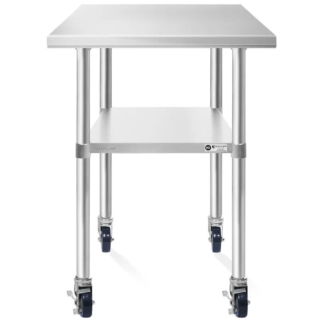 Heavy-duty stainless steel table: KUTLER's stainless steel prep table features an 18-gauge #430 SS table top. It offers a sturdy surface for streamlined food preparation in commercial kitchens, ensuring optimal workflow and productivity. Designed with straight edges and a smooth surface, it is easy to clean, and is corrosion and wear resistant. Dimensions: 30" Long x 24" Deep x 34-1/2" High.NSF Certified: Rest assured that KUTLER’s NSF certification guarantees a high sanitation and food safety standard, meeting the stringent commercial kitchen use requirements. NSF Model #: KT_04-WT2430-GB+4WAdjustable Under Shelf: Featuring an adjustable galvanized under shelf, these work and prep tables provide extra storage space for kitchen essentials. They can accommodate a variety of items, from kitchen utensils to ingredient bins, keeping them within easy reach for seamless workflow.Non-marring bullet feet and 4 caster wheels: Equipped with adjustable feet, adjusting up to 1" high, ensuring a stable and level working platform on uneven surfaces. A set of 4 caster wheels are also included. These wheels work on a variety of surfaces and feature two locking wheels for enhanced stability. The feet and wheels are non-marring, protecting floors from denting and scratching.Versatile stainless steel work tables: These stainless steel prep tables excel in versatility, extending beyond commercial kitchens to cater to various needs. These work tables adapt effortlessly to catering events, food trucks, laboratories, medical facilities, and industrial workshops. KUTLER's tables are versatile enough to be used at home, in the garage or laundry room. Transform your commercial kitchen with KUTLER’s stainless steel prep table. This heavy-duty table is constructed with an 18-gauge #430 SS table top ensuring durability and resilience. It is capable of withstanding rigorous daily use. The straight edges not only enhance the tables' aesthetic appeal but also contribute to a seamless, easy-to-clean surface that resists stains and corrosion, maintaining its pristine appearance even after prolonged use. This stainless steel table is NSF certified, guaranteeing a level of quality crucial for commercial kitchens, ensuring compliance with stringent food safety requirements. The adjustable galvanized under shelf optimizes storage, keeping essential tools and supplies within reach while maximizing organization. Height adjustable bullet feet enable stability on uneven surfaces, offering a level platform essential for the environment of any professional kitchen. The four caster wheels, 2 locking, work on a variety of surfaces and are non-marring. Versatile and reliable, this work table offers a practical, sturdy, and durable surface for a wide array of applications. It can be used in laboratories, hospitals, industrial workshops, and hospitality settings.Dimensions: 30" Long x 24" Deep x 34-1/2" High - Overall Wheel Size - 4" Diameter x 5-1/4" Wide x 7-3/4" High (this will raise the table by 5") NSF Model #: KT_04-WT2430-GB+4W Includes: Stainless Steel Table, Under Shelf, 4 Caster Wheels, Instructions, and Hardware for Assembly *** This product is designed and finished for use in a commercial environment. Therefore, surface imperfections such as scratches, scuffs and indents may be found. This is normal and to be expected on products of this nature. ***