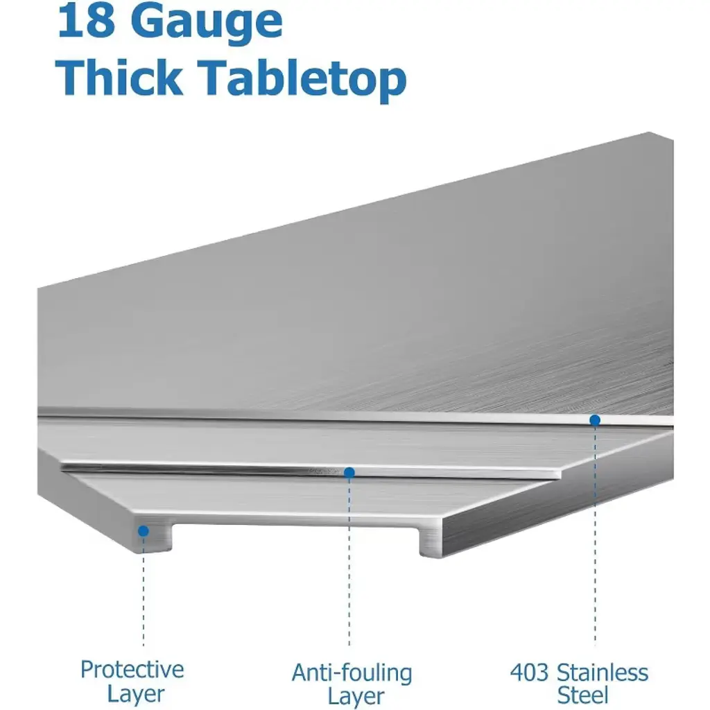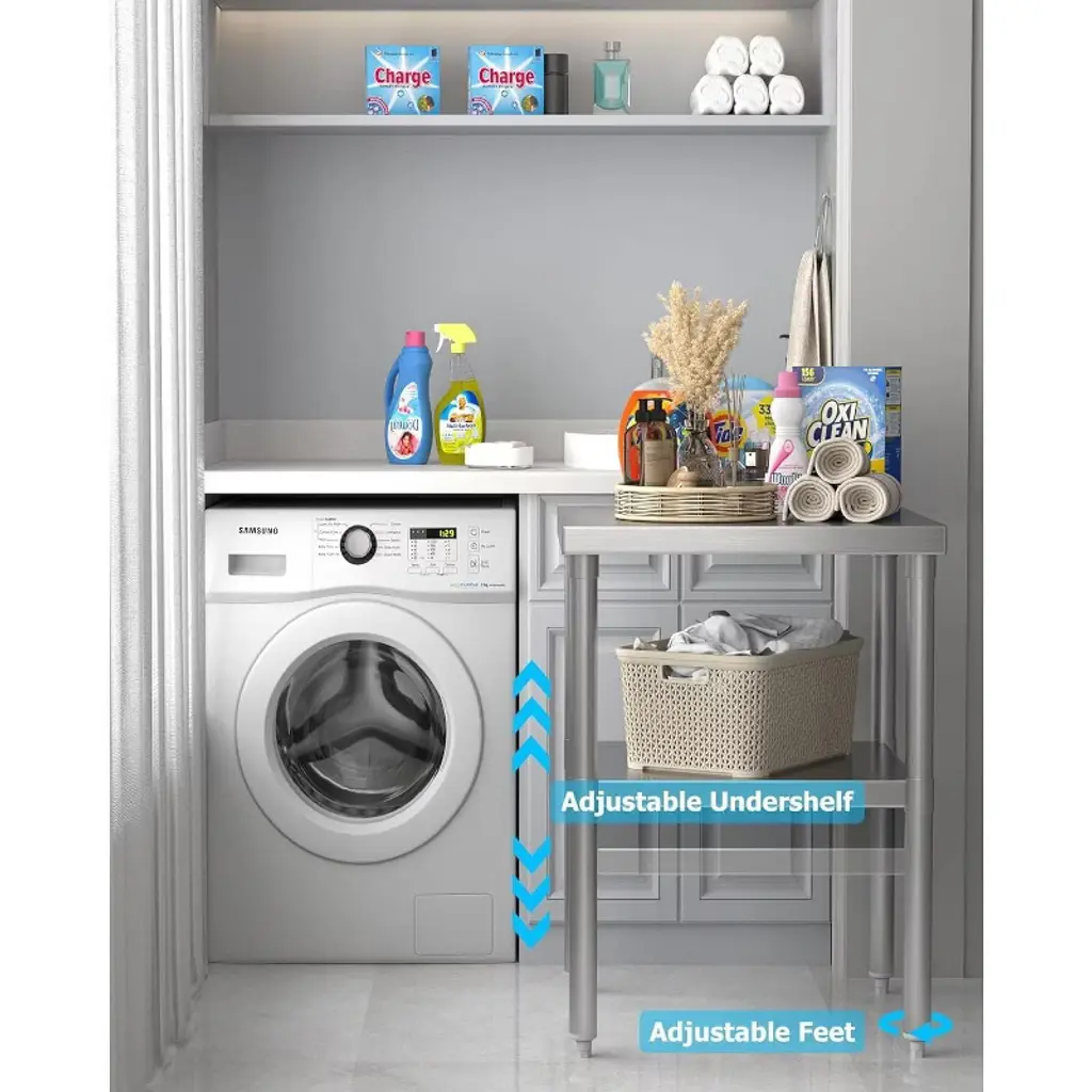 Effortless Maintenance & Setup: The smooth stainless steel surfaces ensure easy cleaning, and the straightforward assembly process takes just 10 minutes for quick installation. Certified Hygiene Standards: NSF certification guarantees a sanitary and safe kitchen environment for food preparation on this durable 18-gauge 430 stainless steel work table. High Weight Endurance: Top shelf supports 240 lbs, undershelf can hold up to 130 lbs, maximizing storage space and countertop capacity. Multiple Application: just settle it in your kitchen, garage, workshop, bar, restaurant, laundry, school, hospital, warehouse or any other commercial setting, can be regarded as perfect repair or workbench Lasting Quality & Size: Constructed from durable 18-gauge 430 stainless steel