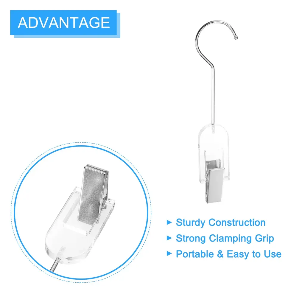 Description:Sturdy Construction - Our hanging clips are made of alloy and acrylic, with a smooth surface, not easy to rust, bend or break, and much stronger and more durable than plastic hanger clips.Strong Clamping Grip - The clothes hanger with a super-strong clamping force keep the hanging items securely hold to the hanger and not easy to fall off when shaken in the wind.Space-saving - The Hanging hook with the ability to hang items vertically or horizontally offers an effective space-saving solution. Helps to maximize storage areas by utilizing vertical spaces efficiently, turning unused areas into functional storage.Easy to Use - The portable hanging clip is designed for effortless installation, without punching. Hang it wherever you want, such as rods, pipes, shelves, or hangers. The hook angle can be rotated according to your needs.Multiple Applications - The single hanger clip is commonly used in the home, closet, bathroom, balcony, office, shop, and even outdoors. The hook can be utilized for hanging and organizing various items, including clothing, pants, jeans, socks, scarves, hats, bags, towels, and more.Specification:Material: Alloy, AcrylicColor: SilverOverall Size: 205mm x 40mm x 11mm/8.07" x 1.57" x 0.43"(L*W*T)Clip Length: 60mm/2.36"Clip Open Width: 18mm/0.71"Package Content:2pcs x Hanging Clips