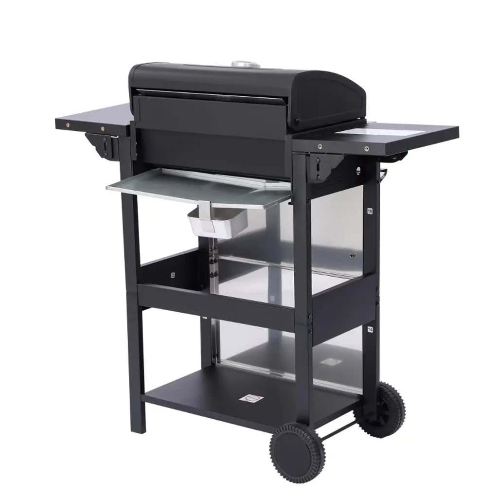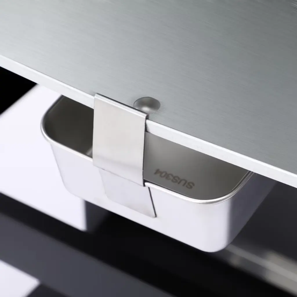 Side Table Steel, black powder coating, foldable, 10.2x13.8inch Hooks And Bottle Opener #430 SS bottle opener, 1pc, with 4pcs hooks front panel and hanging basket Stainless steel Hanging baskets: 17.3x3.15x1.6inch Firebox Firebox: Steel, with high-temp resistant(550C) powder coating wire enamel cooking grids: 1pc 11.8x13.2inch + 1pc 7.9x13.2inch