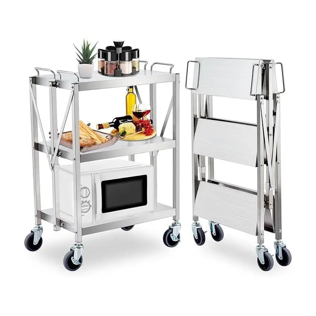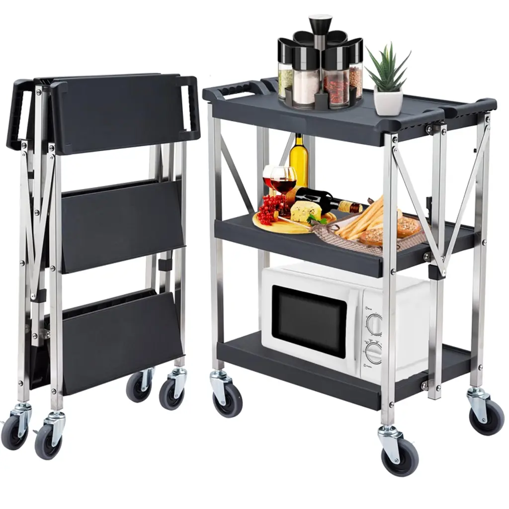3 Tier Portable Collapsible Service Cart, Foldable Rolling Utility Cart With 360¡ã Swivel Wheels, 2 Brakes, For Home Office Garage, Grey