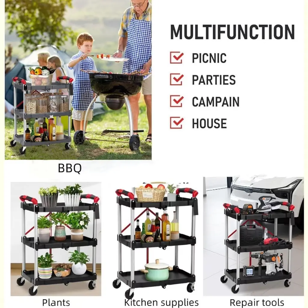 This 3 tier portable collapsible service cart is designed for flexible storage and effortless mobility in any environment. The three spacious levels provide organized space for tools, supplies, or equipment, while its foldable design allows for easy storage and portability. With 360¡ã rotating wheels and two secure brakes, this cart offers smooth movement and stable positioning, making it ideal for busy homes, offices, garages, or warehouses.