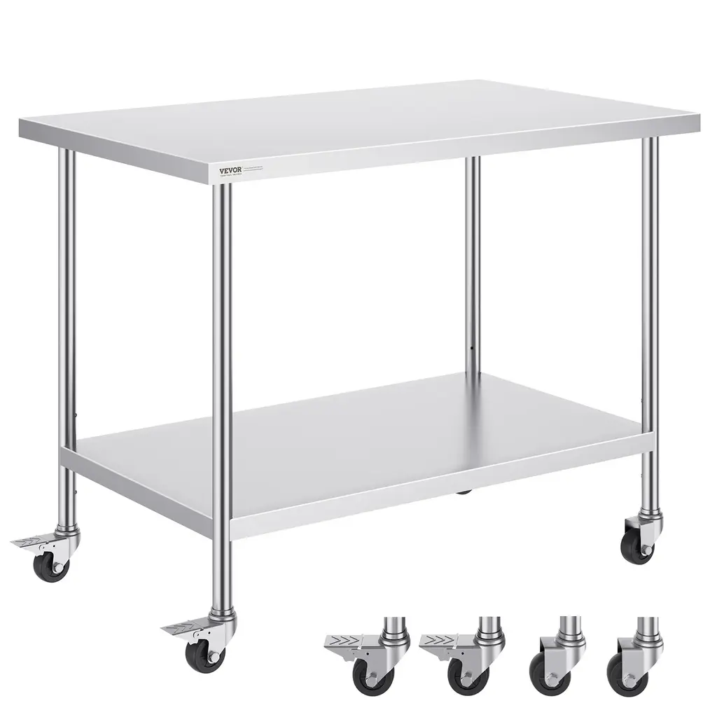 Heavy-duty stainless steel table: KUTLER's stainless steel prep table features an 18-gauge #430 SS table top. It offers a sturdy surface for streamlined food preparation in commercial kitchens, ensuring optimal workflow and productivity. Designed with straight edges and a smooth surface, it is easy to clean, and is corrosion and wear resistant. Dimensions: 48" Long x 30" Deep x 34-1/2" High.NSF Certified: Rest assured that KUTLER’s NSF certification guarantees a high sanitation and food safety standard, meeting the stringent commercial kitchen use requirements. NSF Model #: KT_12-WT3048-GB+4WAdjustable Under Shelf: Featuring an adjustable galvanized under shelf, these work and prep tables provide extra storage space for kitchen essentials. They can accommodate a variety of items, from kitchen utensils to ingredient bins, keeping them within easy reach for seamless workflow.Non-marring bullet feet and 4 caster wheels: Equipped with adjustable feet, adjusting up to 1" high, ensuring a stable and level working platform on uneven surfaces. A set of 4 caster wheels are also included. These wheels work on a variety of surfaces and feature two locking wheels for enhanced stability. The feet and wheels are non-marring, protecting floors from denting and scratching.Versatile stainless steel work tables: These stainless steel prep tables excel in versatility, extending beyond commercial kitchens to cater to various needs. These work tables adapt effortlessly to catering events, food trucks, laboratories, medical facilities, and industrial workshops. KUTLER's tables are versatile enough to be used at home, in the garage or laundry room. Transform your commercial kitchen with KUTLER’s stainless steel prep table. This heavy-duty table is constructed with an 18-gauge #430 SS table top ensuring durability and resilience. It is capable of withstanding rigorous daily use. The straight edges not only enhance the tables' aesthetic appeal but also contribute to a seamless, easy-to-clean surface that resists stains and corrosion, maintaining its pristine appearance even after prolonged use. This stainless steel table is NSF certified, guaranteeing a level of quality crucial for commercial kitchens, ensuring compliance with stringent food safety requirements. The adjustable galvanized under shelf optimizes storage, keeping essential tools and supplies within reach while maximizing organization. Height adjustable bullet feet enable stability on uneven surfaces, offering a level platform essential for the environment of any professional kitchen. The four caster wheels, 2 locking, work on a variety of surfaces and are non-marring. Versatile and reliable, this work table offers a practical, sturdy, and durable surface for a wide array of applications. It can be used in laboratories, hospitals, industrial workshops, and hospitality settings.Dimensions: 48" Long x 30" Deep x 34-1/2" High - Overall Wheel Size - 4" Diameter x 5-1/4" Wide x 7-3/4" High (this will raise the table by 5") NSF Model #: KT_12-WT3048-GB+4W Includes: Stainless Steel Table, Under Shelf, 4 Caster Wheels, Instructions, and Hardware for Assembly *** This product is designed and finished for use in a commercial environment. Therefore, surface imperfections such as scratches, scuffs and indents may be found. This is normal and to be expected on products of this nature. ***