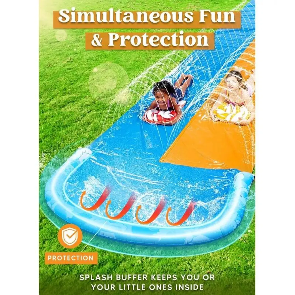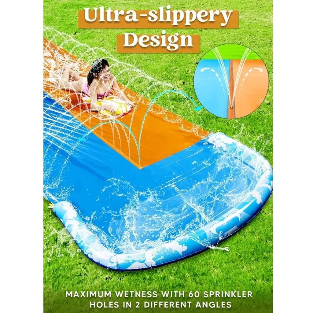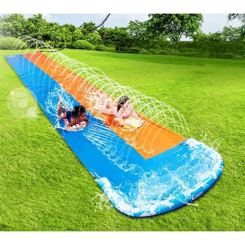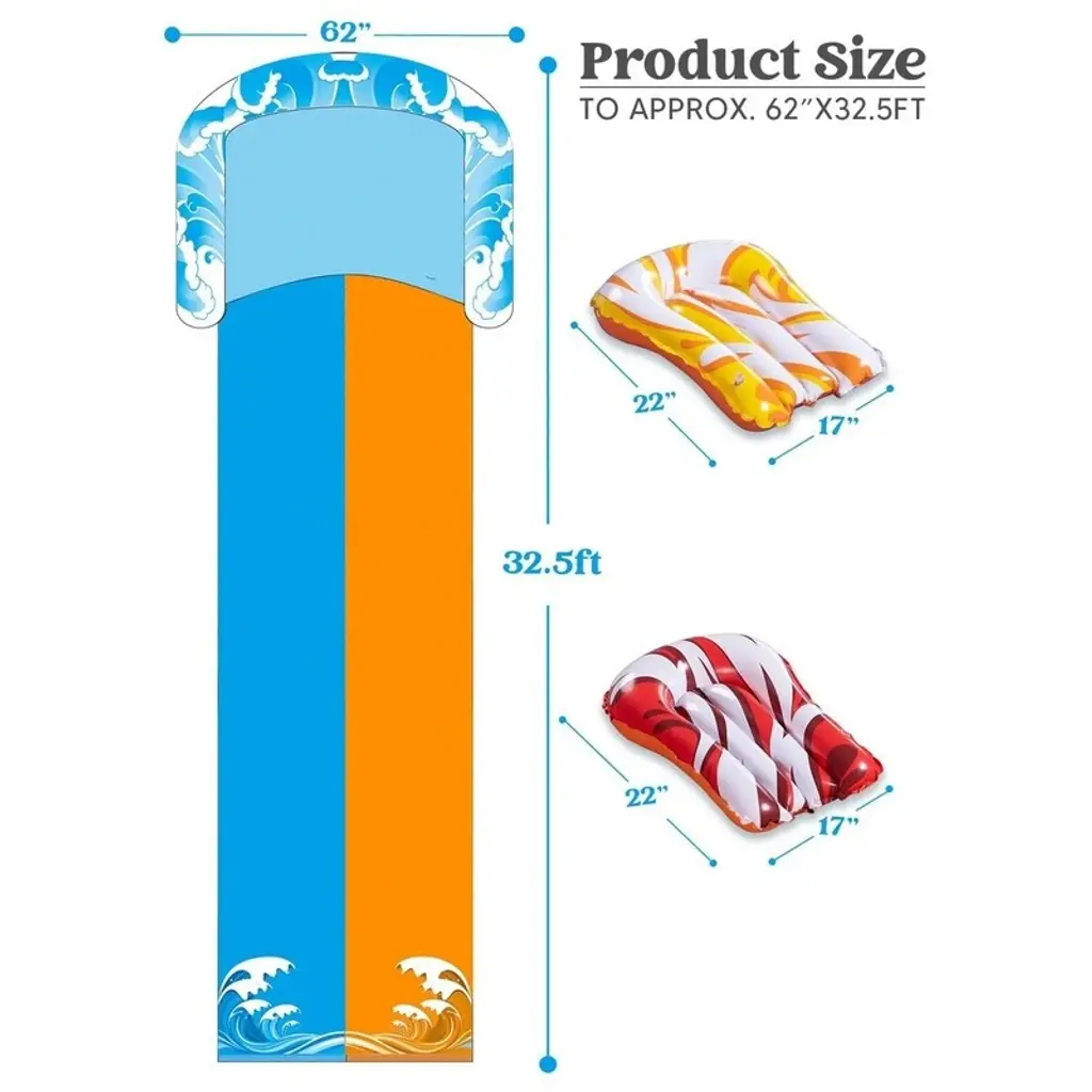 32.5ft Extra Long Water Slide with 2 Inflatable Boards, Heavy Duty Double Waterslide Slip with Sprinkler for Kids and Adults This inflatable water slide is the perfect choice for anyone looking to relax and enjoy the water. Whether you're lounging in a inflatable slide or floating on a pool slide, this inflatable lounger provides maximum comfort. The durable design ensures it lasts through many fun-filled days at the pool, beach, or lake. Ideal for those who love water slide for adults and need a reliable super slide, this float is spacious and easy to inflate. Great for pool parties, summer vacations, or simply soaking up the sun, it's an excellent addition to your slide collection.