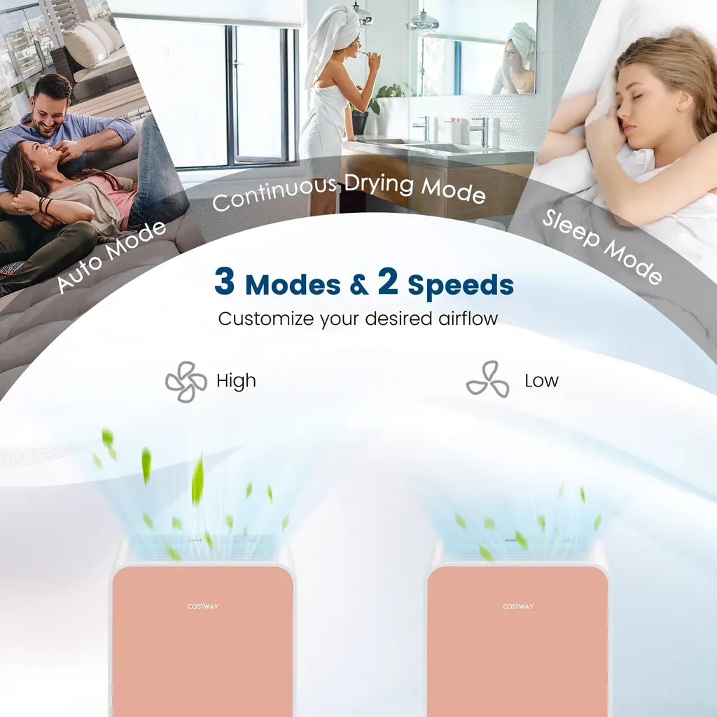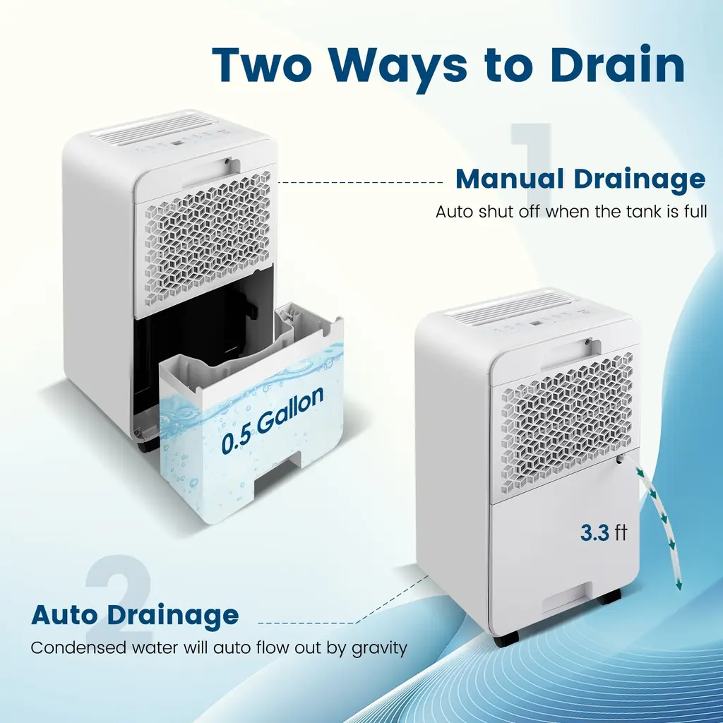 Specifications:Key Features:● High Dehumidification Capacity: This highly efficient dehumidifier removes up to 32 pints of moisture in 1 day at 95℉ and 90% RH with an adjustable humidity setting range from 30% to 80%. It brings you and your family a comfy and healthy environment with no more problems caused by high humidity, such as wet clothes, water condensation, damaged furniture, musty odors and more.● Easy Operation and Customizable Airflow: Through a control panel with LED display, users can switch fan speeds, modes as well as set the humidity settings, 24H timer and child safety lock. You are able to customize your desired airflow in 3 modes (auto, continuous drying, sleep) and 2 speeds (high, low).● Convenient Drainage and Maintenance: This dehumidifier offers two ways to drain: manual drainage and auto drainage. The 0.5 gallon water tank is removable for quick drainage, and the dehumidifier will auto shut off when the tank is full. In addition, the removable and washable filter is effortless to maintain and prolongs the service life.● Quiet Operation and Sleep Mode: Under the sleep mode, all lights automatically dim off and the fan speed is also automatically switched to low to reduce the operating noise less than 33dB, which allows you to enjoy undisturbed sleep. Besides, you can set the 24H timer according to your lifestyle.● Compact and Portable Design: This dehumidifier measuring 11" x 7.5" x 20" (L x W x H) is suitable for various rooms, such as living room, bedroom, bathroom and laundry room. The universal wheels and portable handle offer easy movement between rooms. Also, the vibrant color makes this dehumidifier a good-looking addition to your home.