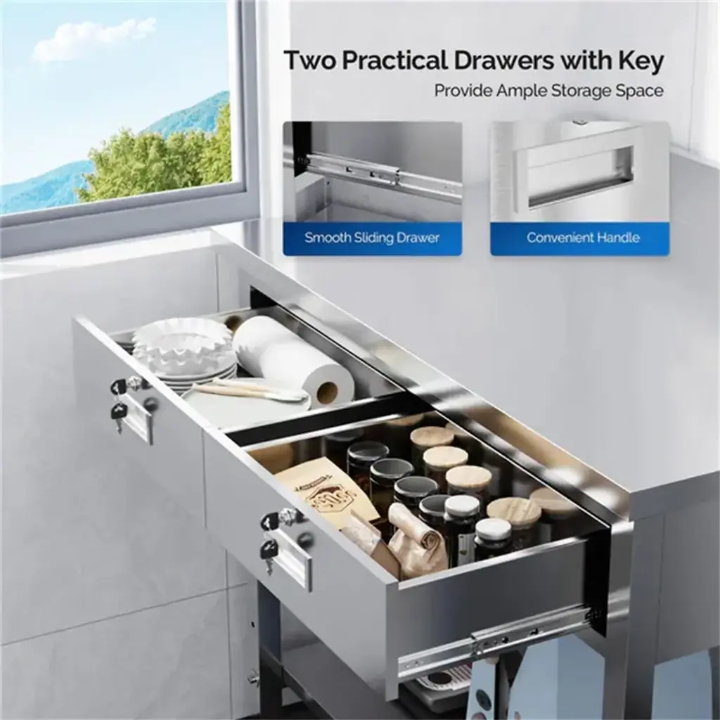 Features:1. Premium Stainless Steel: The commerical work table is made of durable stainless steel, which is excellent resistant to corrosion and rust, easy to clean & maintain.This ensures that the table can withstand daily use in busy environments2. Two Storage Drawers: Features with the two storage drawers can better organize your belongings.The drawers comes with smooth sliding rails,you can open and close smoothly without making a single sound.3. High Load Capacity: Undershelf providing you with more storage space, the table top load capacity: 330lbs; Undershelf load capacity: 110lbs. Offers you enough storage room to store microwave oven, kitchen utensils or any other tools.4. Easy Installation: Comes with detailed manual & all necessary accessories, you can assemble the work table easily and quickly. And the front and back of this stainless steel table are designed with rounded edges to offers maximum comfort when using.5. Multipurpose Use: The stainless steel table is suitable for a variety of home and commercial usage. It can be widely applied in kitchens, utility room, garage, repair store, restaurant, courtyard, laundry room, etc.