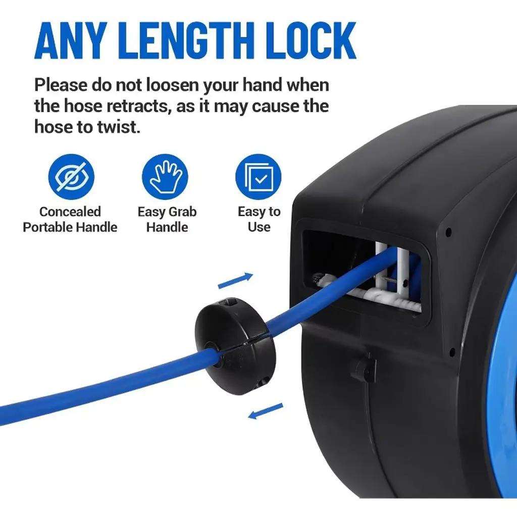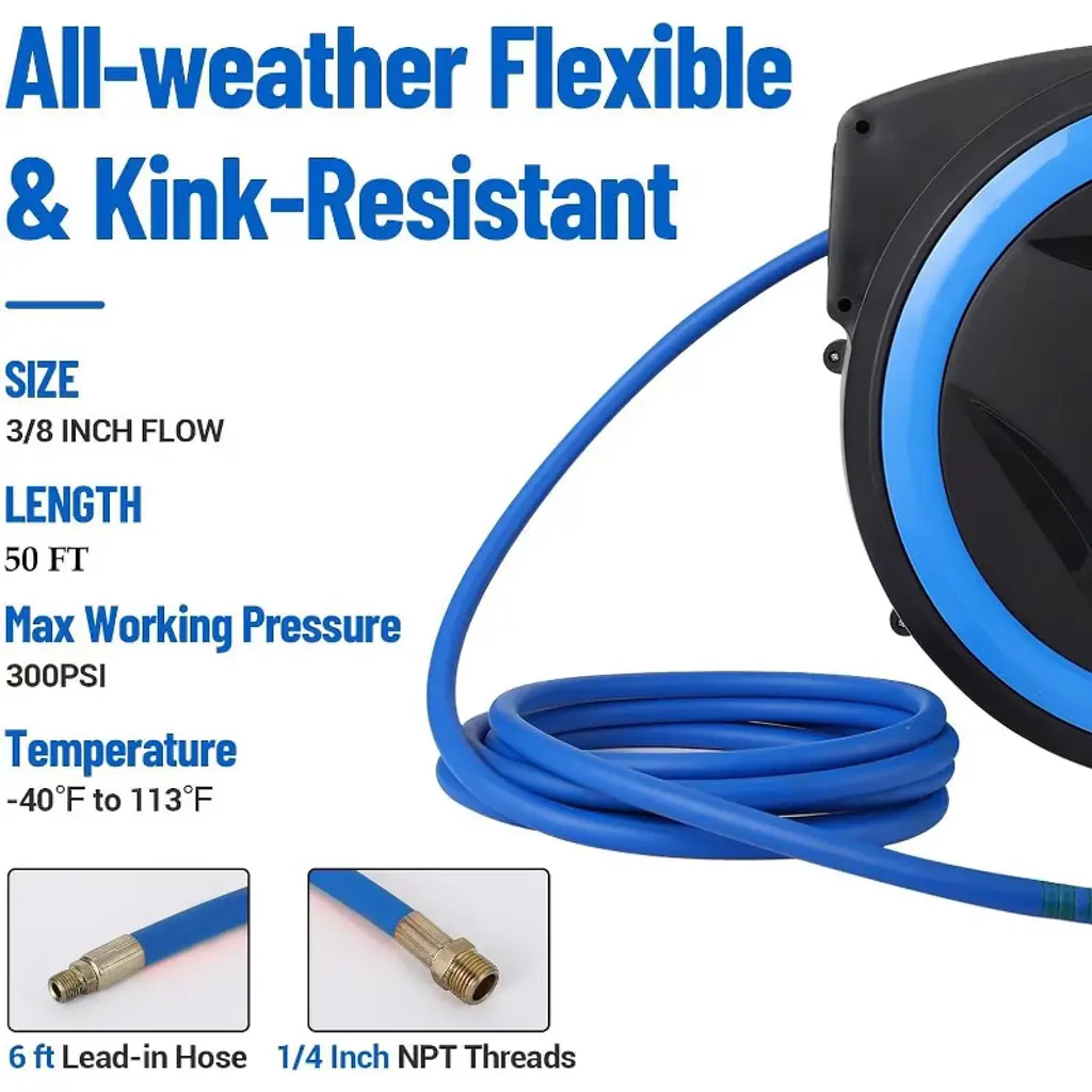Retractable Air Hose Reel – Durable & Efficient Workspace Solution Key Features Secure Locking: Tested auto-lock system for uninterrupted workflows. Zero-Tangle Retraction: Stainless spring ensures smooth coiling. Extreme Temperature Resistance: Hybrid hose for year-round reliability. Weatherproof Housing: IP54-rated against dust and water exposure. Full Rotation: 180° swivel for flexible tool access. Specifications Material: Fiber-Reinforced Polypropylene + Steel Components Hose Sizes: 50FT / 60FT / 80FT (3/8” diameter) Max Pressure: 300 PSI | Weight: 25.63 lbs Mounting: Wall or ceiling | Temperature Range: -40°F–150°F Usage Tips ✔️ Hose Care: Clear debris before retracting to prolong lifespan. ✔️ Pressure Limits: Do not exceed 300 PSI. ✔️ Cold Weather Use: Drain residual liquid to prevent freezing. Included Components Hose reel ×1 5FT reinforced connector ×1 Wall/ceiling bracket ×1 Anchors and bolts ×1 set Simplify your workspace—organize tools, reduce clutter, and enhance efficiency with dependable air hose management.