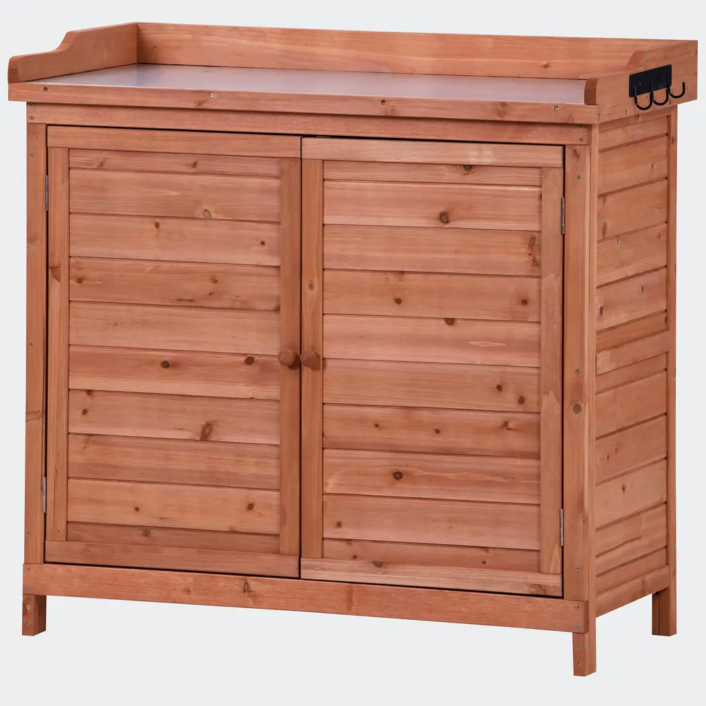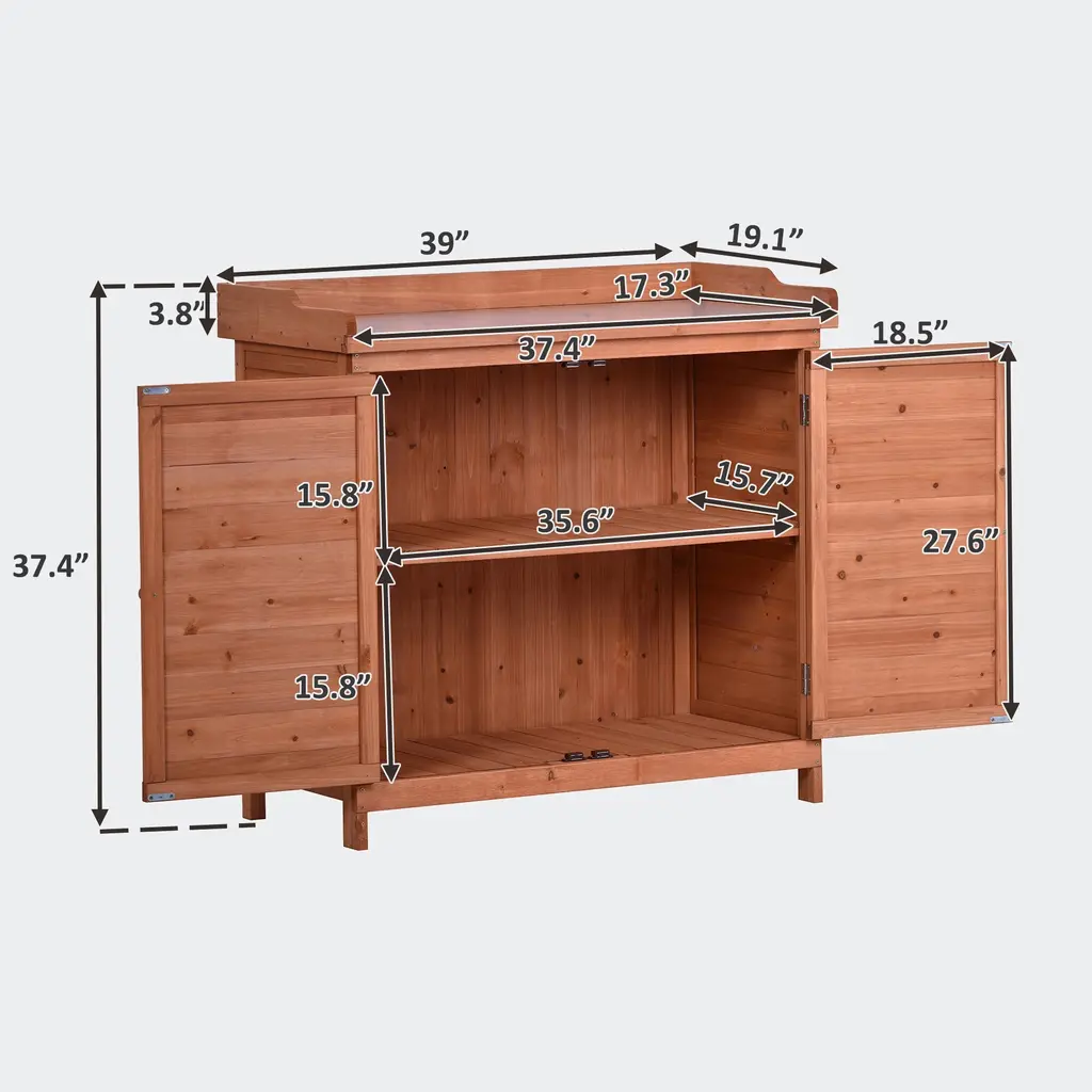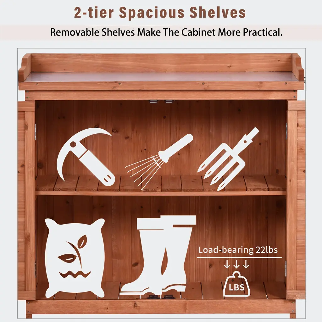Get ready for gardening season with our 39" Potting Bench Table! Made of premium fir wood, this potting bench is not only durable but also visually appealing. The galvanized tabletop is water-proof and easy to maintain, while the 2-tier storage cabinet and side hooks provide ample space to keep your gardening tools organized. With a stable structure, the tabletop can hold up to 44lbs and the cabinet shelves can hold up to 22lbs each. Assembling is easy with all tools included. Start your gardening journey with our Potting Bench Table today!Features:Dimensions:Notice: