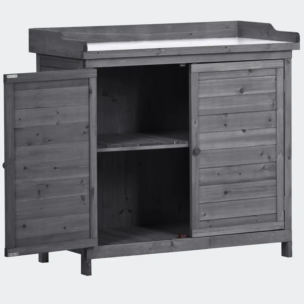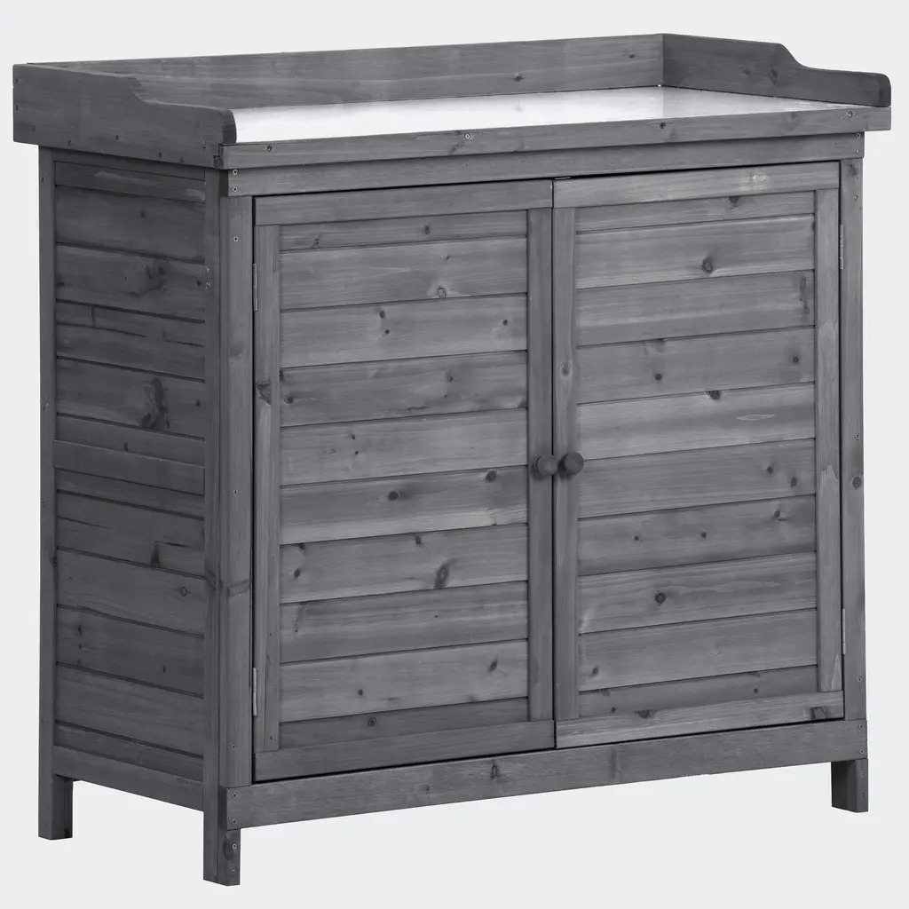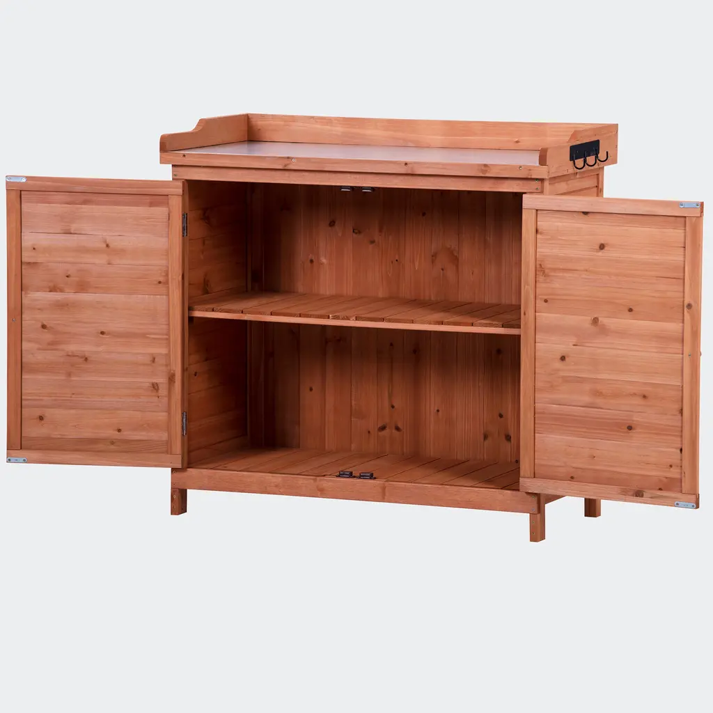 Get ready for gardening season with our 39" Potting Bench Table! Made of premium fir wood, this potting bench is not only durable but also visually appealing. The galvanized tabletop is water-proof and easy to maintain, while the 2-tier storage cabinet and side hooks provide ample space to keep your gardening tools organized. With a stable structure, the tabletop can hold up to 44lbs and the cabinet shelves can hold up to 22lbs each. Assembling is easy with all tools included. Start your gardening journey with our Potting Bench Table today!Features:Dimensions:Notice: