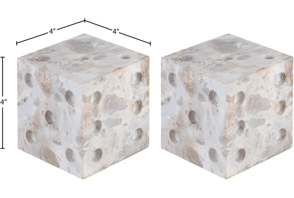 Enhance your modern decor with this 4" x 4" beige marble dice table decor. The neutral beige color and marble material make it a versatile piece that complements any room. Its unique novelty shape adds a playful touch to your home.