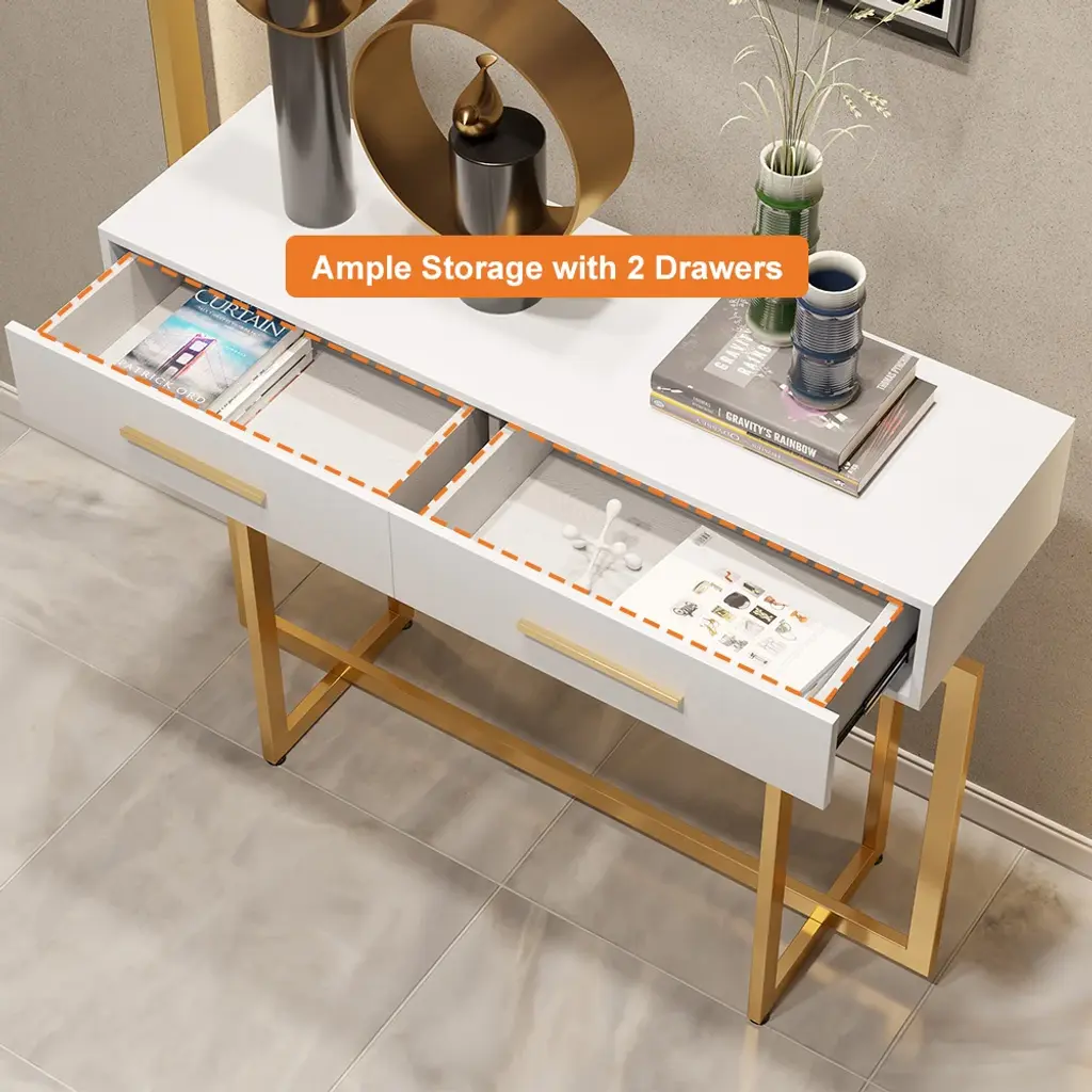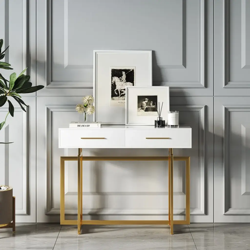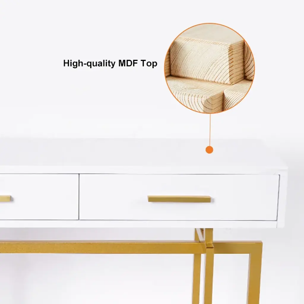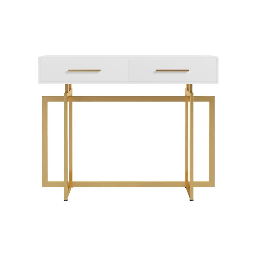 A stunning console table designed with a perfect balance of luxury and minimalism. Crafted with high-quality MDF wood and durable gold-toned metal, this rectangular console table boasts a sleek and elegant design that is sure to impress. The two spacious drawers feature a shiny gold bar pull, adding a touch of sophistication to the overall look. The elegant white beveled wood panels provide a stunning contrast to the luxurious gold leaf metal, creating a unique and eye-catching structural motif. With its sturdy gold medal frame and durable construction, this console table is built to last. Make a statement with this chic and versatile piece, perfect for showcasing your favorite decor or as a practical storage solution for your entryway essentials.