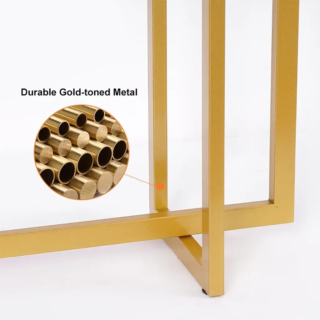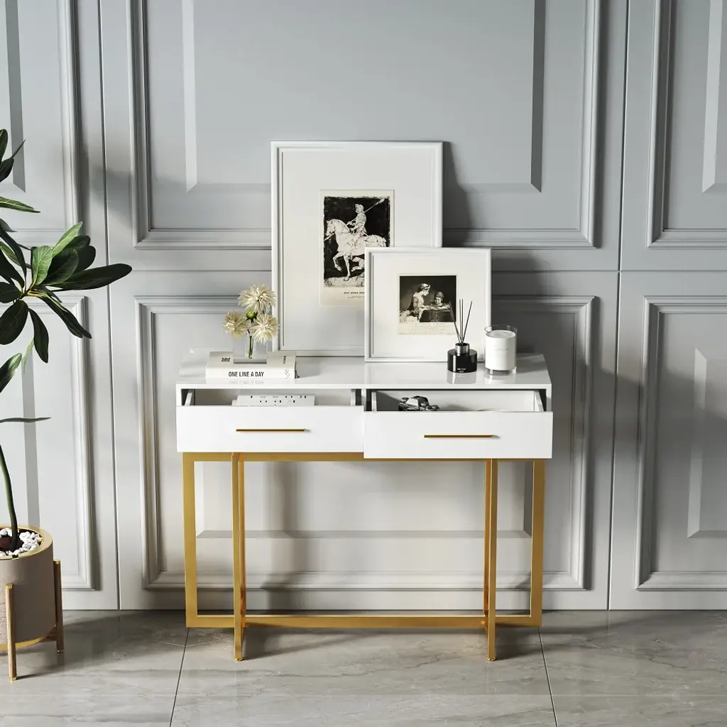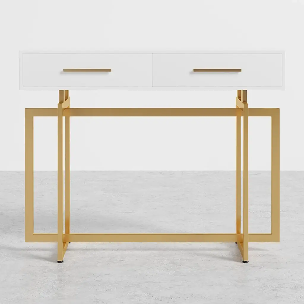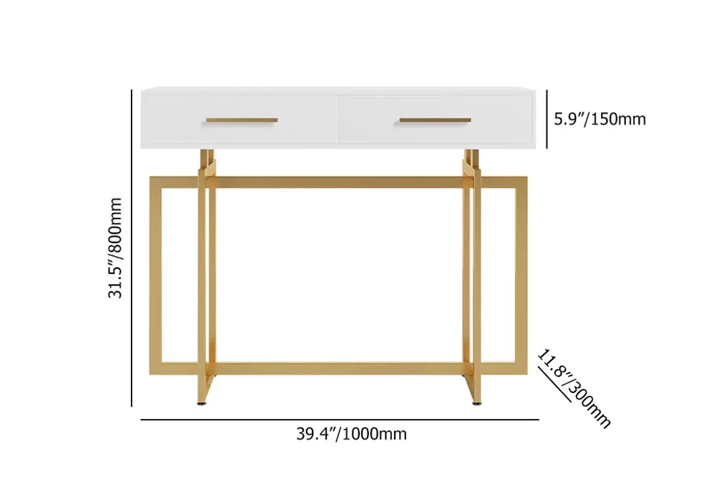 A stunning console table designed with a perfect balance of luxury and minimalism. Crafted with high-quality MDF wood and durable gold-toned metal, this rectangular console table boasts a sleek and elegant design that is sure to impress. The two spacious drawers feature a shiny gold bar pull, adding a touch of sophistication to the overall look. The elegant white beveled wood panels provide a stunning contrast to the luxurious gold leaf metal, creating a unique and eye-catching structural motif. With its sturdy gold medal frame and durable construction, this console table is built to last. Make a statement with this chic and versatile piece, perfect for showcasing your favorite decor or as a practical storage solution for your entryway essentials.