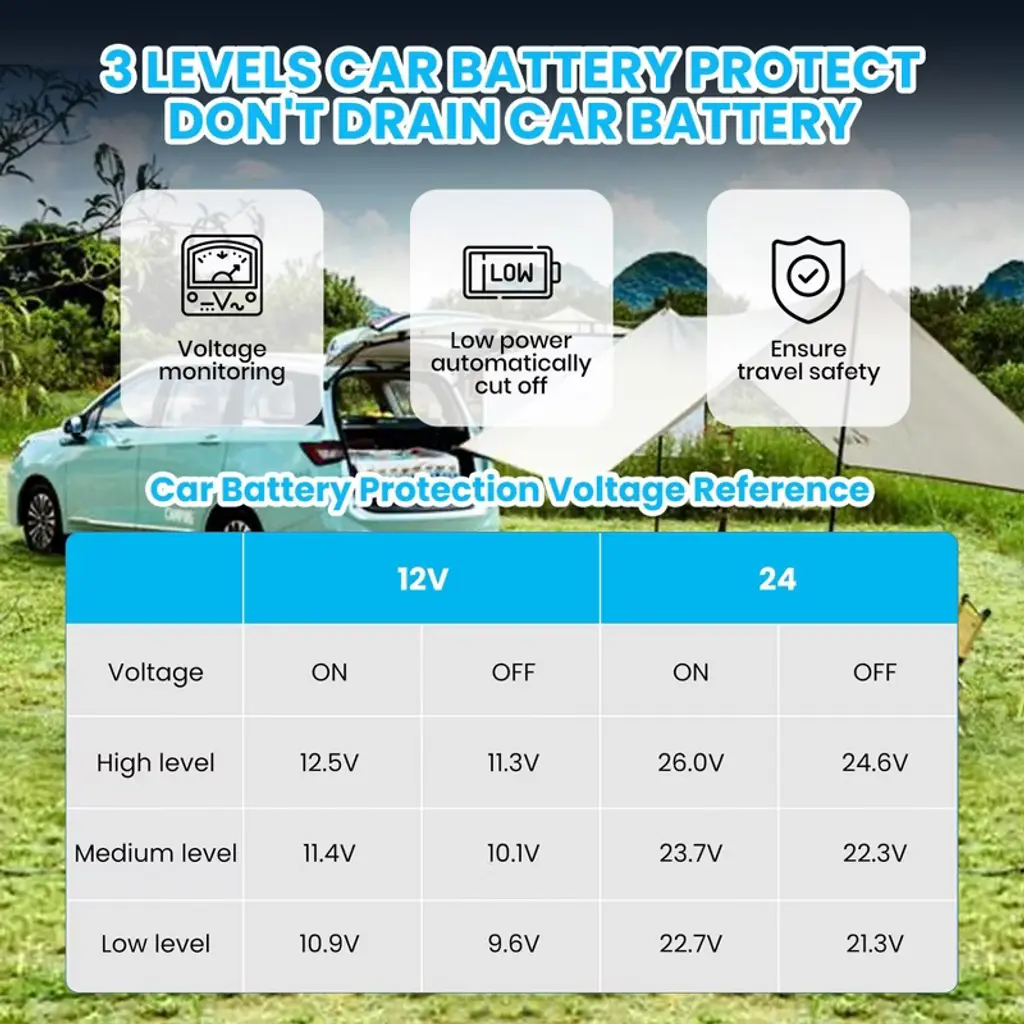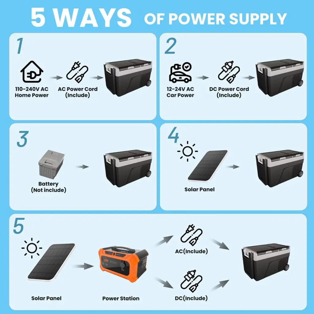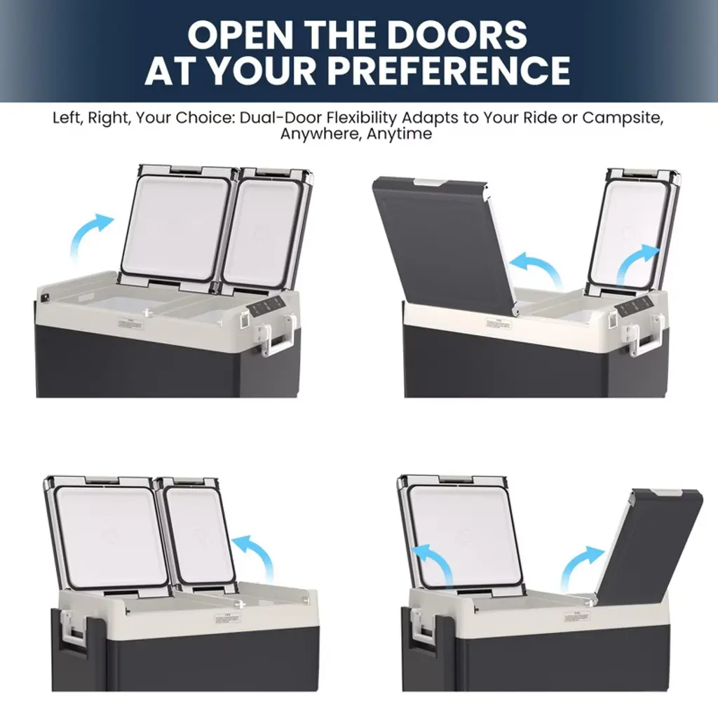 This Portable Car Fridge Freezer features dual-zone temperature control (-4℉~68℉) with smart app management, 4 power options, and adventure-ready design. Perfect for road trips and camping, it includes wheels, battery protection, and convenient accessories. Key Features: ✔ Smart Dual-Zone Cooling - Independently adjustable fridge/freezer via companion app ✔ Multi-Power Solution - Works on AC/DC/battery/solar (battery sold separately) ✔ Battery Protection - 3-level voltage safeguard (H/M/L) with Eco Mode ✔ Travel-Friendly Design - Wheels, fold-out table, USB ports, bottle opener ✔ Convenient Extras - LED light, drain hole, reversible doors, <45dB quiet
