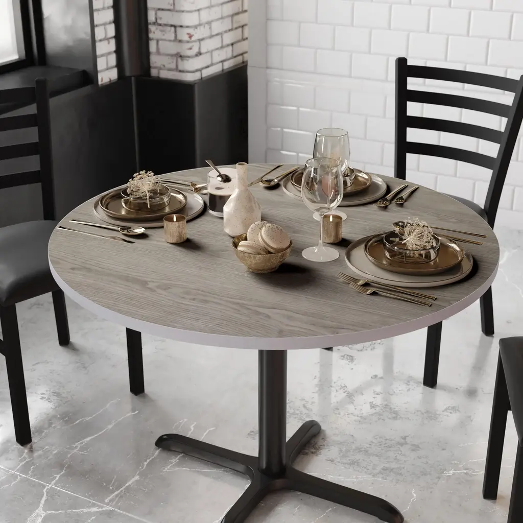 Complete your restaurant, break room or cafeteria with this reversible table top.The reversible laminate top features two different laminate finishes. Choose your color of choice and bolt to the compatible sized base. Surface is heat, scratch and moisture resistant. Use a mild detergent and water, dry clean to keep your tables spotless.This table top is designed for commercial use so you will be assured it will withstand the daily rigors in the hospitality industry.