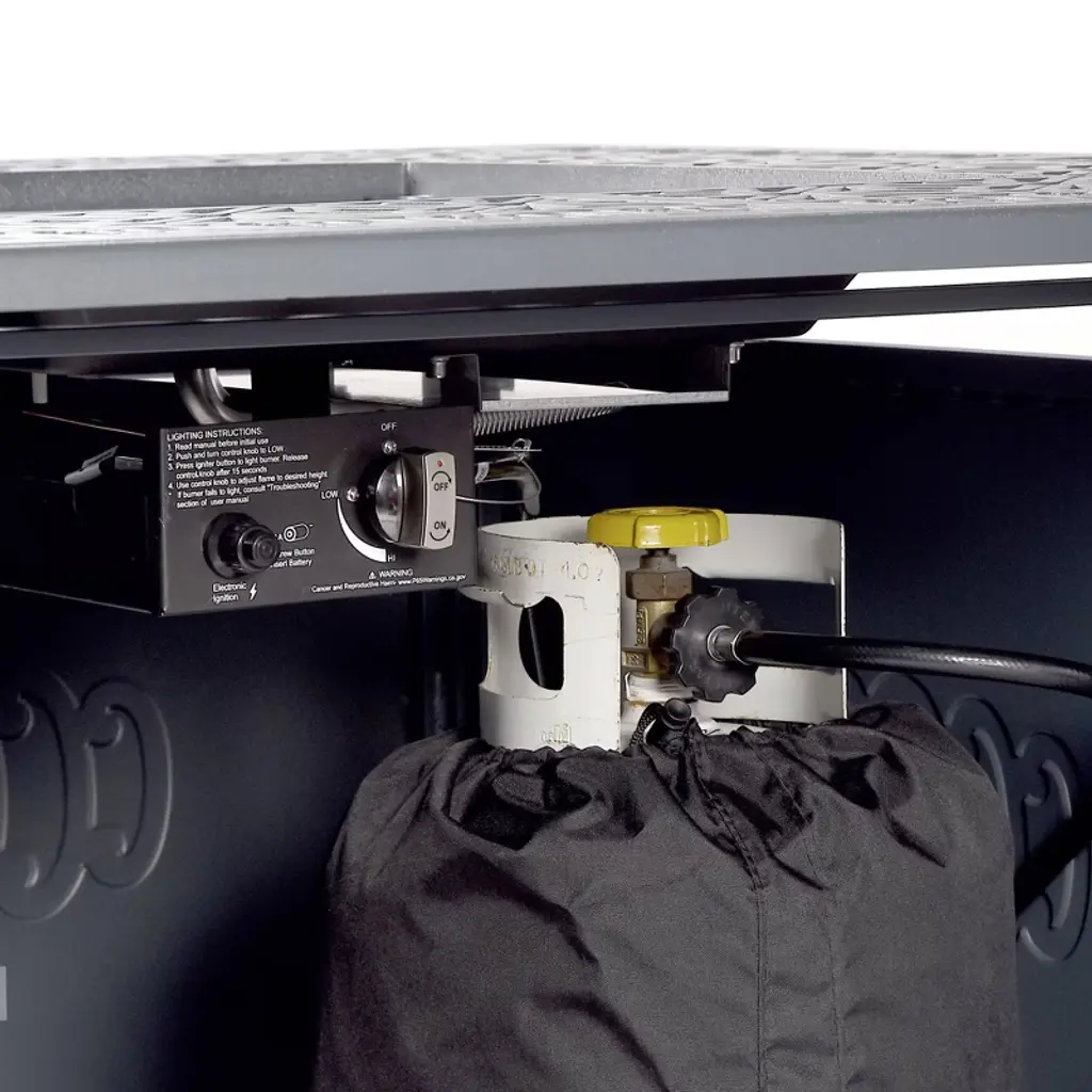 Bring the warmth and ambiance of this Square 42 in. x 42 in. Aluminum Propane Fire Pit Table with Glass Beads, Two Covers, Lid, 55,000 BTUs in gray Finish to your patio, deck or backyard. Featuring a stylish clean durable powder coated finish, this fire pit is complete with a durable rust-free solid aluminum design base, making it an attractive centerpiece for your outdoor living space. Complete with a 55,000 BTU stainless steel burner and integrated ignition, you can enjoy all the ambiance of a classic fire without the mess or danger of tending ashes. All of the complicated electrical and gas control components are preassembled unlike other fire tables. This fire pit comes with clear fire glass, a table lid, propane tank cover and a protective table fabric cover. The dimensions for the propane fire pit table are: 42" L x 42" W x 24.5" H, 66.5 lbs