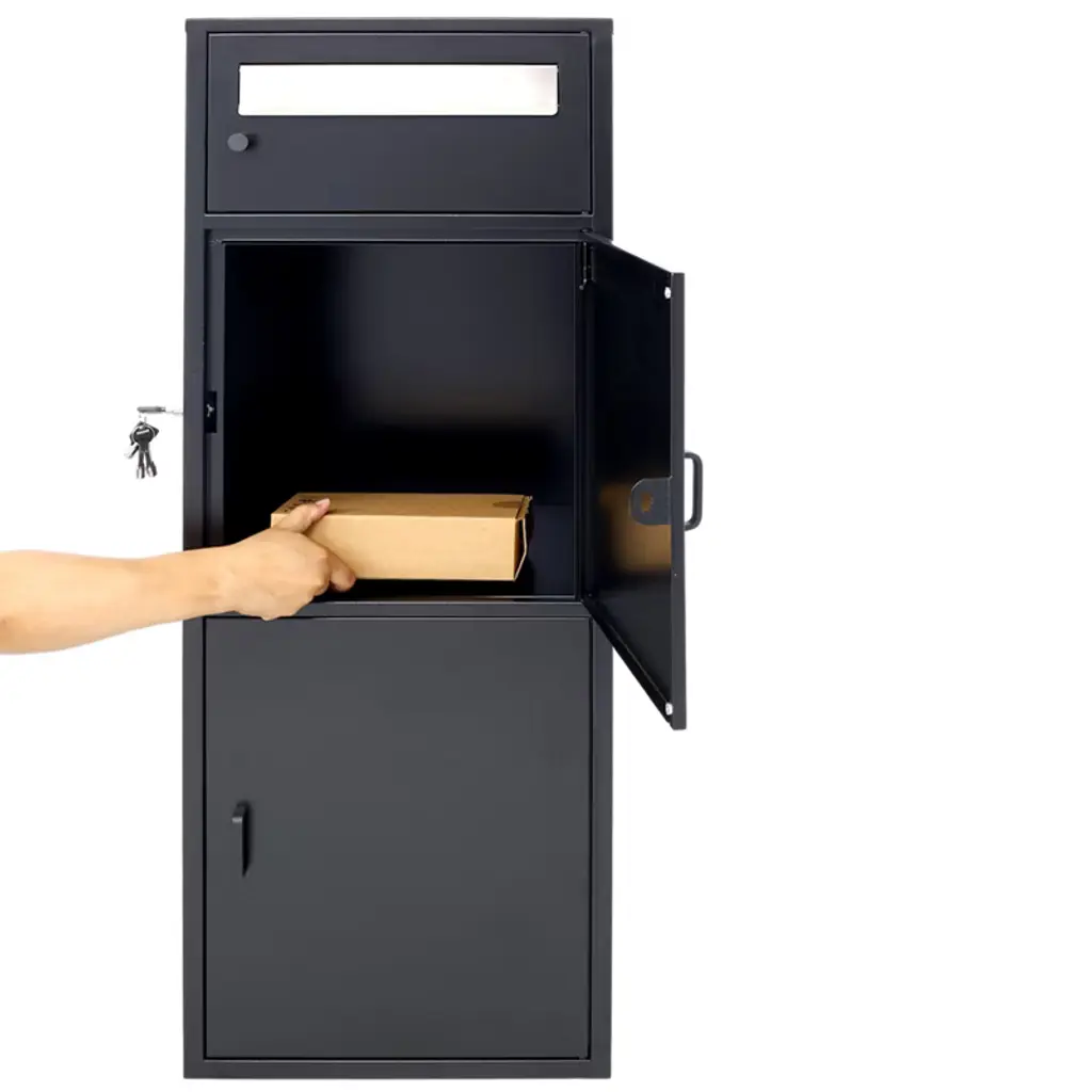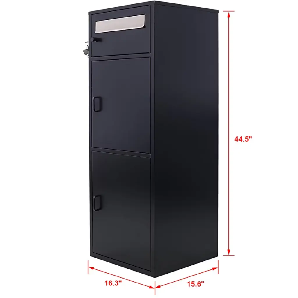 Secure your deliveries 24/7 with this fortress-like parcel drop box! Built with 0.8mm solid steel walls and a tamper-proof black powder coating, this 44.5" tall safe features a dual-access system: top slot for letters/envelopes + locked parcel doors with retractable shelves for bulky packages. Pre-drilled anchor holes and hardware included for permanent installation (withstands crowbar attacks!), while rust-resistant construction endures rain, snow, and UV exposure. Organize deliveries effortlessly and deter porch pirates—perfect for homes, offices, or high-theft areas.Key Innovations:SECURITY: 0.8mm steel walls (3x thicker than standard mailboxes) + reinforced locking mechanismSTORAGE: Retractable shelves hold 30+ lbs of parcels; separate slot for documentsKey FeaturesConstruction: 0.8mm solid steel body + anti-pry black coatingDimensions: 16.3" W x 15.6" D x 44.5" HLocking: Dual cam locks (2 keys included) + tamper-proof hingesStorage: Retractable alloy shelves + document slotInstallation: Pre-drilled anchor holes + bolts includedWeatherproof: Rust/corrosion-resistant; IP54-rated against rain1-HOUR INSTALL: Anchor bolts embed into concrete/wood—thieves can’t pry it looseALL-WEATHER ARMOR: Corrosion-proof coating withstands salt, humidity, and iceINCLUDED KEYS + HARDWARE: Fully equipped out-of-the-boxKey Features
