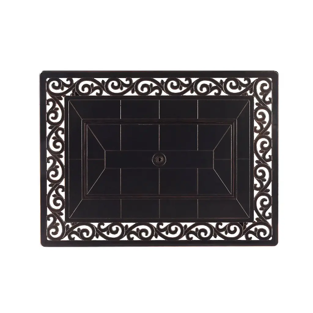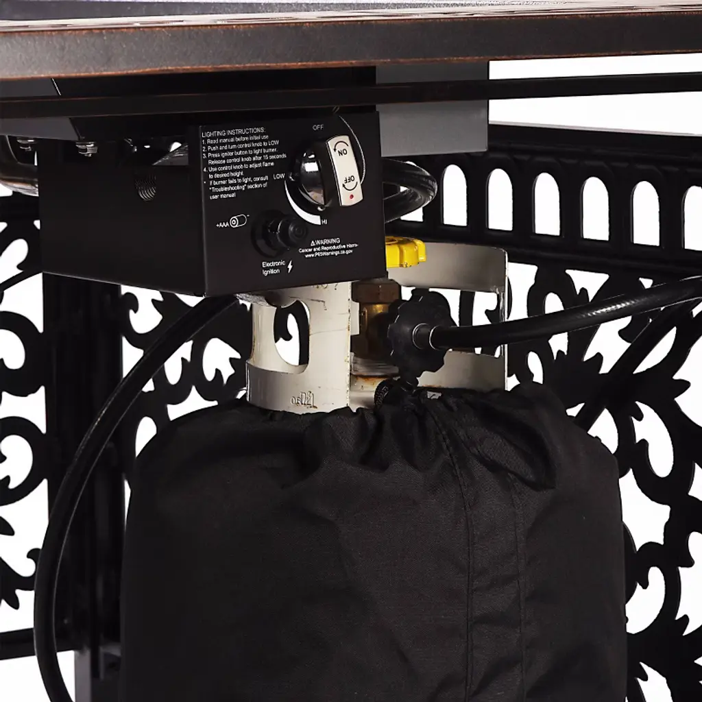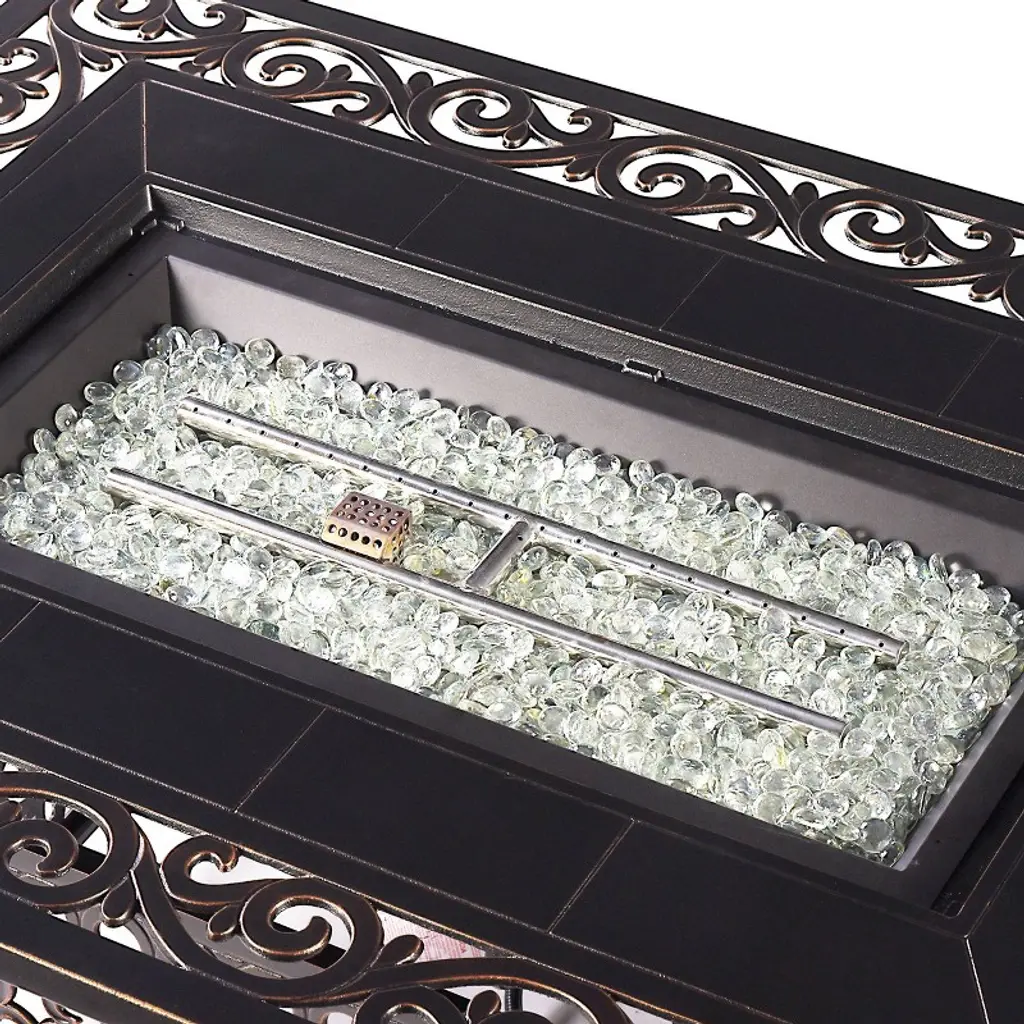 Elevate your outdoor space with the Rectangular 48-Inch Aluminum Black Fire Table, a perfect addition to your patio, deck, or backyard. This stylish and functional fire table combines elegance and warmth, providing an inviting focal point for your outdoor living area.Key Features:Stylish Design: The fire table boasts a clean and modern design with a black aluminum antique copper finish. Its sleek appearance adds a touch of sophistication to any outdoor setting, making it an attractive centerpiece.Durable Construction: Crafted from solid aluminum, this fire table is built to withstand the elements and provide years of reliable use. The durable materials ensure it won't rust or corrode, even in outdoor environments.Powerful Heat: Enjoy the warmth and ambiance of a classic fire with the 57,000 BTU stainless steel burner. The integrated ignition system makes it easy to start a fire, allowing you to create a cozy atmosphere without the hassle of tending to ashes.Safety and Convenience: This fire table comes with clear fire glass, which not only enhances the visual appeal but also ensures safety by preventing embers from escaping. It also includes a table lid to cover the fire pit when not in use, a propane tank cover for a clean look, and a protective table fabric cover to shield it from the elements.Generous Size: With dimensions of 48 inches in length, 36 inches in width, and 24.5 inches in height, this fire table offers ample space for you and your guests to gather around and enjoy the flames.Transform your outdoor living space into a cozy and inviting haven with the Rectangular 48-Inch Aluminum Black Fire Table. Whether you're hosting a gathering or simply relaxing outdoors, this fire table will provide warmth, ambiance, and style to your outdoor entertainment area. Enjoy the beauty of a flickering fire without the mess, and make memorable moments with friends and family around this elegant fire table. Upgrade your outdoor experience today with this stunning addition.