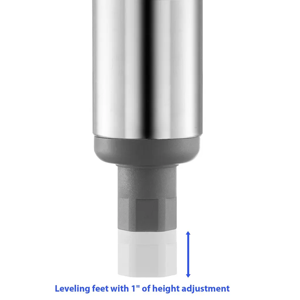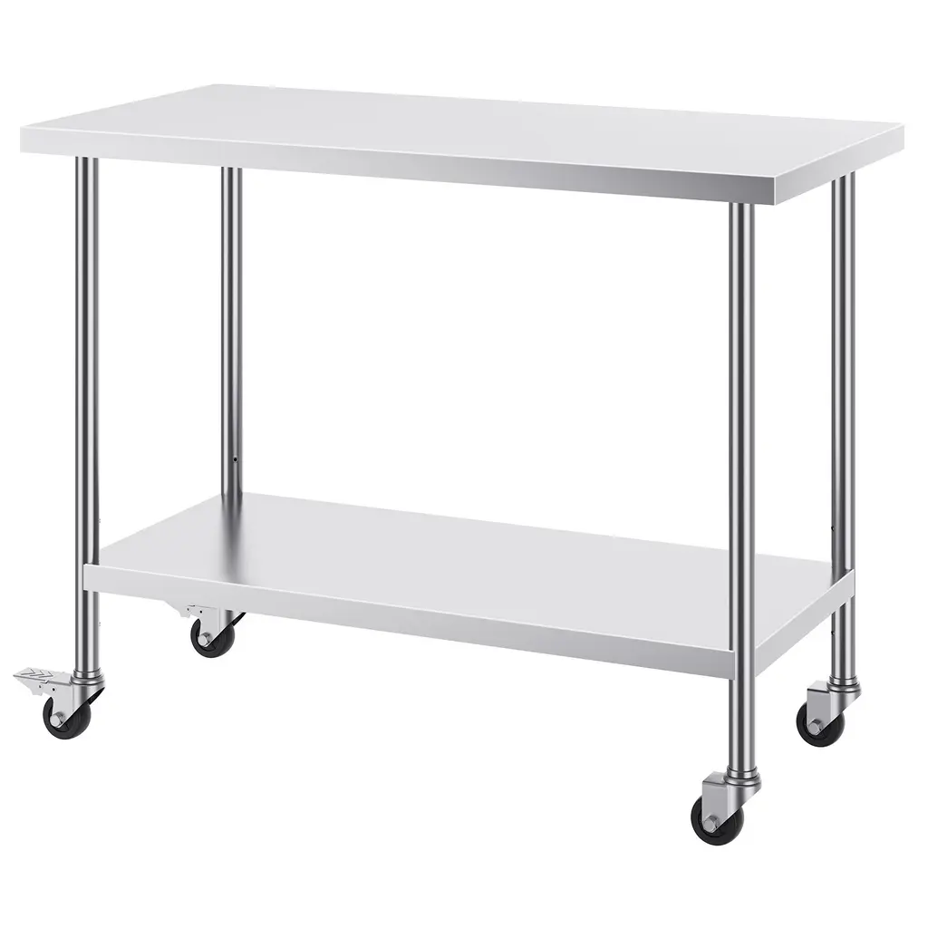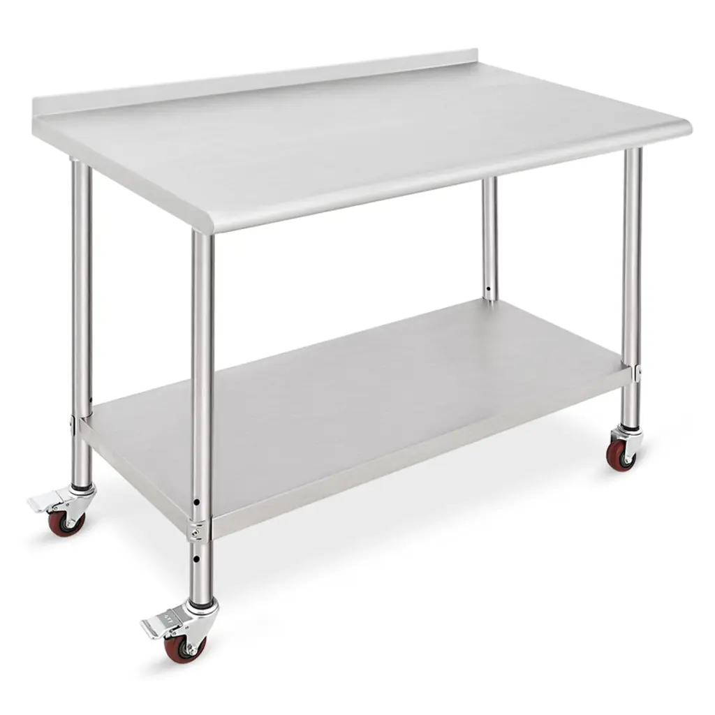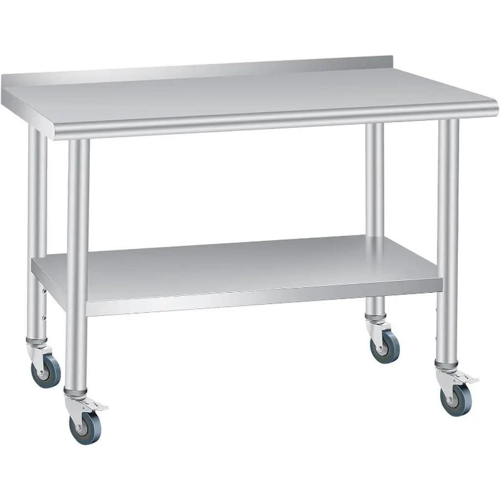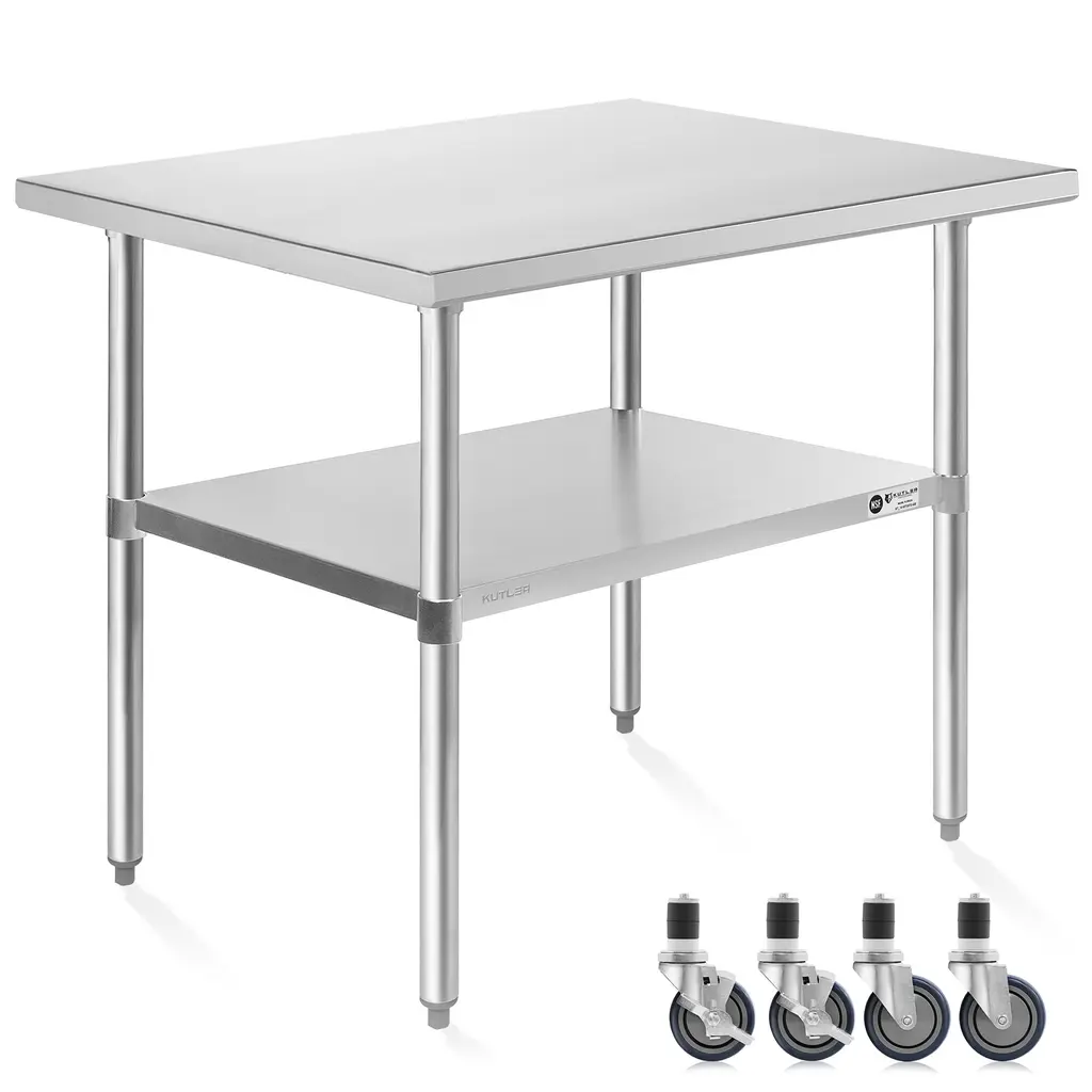 Heavy-duty work table: GRIDMANN's stainless steel table features an 18-gauge #430 SS table top and measures 48" Long x 24" Deep x 34-1/2" High. This prep and work table is ideal for use in commercial and industrial applications.NSF Certified: Designed to meet the highest regulatory requirements for safety and durability in commercial kitchens. NSF Model #: GR06-WT2448E+CT4WAdjustable height under-shelf: Durable and adjustable, the heavy-duty galvanized steel under-shelf on this prep table can support additional equipment, pots and pans, and supplies.Versatile design: The front and back of this stainless steel workbench are designed with rounded edges to maximize working comfort. This table can be used in restaurants, hotels, or at home in the kitchen or garage.Adjustable height, non-marring feet and 4 caster wheels: Adjustable bullet feet keep the stainless steel table sturdily in place, while protecting floors from denting and scratching. The feet adjust up to 1" to eliminate table wobble. A set of 4, non-marring caster wheels are also included. These wheels work on almost any surface and two of the wheels lock down to keep your table in place. This heavy-duty table by GRIDMANN is constructed from 18-gauge #430 stainless steel, and is the perfect work surface for use in a kitchen, bar, restaurant, laundry, school, hospital, or any other commercial setting. It is NSF certified to meet strict standards for public health protection and built for high-volume use to last a lifetime. This stainless steel table features an extra heavy-duty top, an adjustable-height galvanized under-shelf, and galvanized legs with adjustable non-marring feet that eliminate table wobble on uneven floors. The edges on the front and back of the tabletop are rounded for working comfort. This table also includes four caster wheels designed for Gridmann stainless kitchen prep tables but will fit any legs with a 1-1/2" diameter opening. The composite 4 inch wheel is chemical resistant and built for use in the commercial kitchen environment. Each wheel is rolls smoothly and they easily pivot on a full set of ball bearings. The wheels are non-marring and work on almost any solid surface. Two of the wheels include brakes that can be locked down to keep your table in place. Some assembly required. Dimensions: 48" Long x 24" Wide x 34-1/2" High Overall wheel size - 7-3/4" tall (this will raise the table by 5 inches), 5-1/4" wide , and the wheel is 4" in diameter Includes: GRIDMANN Stainless Steel Worktable with Under-Shelf, Instructions, and Hardware for Assembly. ***This product is designed and finished for use in a commercial environment. Therefore surface imperfections such as scratches, scuffs and indents may be found. This is normal and to be expected on products of this nature*** NSF: GR06-WT2448E+CT4W